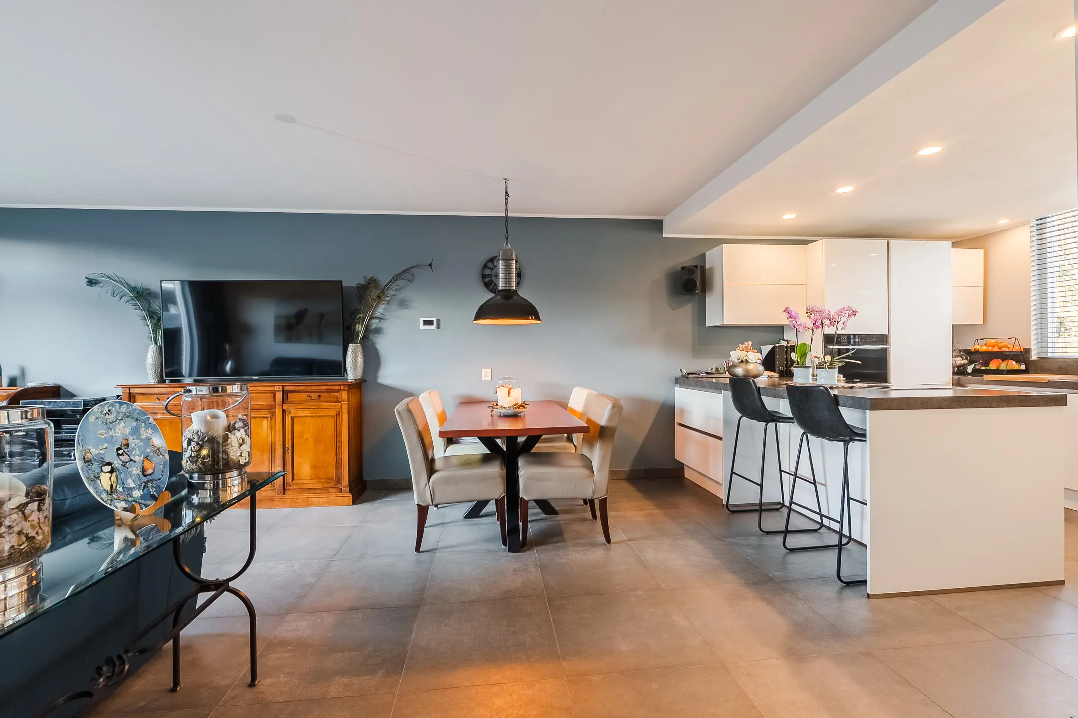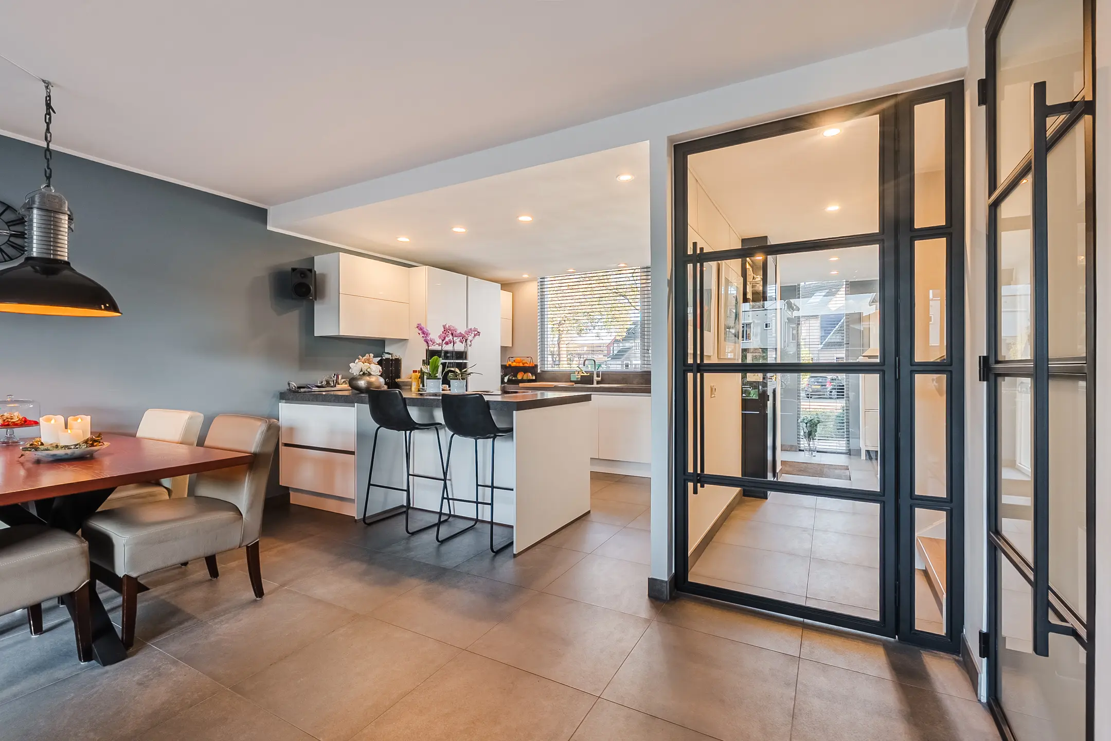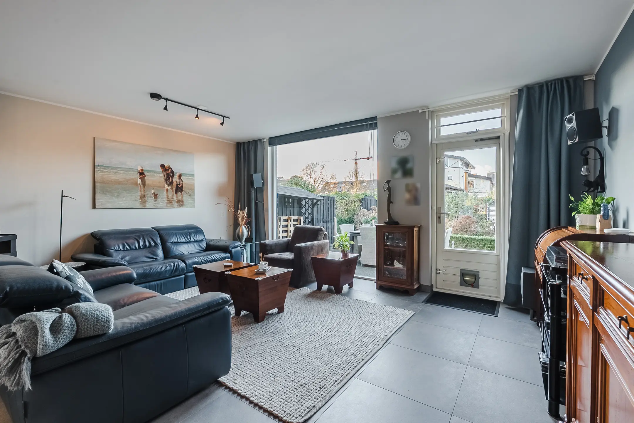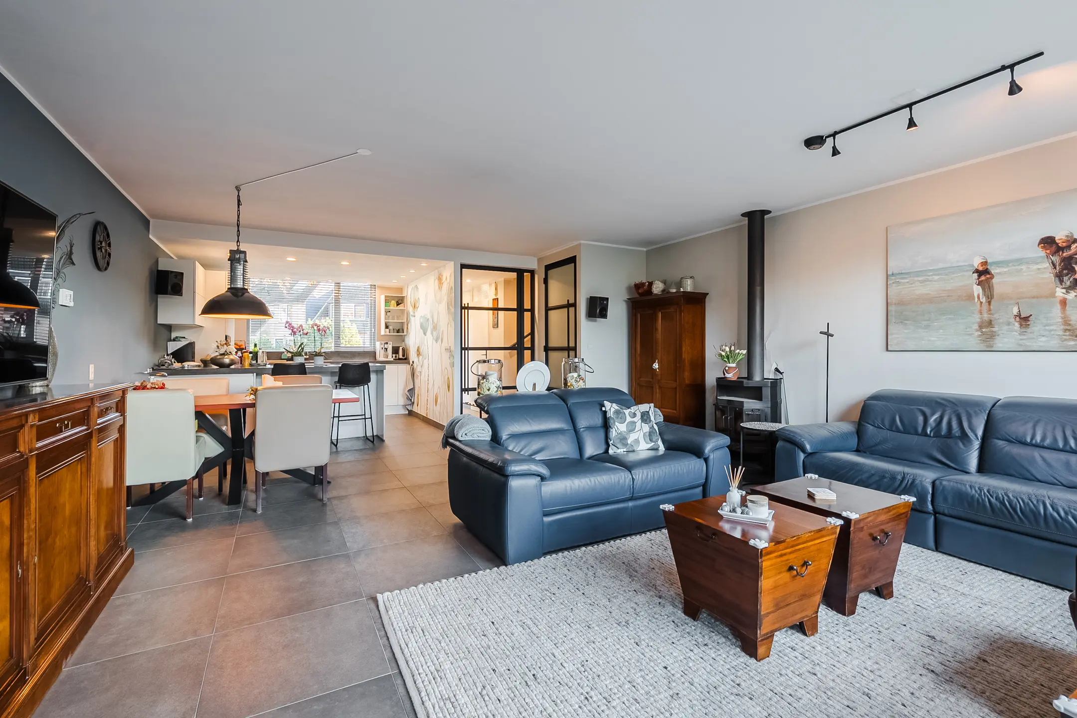 Samen met de halfopen keuken vormt deze ruimte van circa 45 m² het hart van het huis: gezellig, open en uitnodigend.