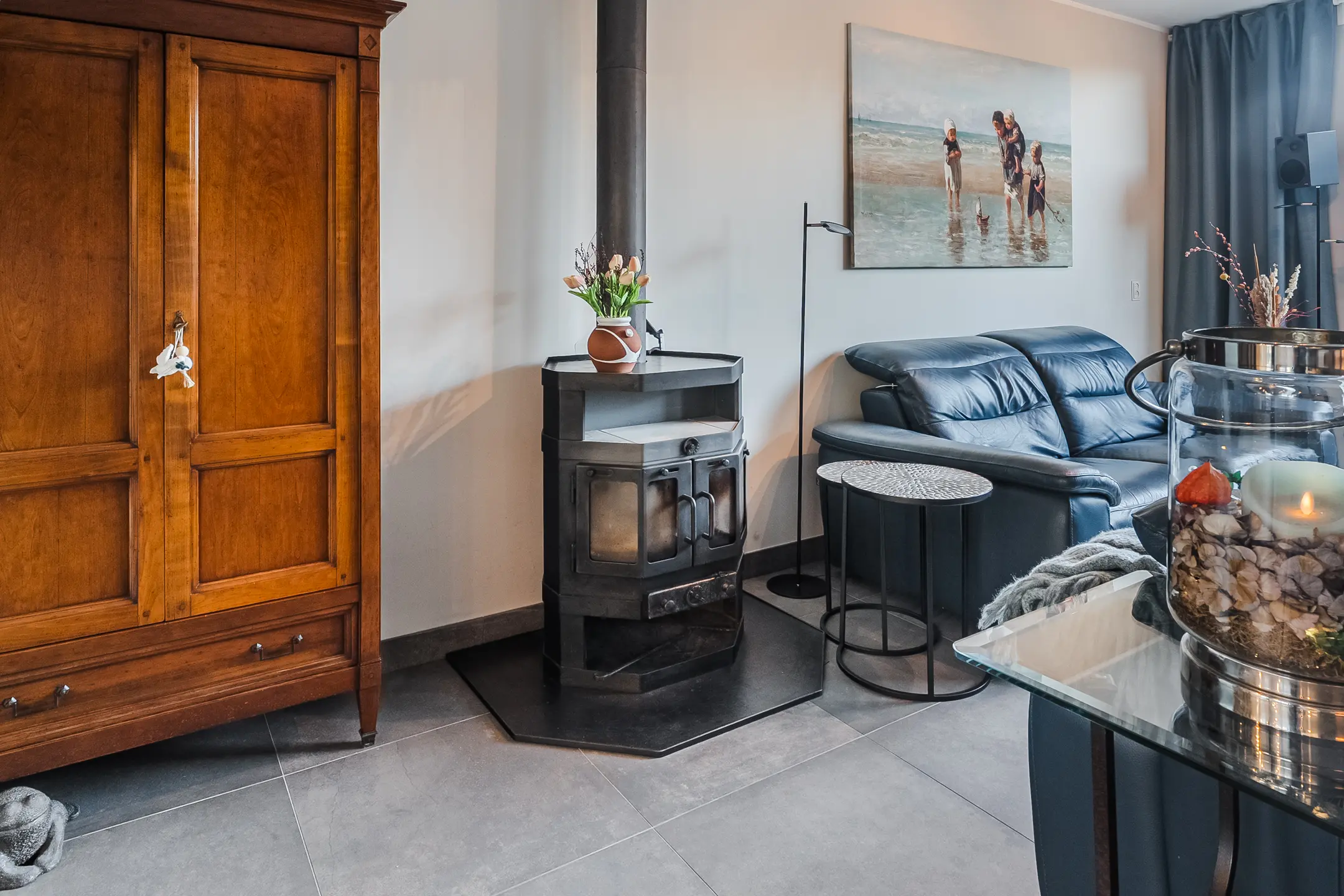 • Tuingerichte woonkamer met houtkachel en veel lichtinval.
