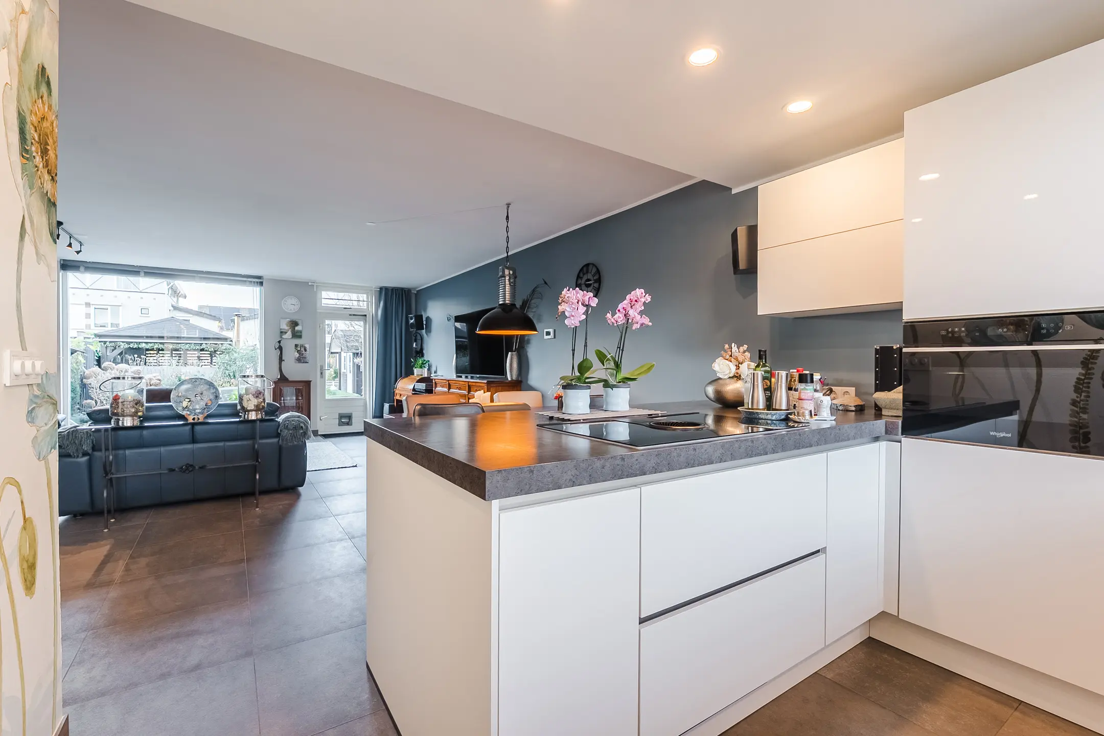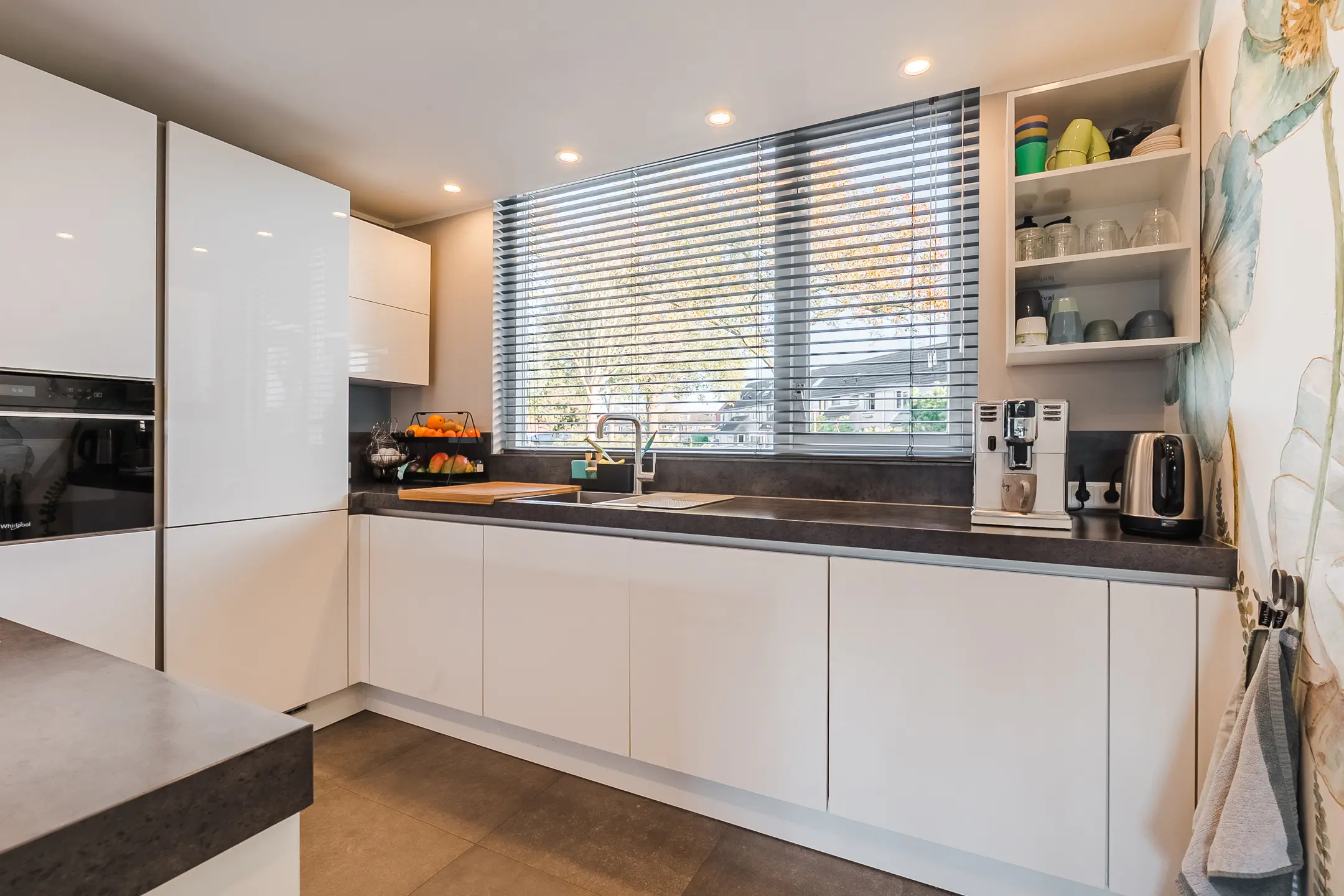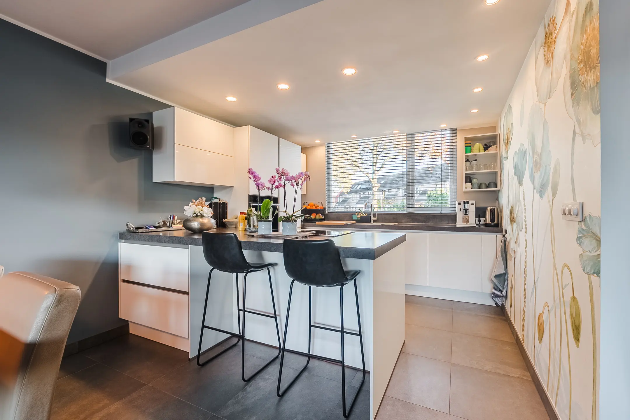 • Halfopen keuken in U-opstelling, sfeervol en functioneel, met veel opbergruimte en daglicht.