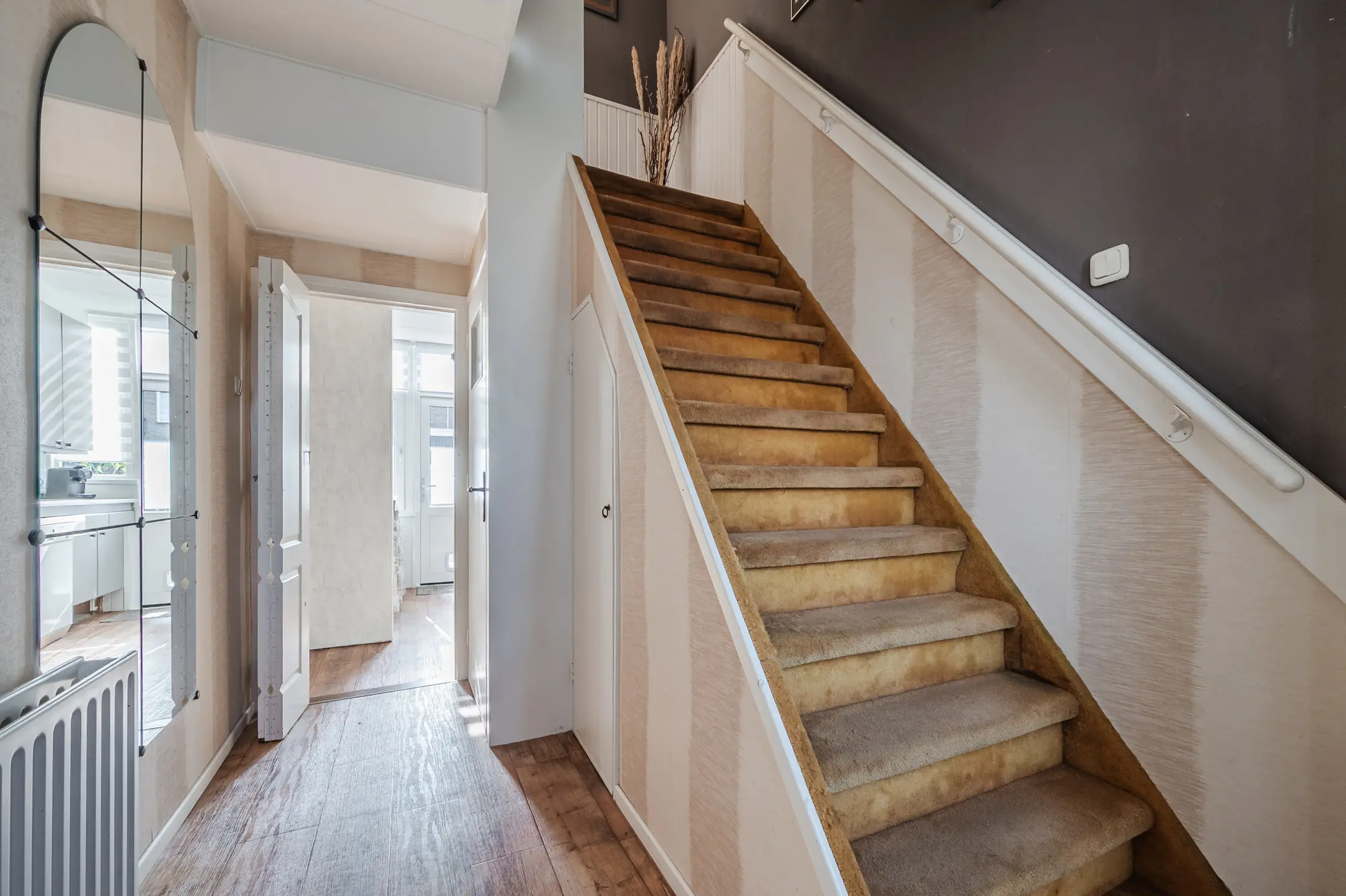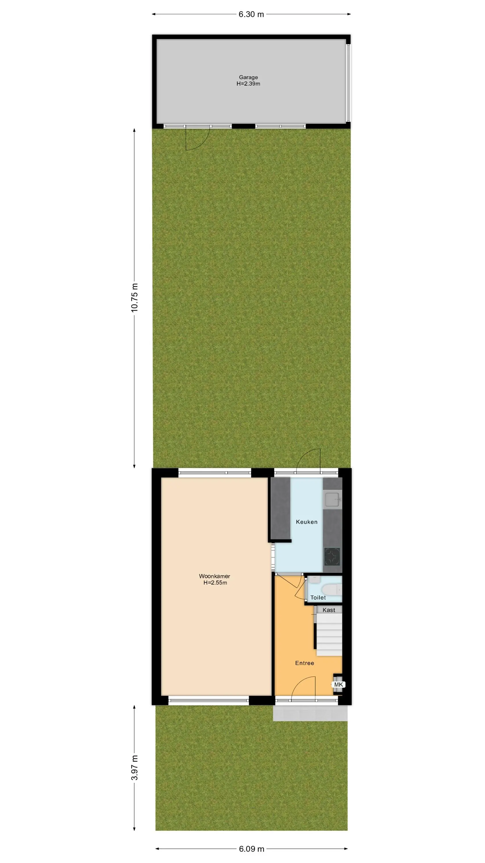 Je komt de woning binnen in de hal met meterkast, toiletruimte en de trap naar de eerste verdieping. Vanuit hier loop je door naar de keuken, die in verbinding staat met de woonkamer. De woonkamer is een lichte doorzonruimte waar je gemakkelijk een gezellige zithoek en eethoek kunt creëren. Dankzij de vloerverwarming is het hier bovendien extra comfortabel.