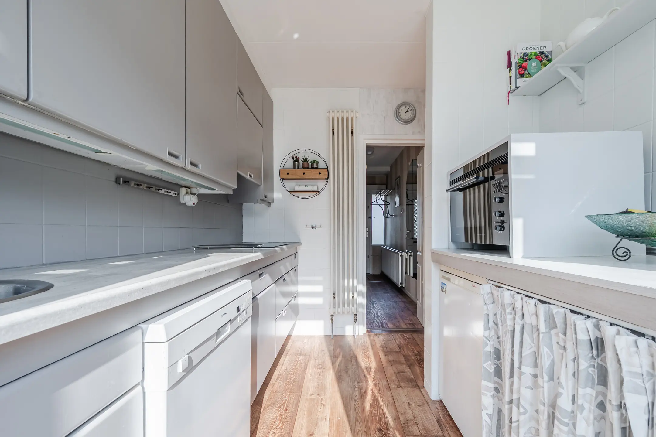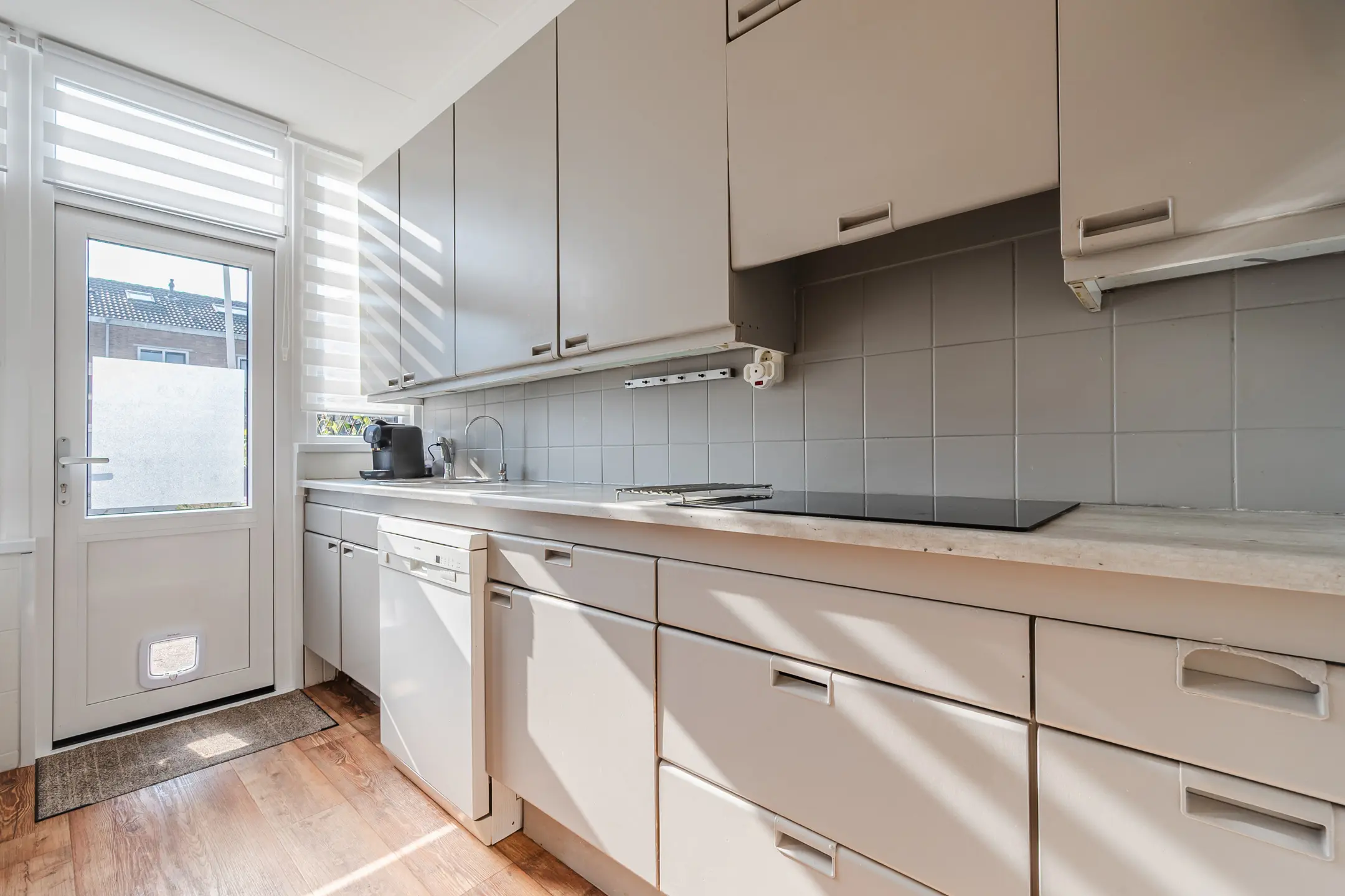 De keuken is eenvoudig uitgevoerd en voorzien van een inductiekookplaat, afzuigkap, vaatwasser en close-in boiler. Vanuit de keuken stap je zo de zonnige achtertuin in. De tuin is praktisch aangelegd met bestrating en beplanting en beschikt over een achterom. Achterin de tuin staat een vrijstaande stenen garage met smeerput, ideaal voor hobbyisten, klussers of als extra opslagruimte.