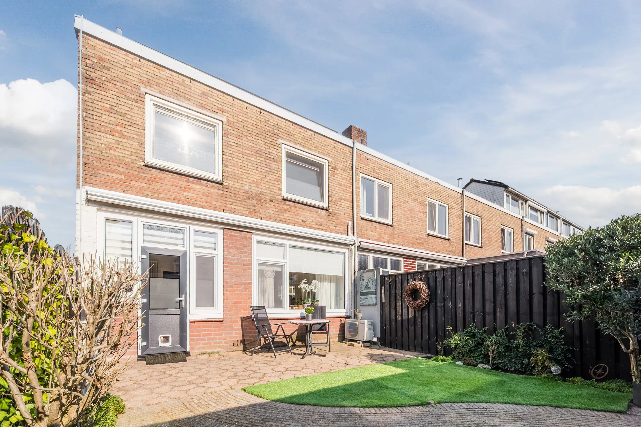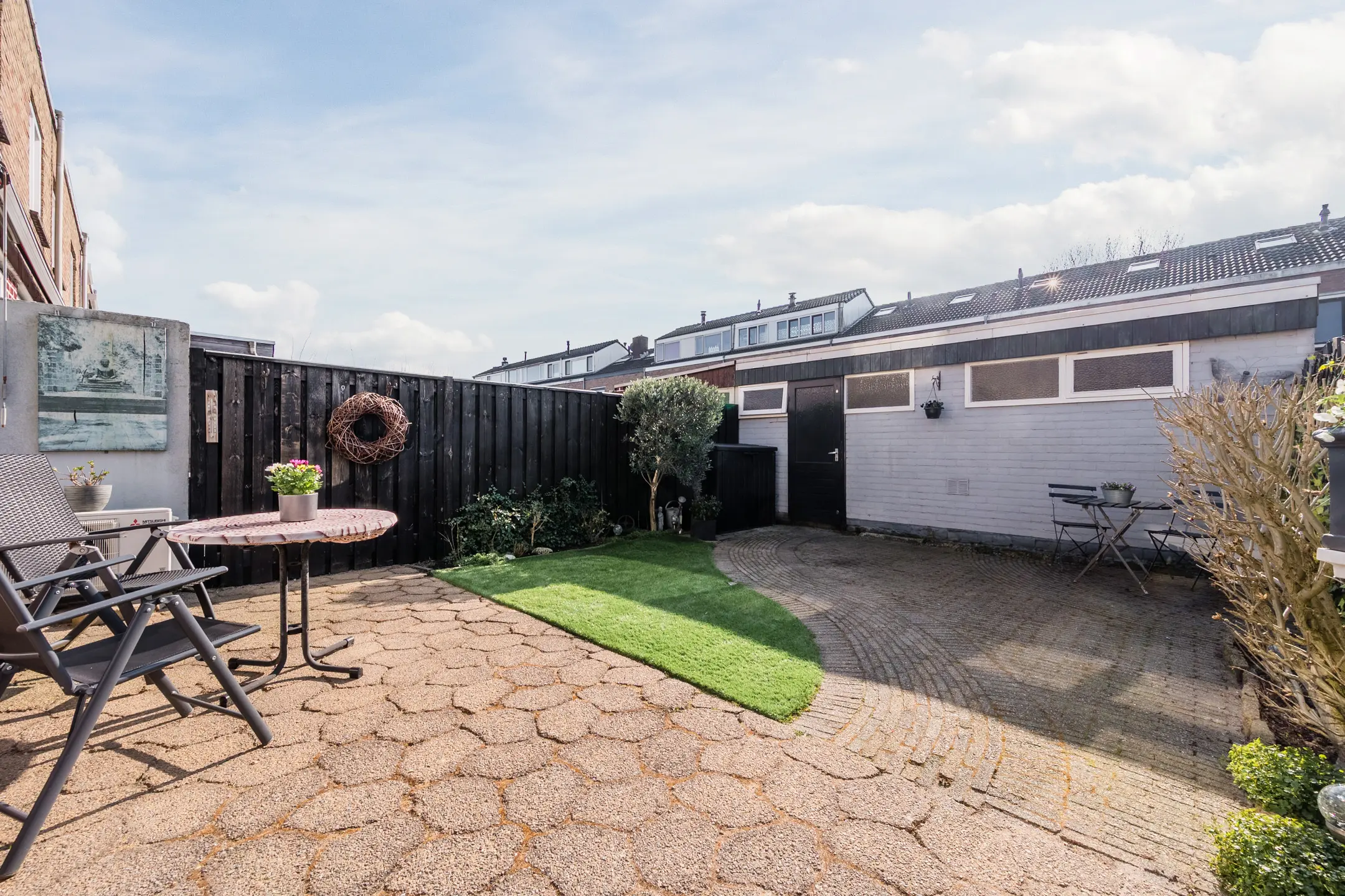 - Zonnige diepe achtertuin met achterom