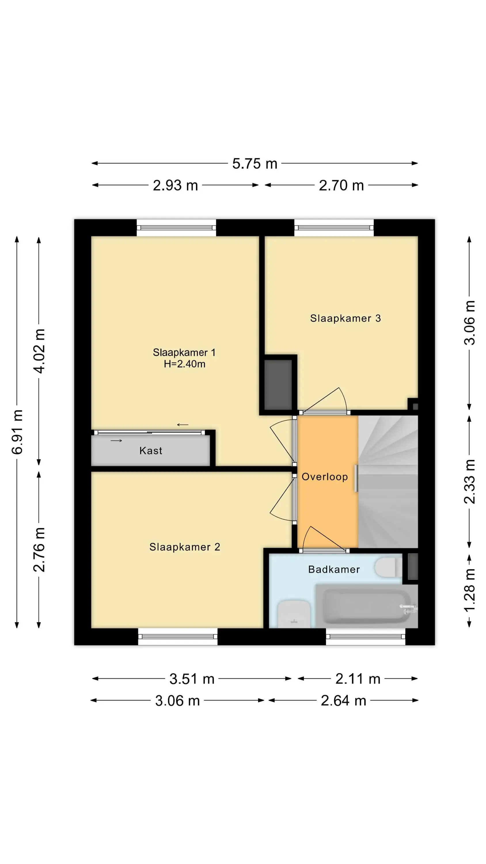 Op de eerste verdieping kom je via de overloop bij drie slaapkamers en de badkamer. De badkamer is voorzien van een ligbad, tweede toilet en wastafel.