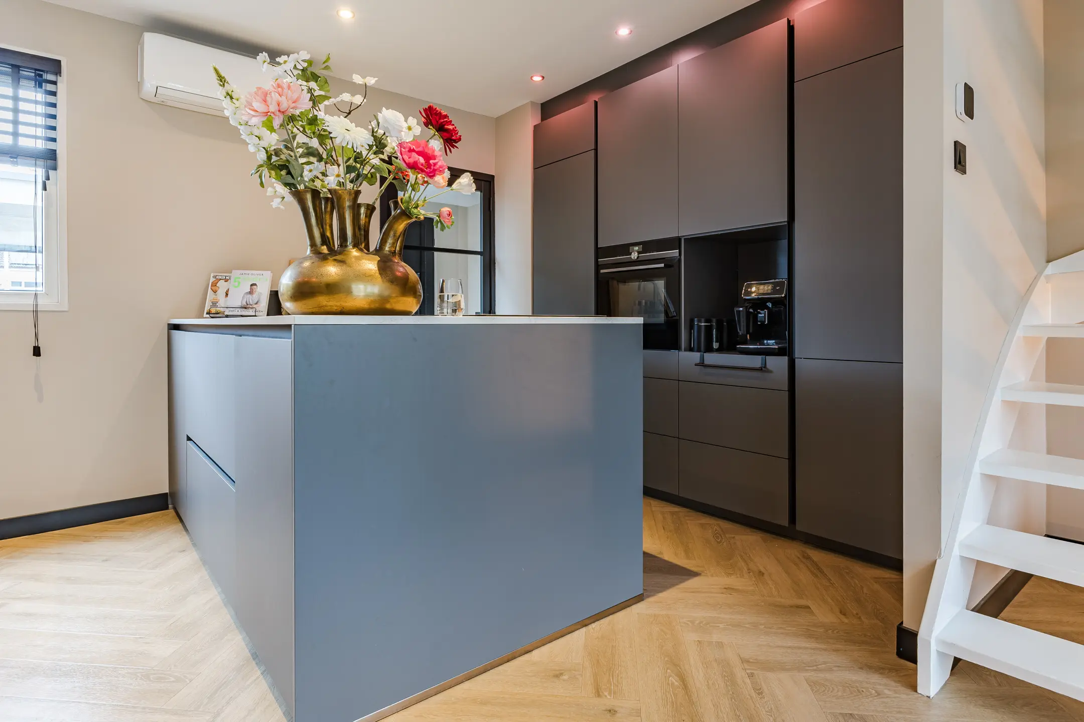 Aan de voorzijde bevindt zich de moderne, compleet uitgeruste woonkeuken met kookeiland – een echte eyecatcher! De keuken is voorzien van hoogwaardige inbouwapparatuur, waaronder: