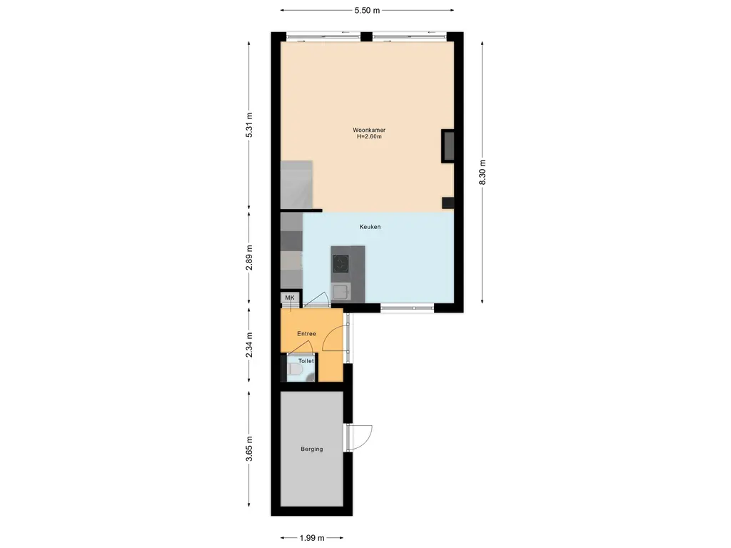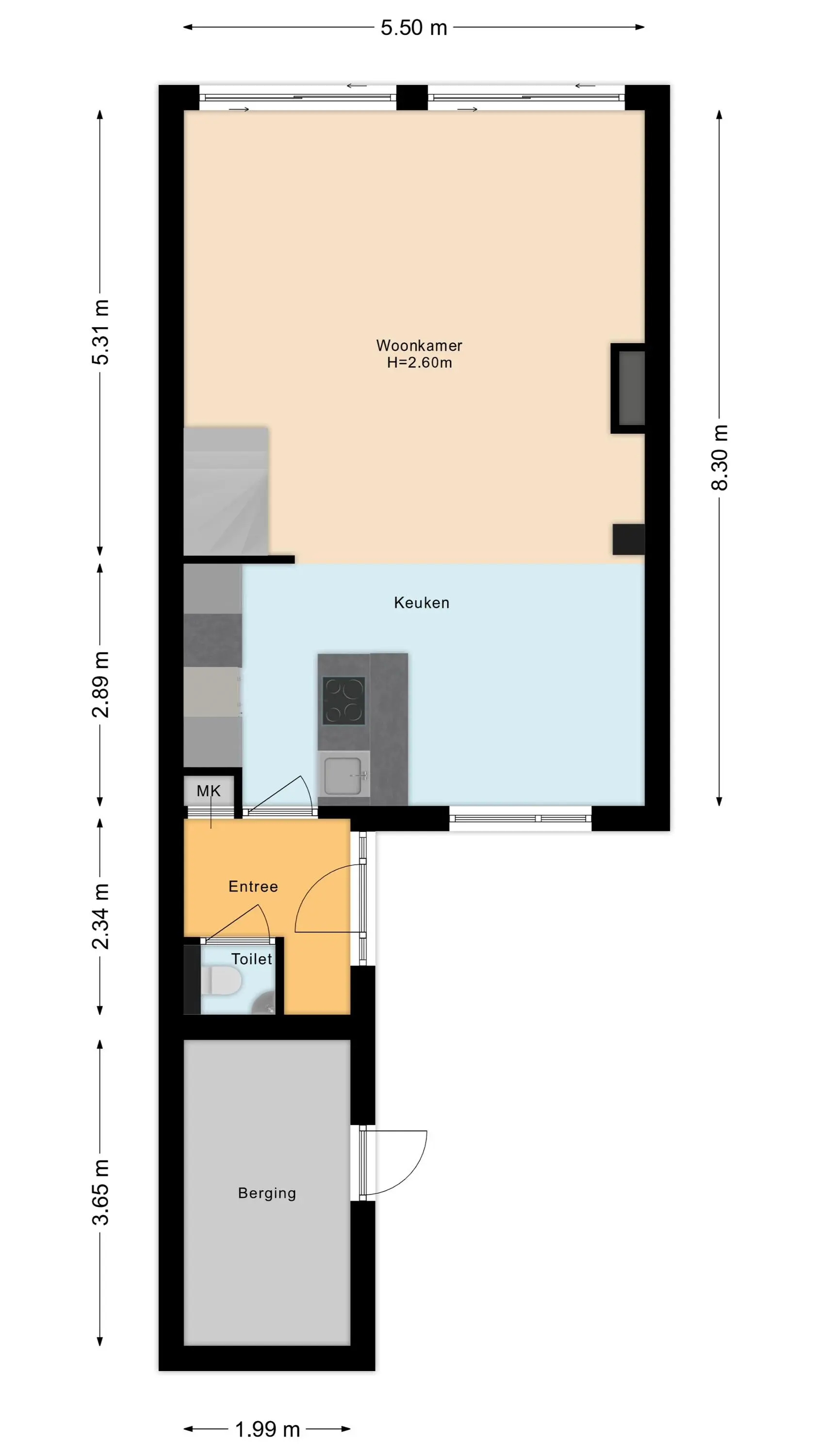 De uitgebouwde entree biedt extra ruimte en beschikt over een modern toilet.