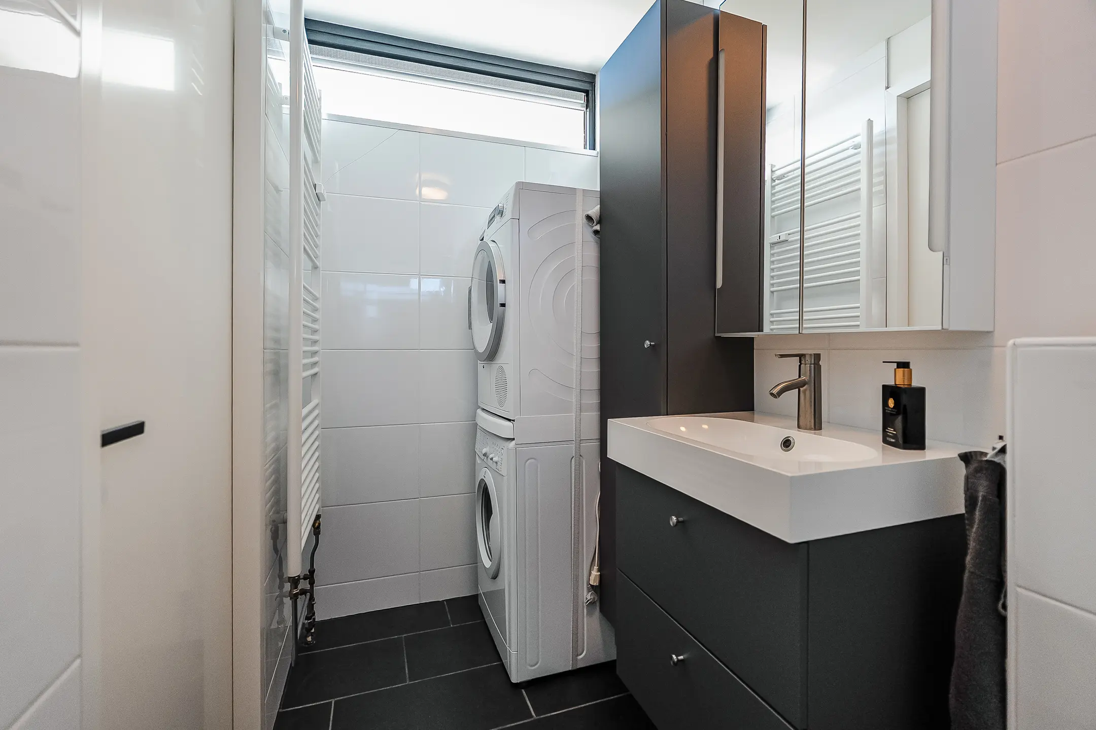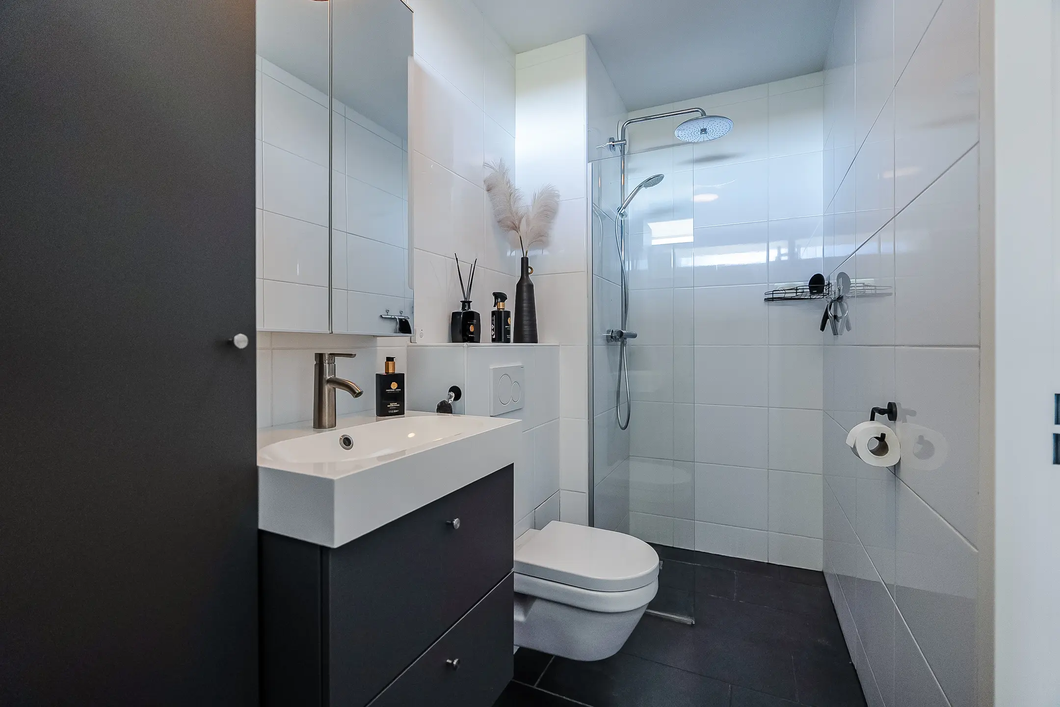 Het appartement beschikt over een ruime slaapkamer en een badkamer met inloopdouche en wastafel, daarnaast is er een toilet aanwezig en de witgoedaansluiting. In de onderbouw heb je de beschikking over een eigen berging, ideaal voor het stallen van fietsen of het opbergen van spullen.