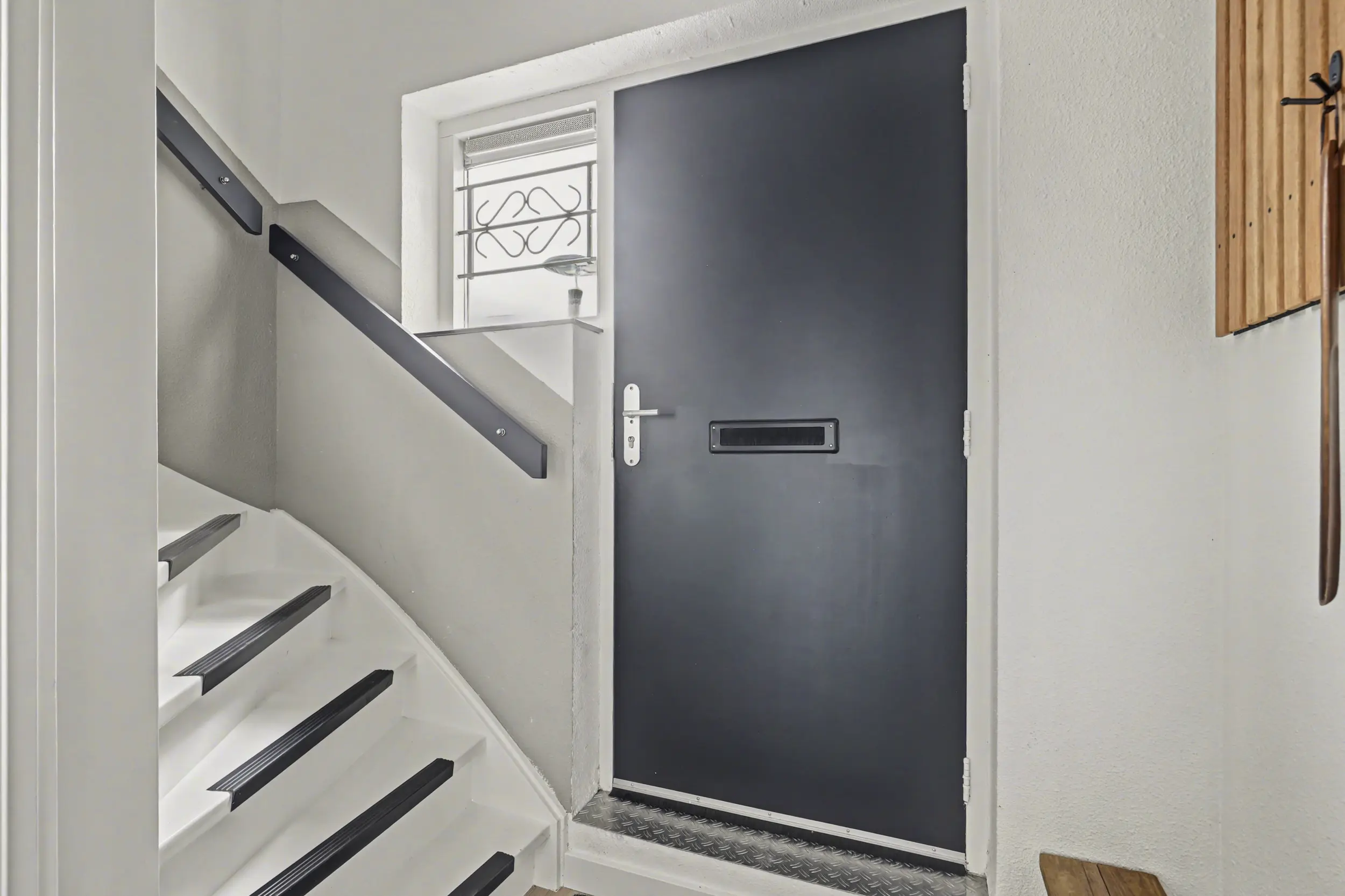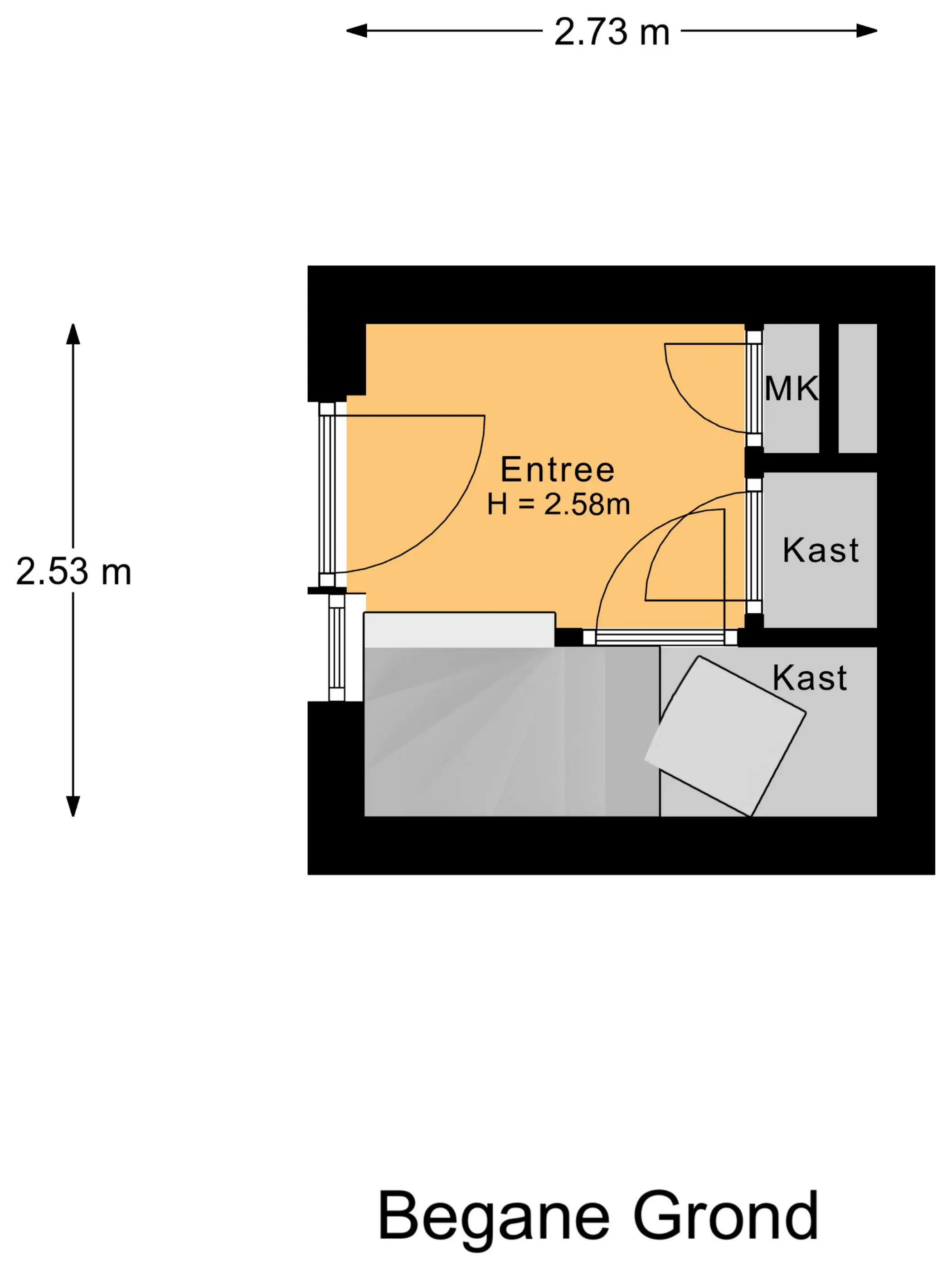 De entree bevindt zich in de hal, waar de meterkast, een bergkast (opstelling CV) en een ruime trapkast zijn gesitueerd. Vanuit deze hal leidt de trap naar de woonverdieping.