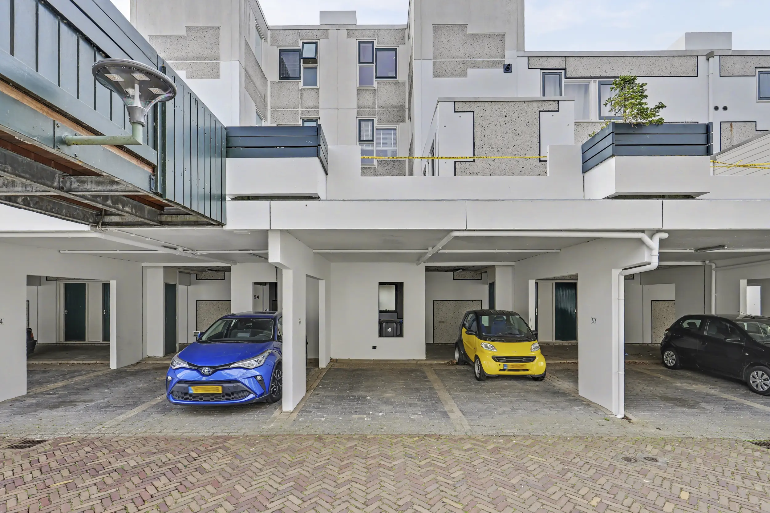 Op de begane grond van het complex bevindt zich de eigen parkeerplaats. Heel prettig dat je hier de auto overdekt kunt plaatsen.