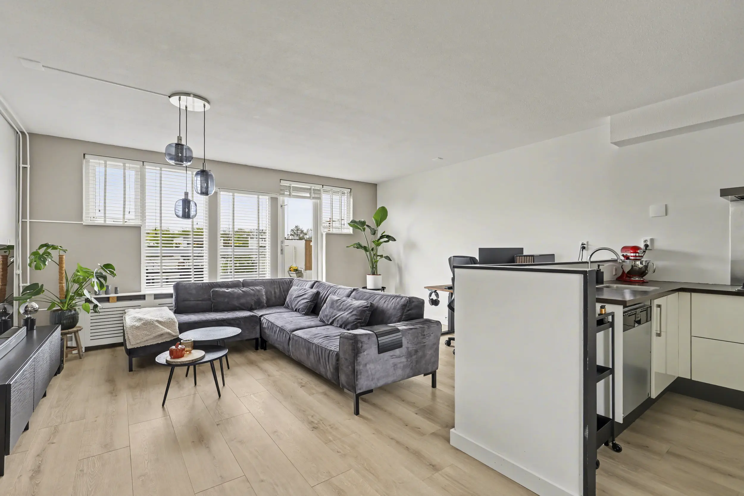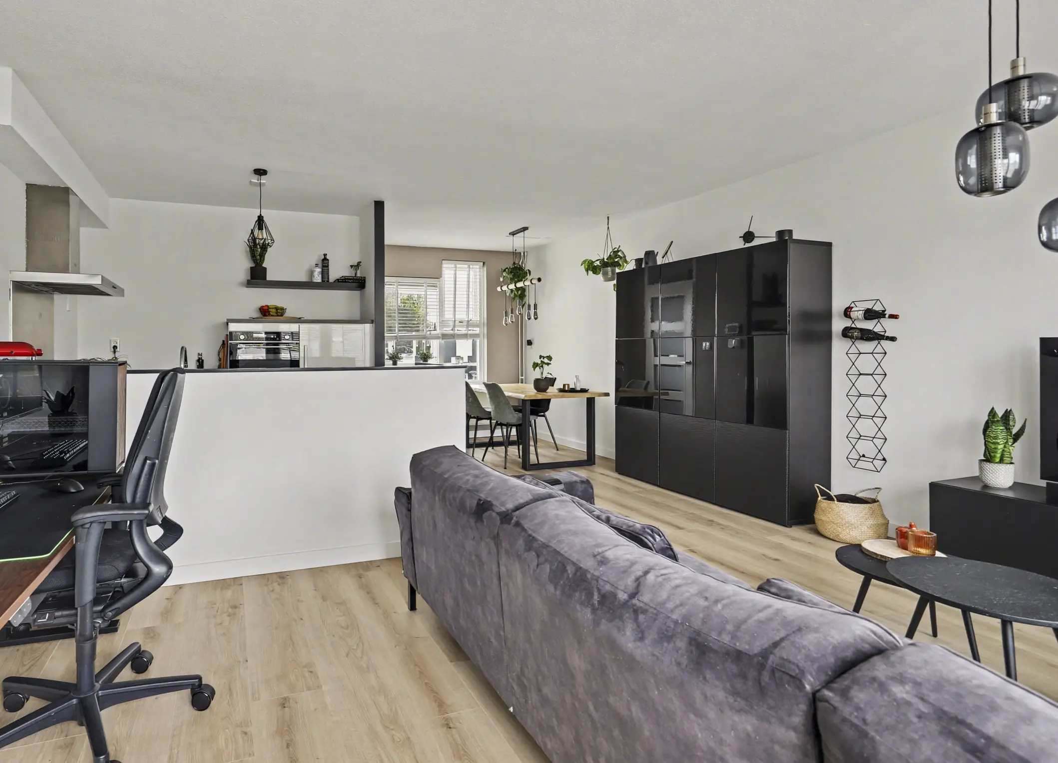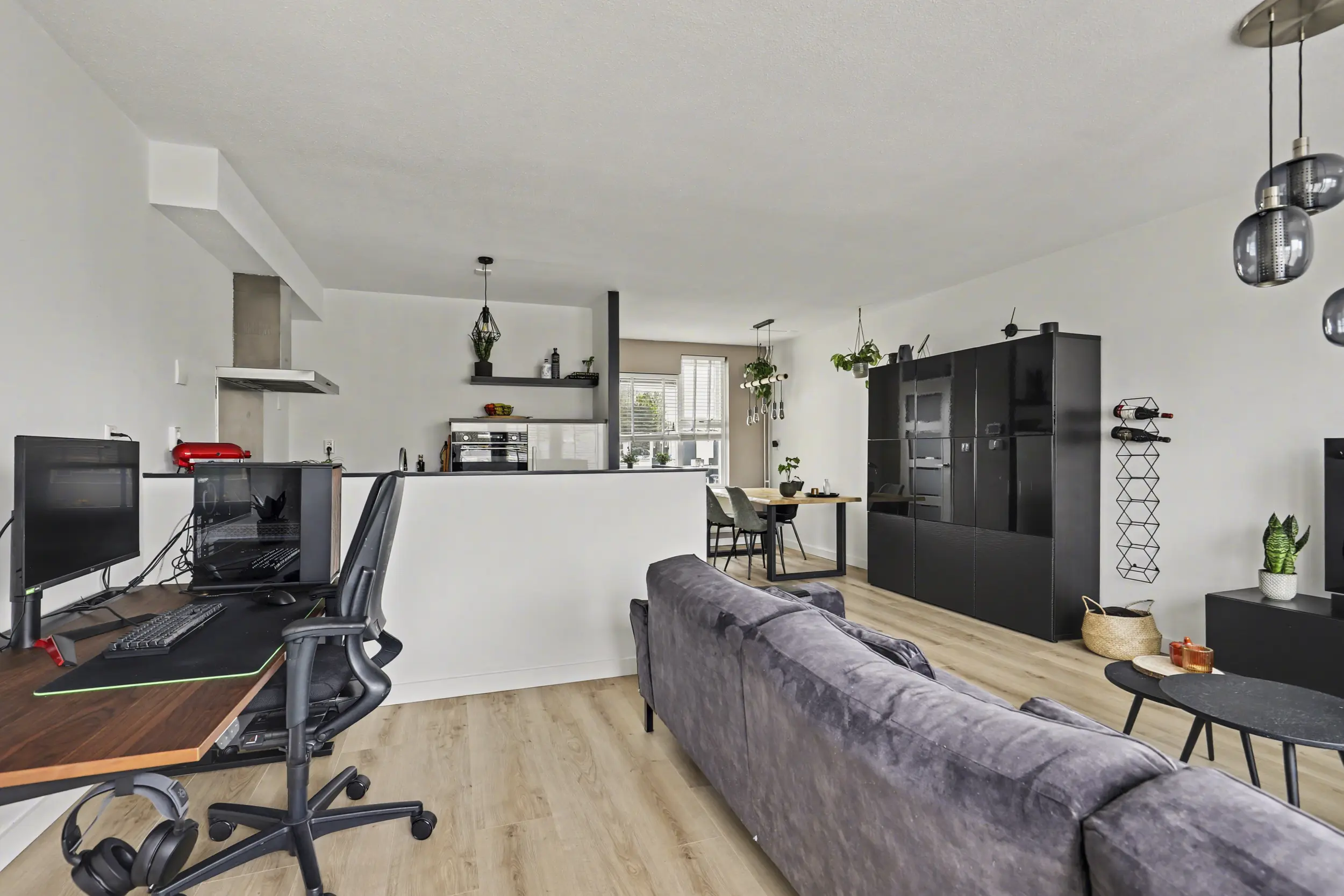 De royale woonkamer is heerlijk licht en heeft een open, uitnodigende indeling. Dankzij de directe toegang tot het terras is er een fijne verbinding tussen binnen en buiten. De ruimte is afgewerkt met een nette laminaatvloer en strak afgewerkte wanden. Centraal op deze verdieping bevindt zich de open keuken.
