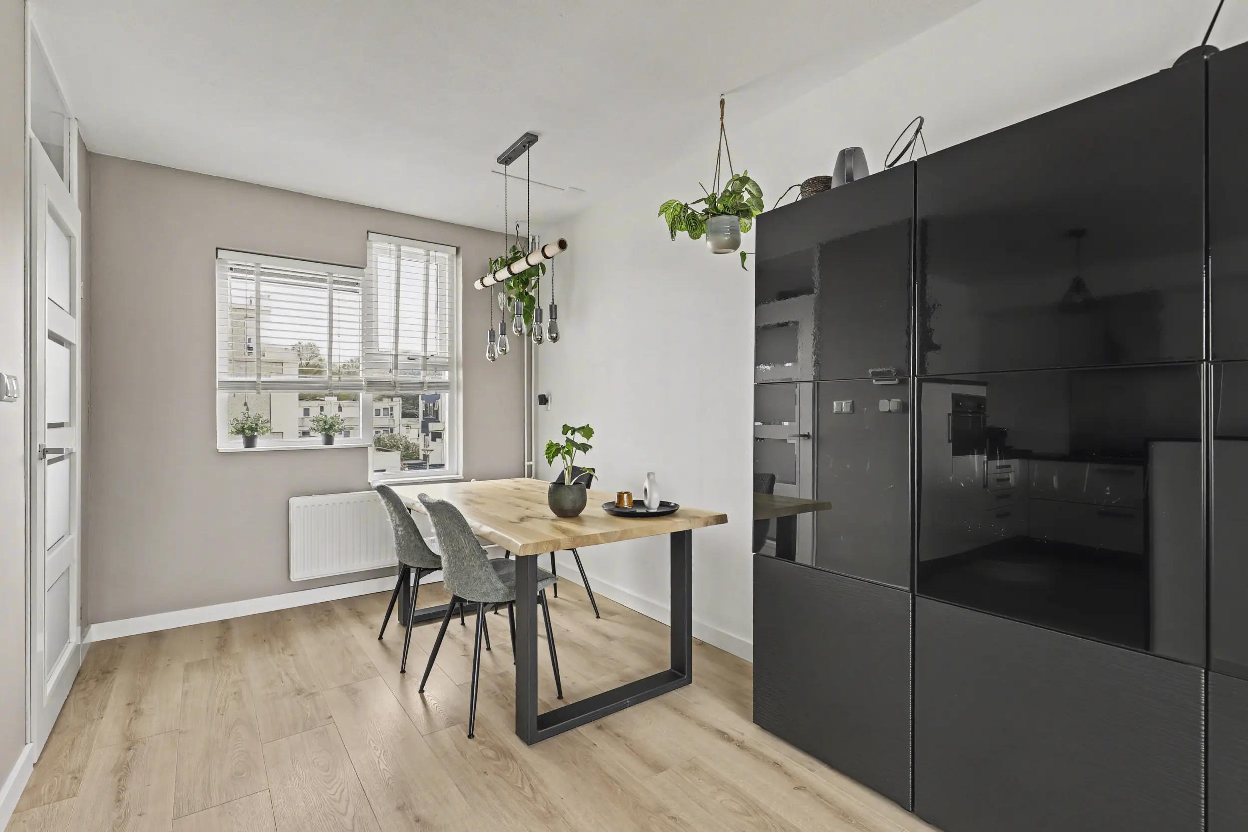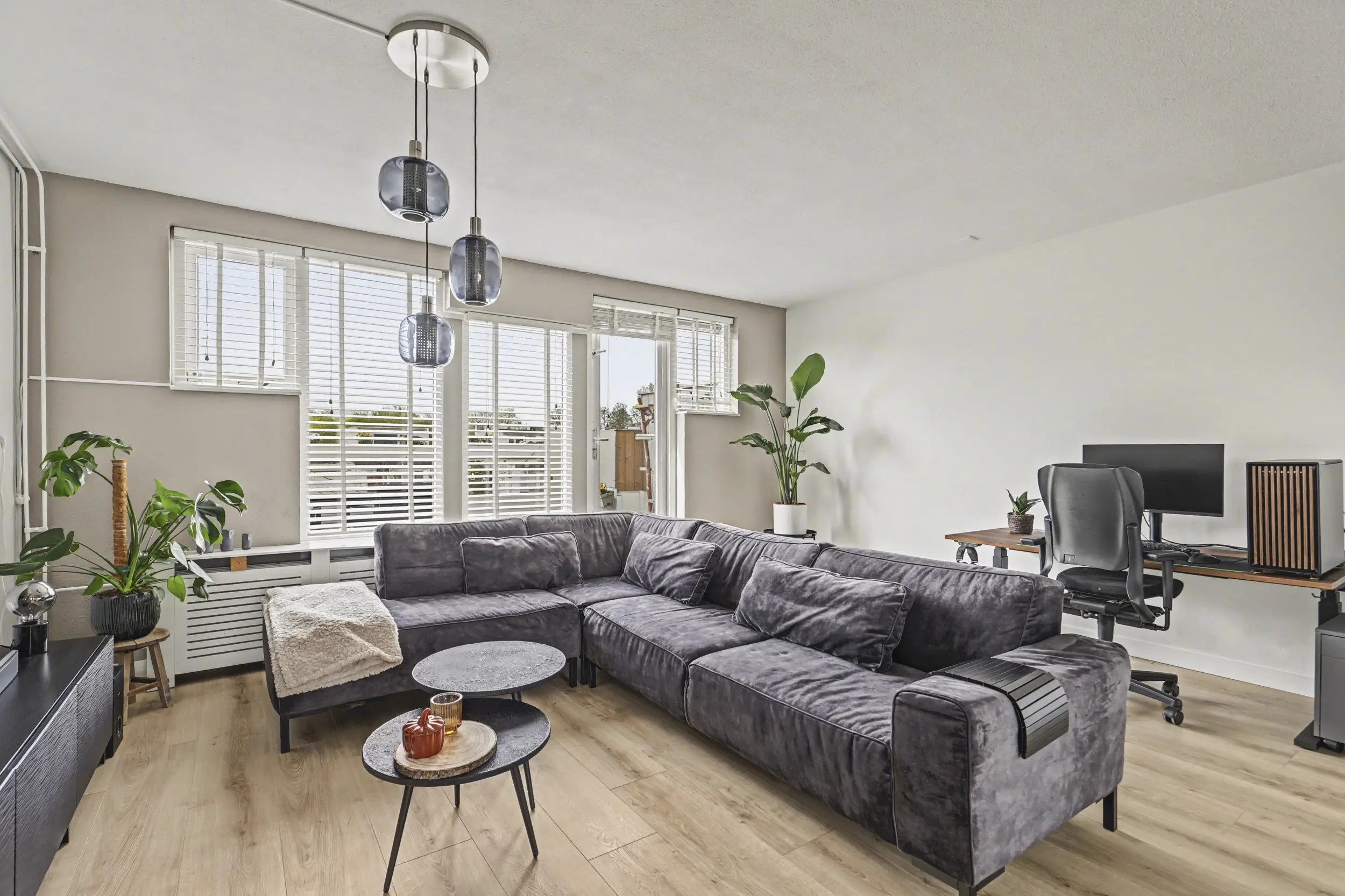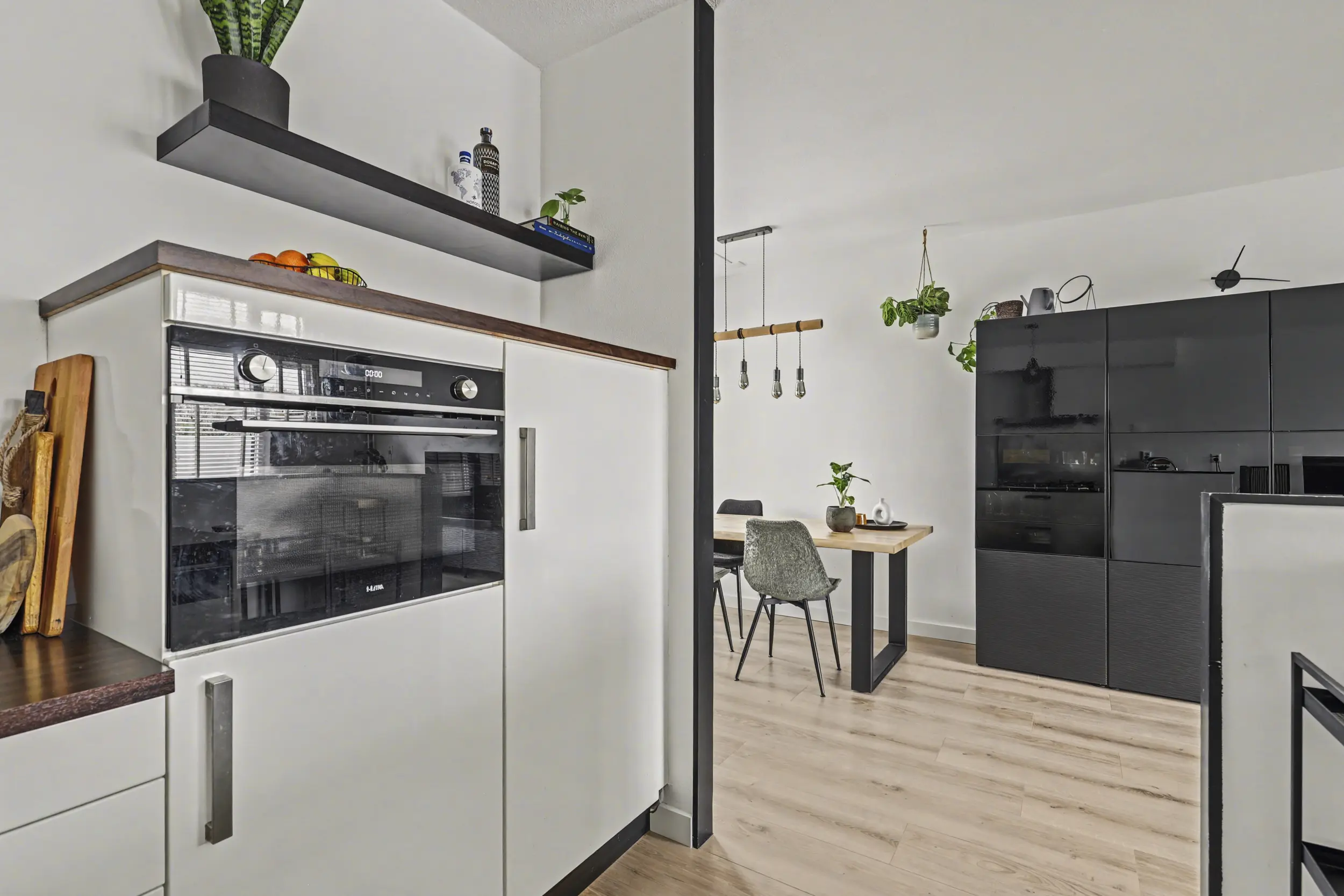 De royale woonkamer is heerlijk licht en heeft een open, uitnodigende indeling. Dankzij de directe toegang tot het terras is er een fijne verbinding tussen binnen en buiten. De ruimte is afgewerkt met een nette laminaatvloer en strak afgewerkte wanden. Centraal op deze verdieping bevindt zich de open keuken.
