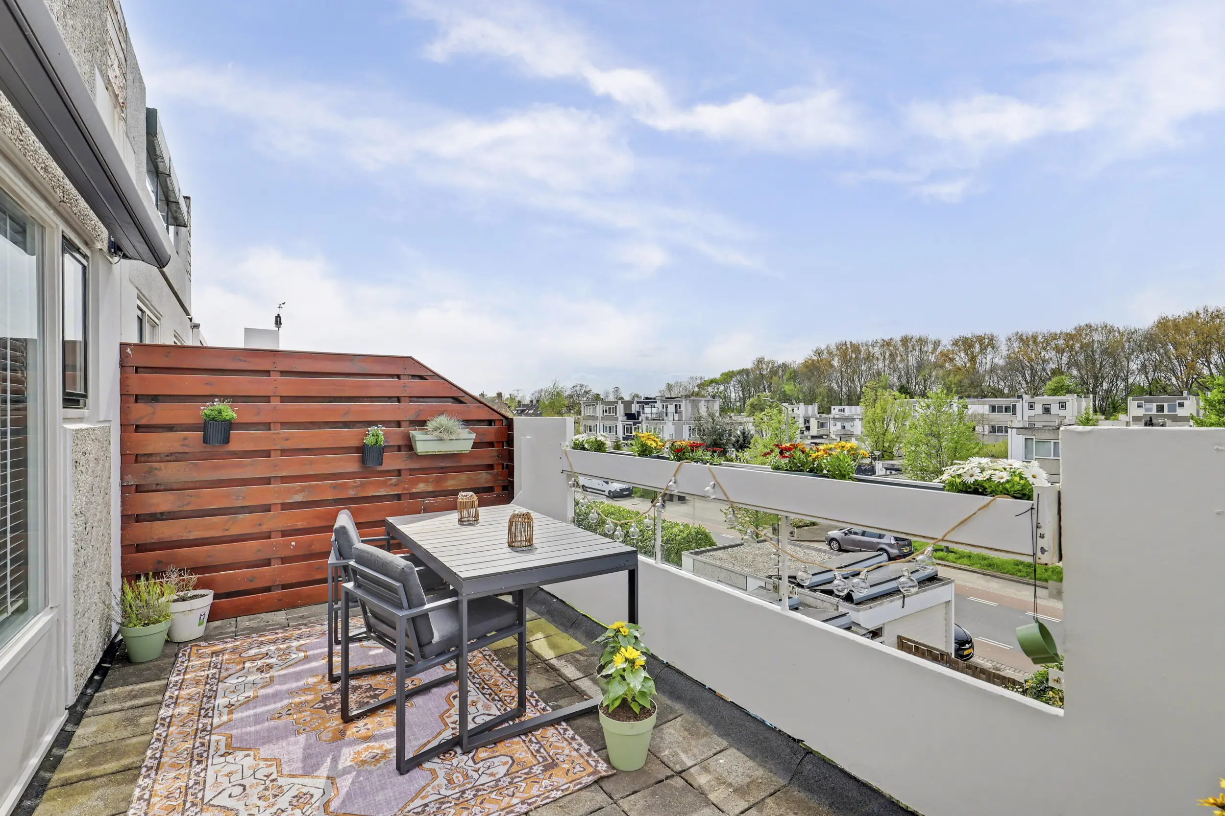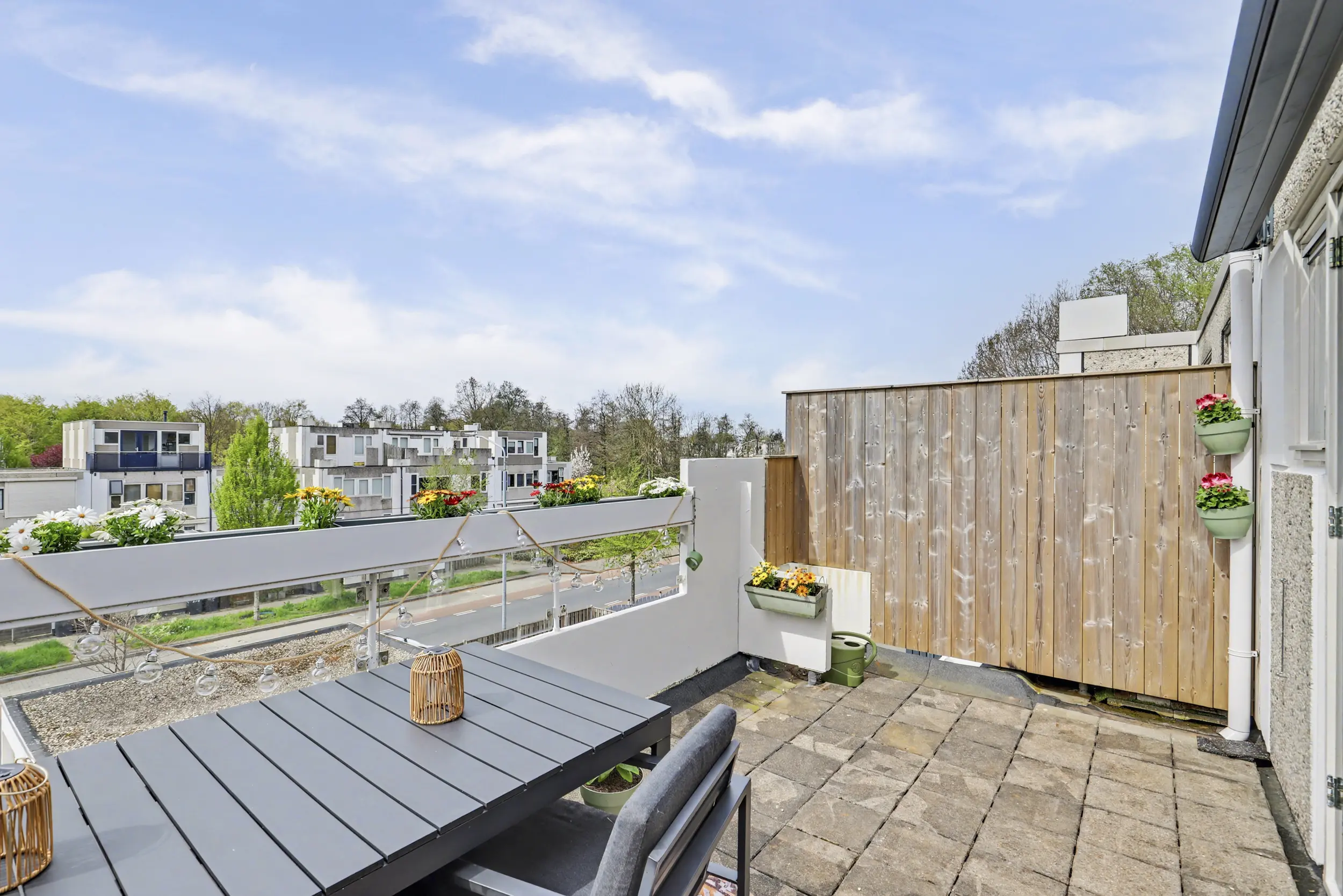 Het terras is gunstig gelegen op het westen en biedt een prettig, vrij uitzicht. Het aanwezige elektrische zonnescherm draagt bij aan extra comfort, zodat u hier in de middag en avond heerlijk van de zon kunt genieten.