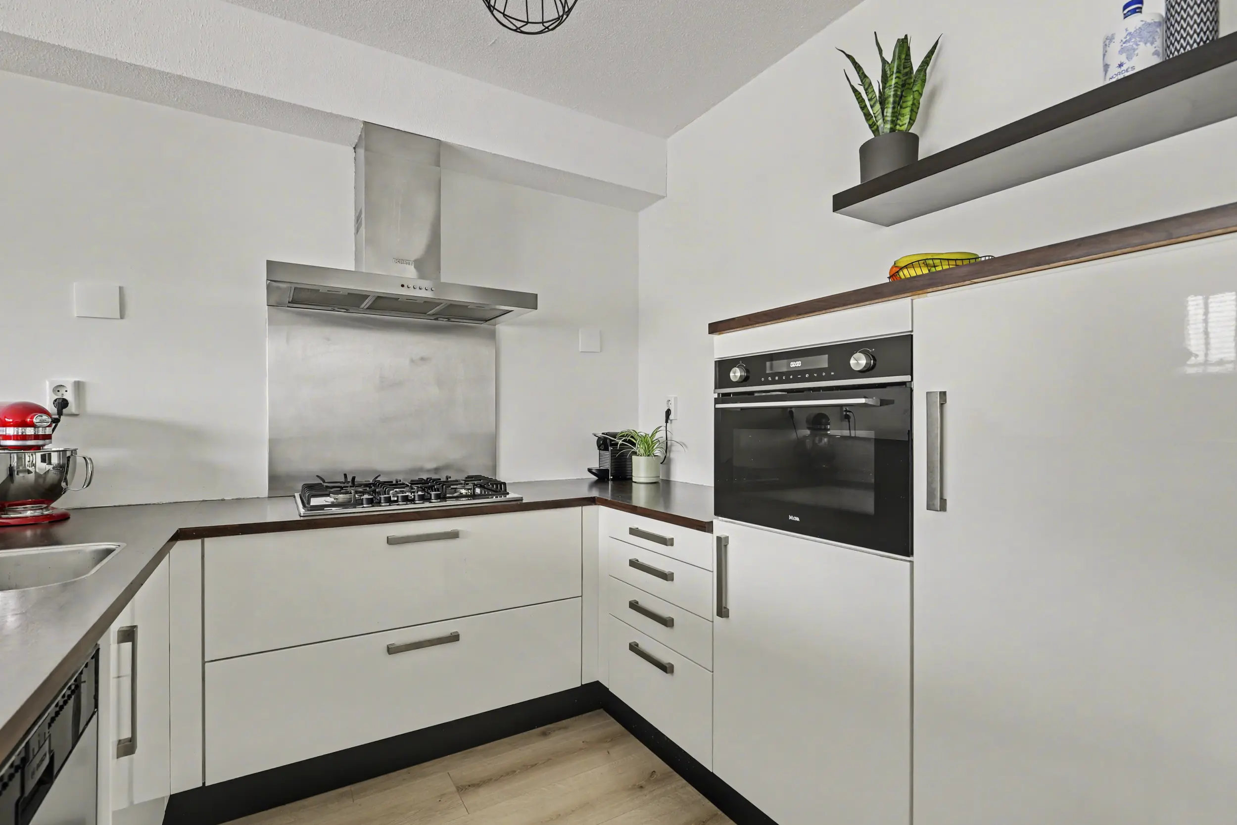 De keuken is uitgevoerd in een praktische U-opstelling en voorzien van diverse inbouwapparatuur, waaronder een 5-pits gaskookplaat, RVS afzuigkap, vaatwasser, combi-oven en koelkast. Het geheel is verzorgd afgewerkt en biedt volop werk- en bergruimte.