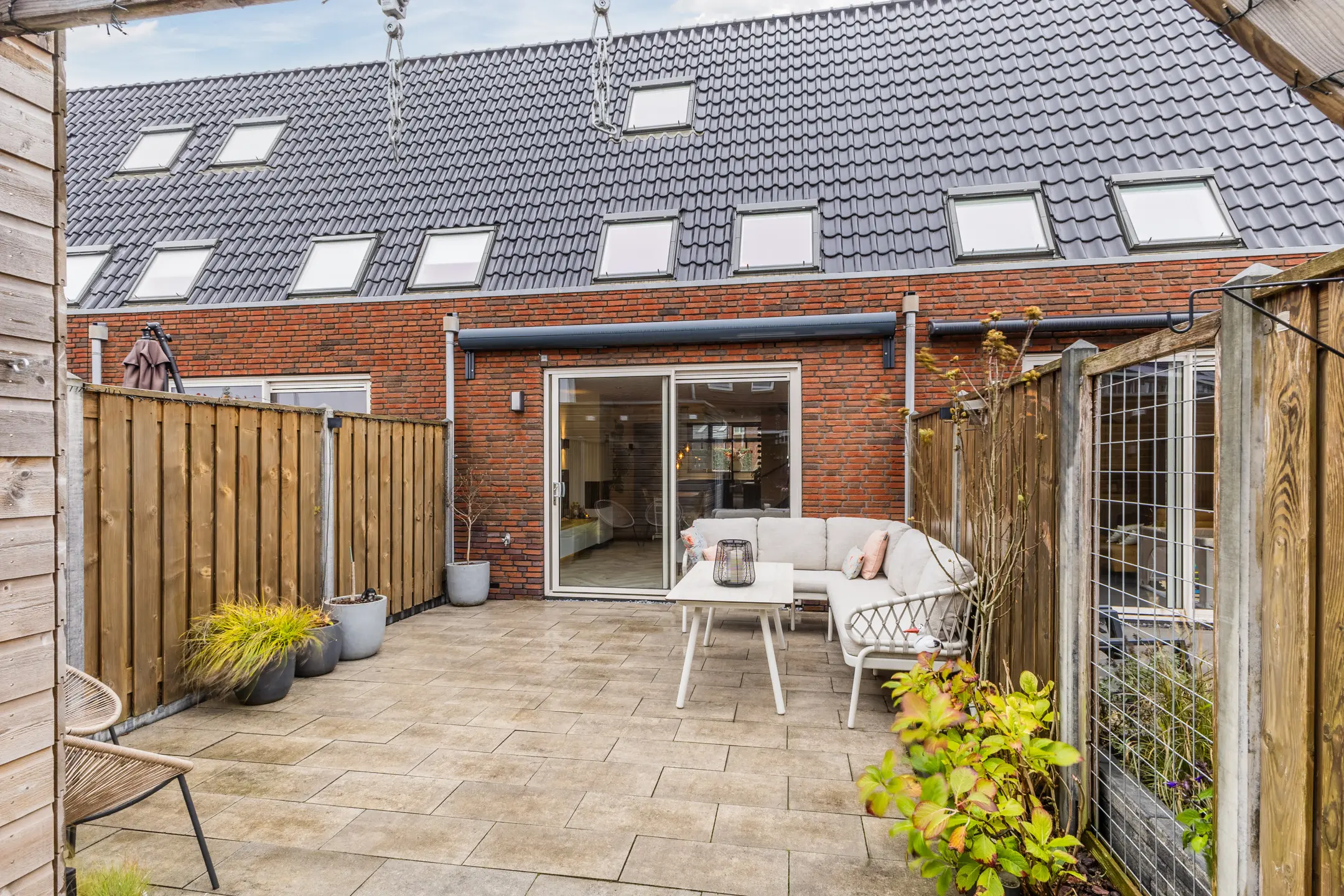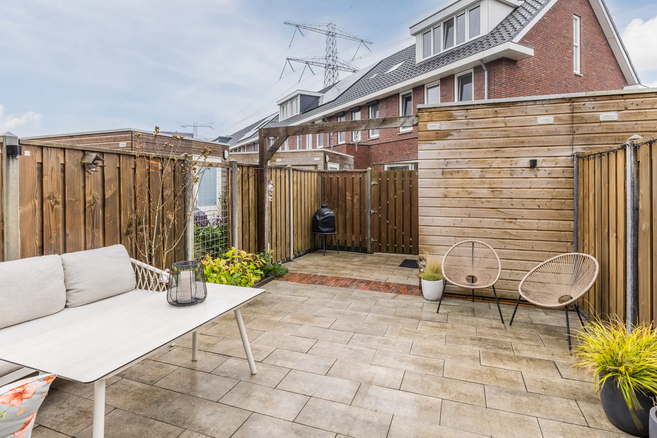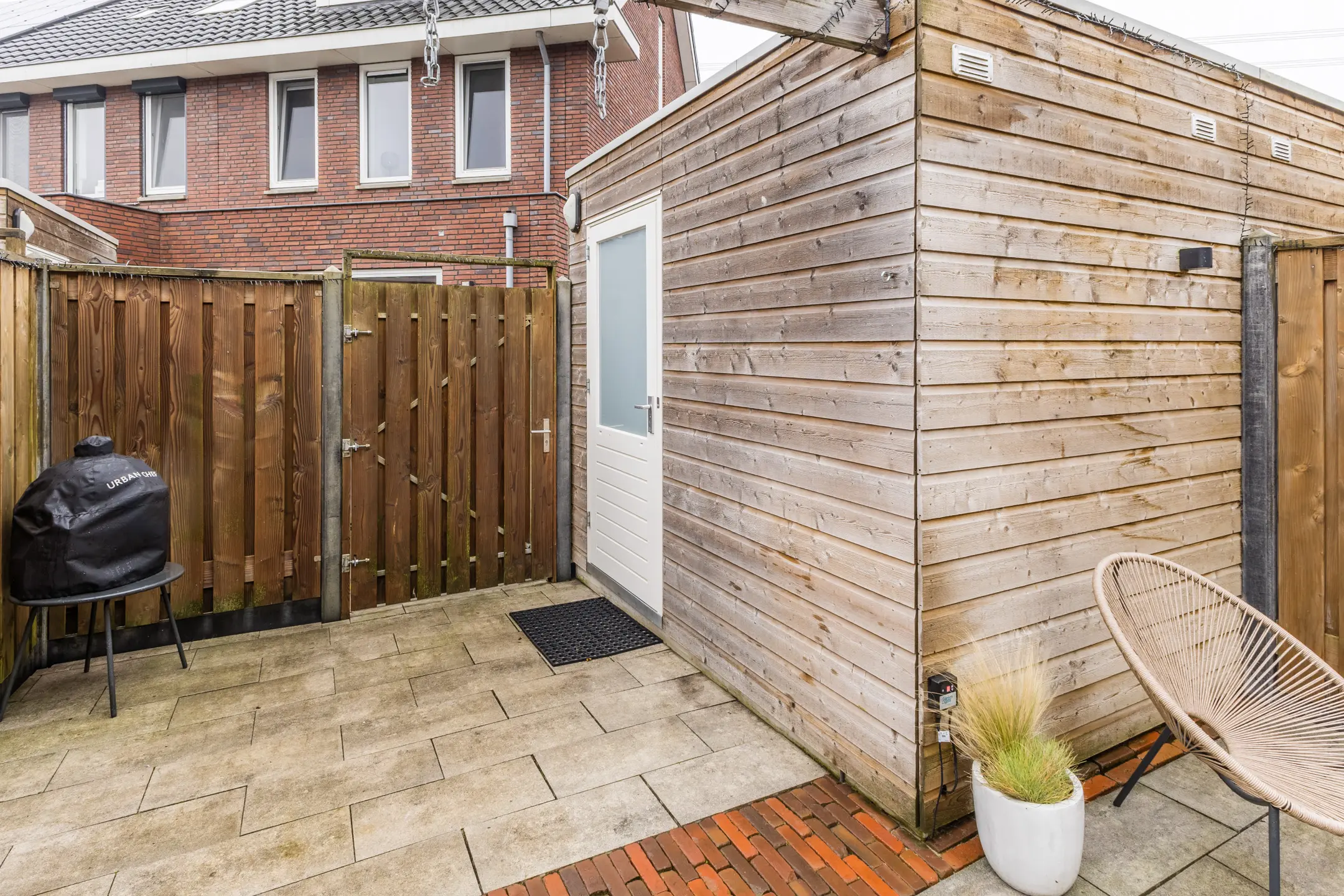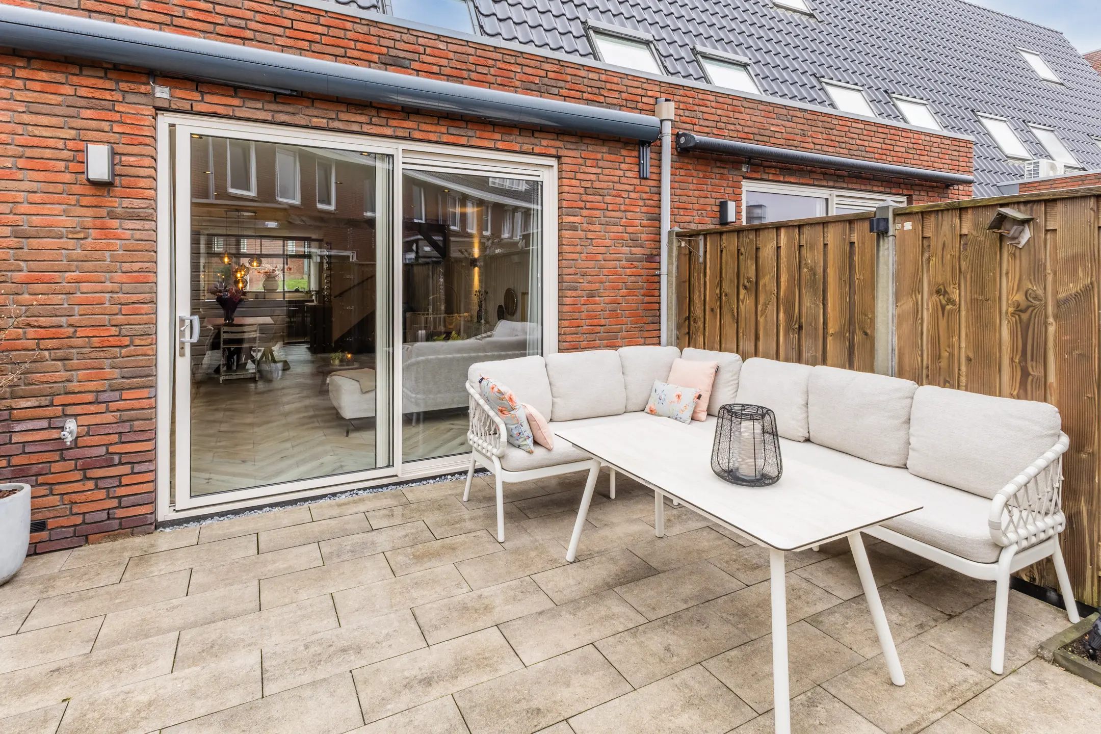 De zonnige achtertuin ligt perfect op het zuiden en is uitgerust met een elektrisch zonnescherm. De berging achterin de tuin biedt volop opslagruimte.