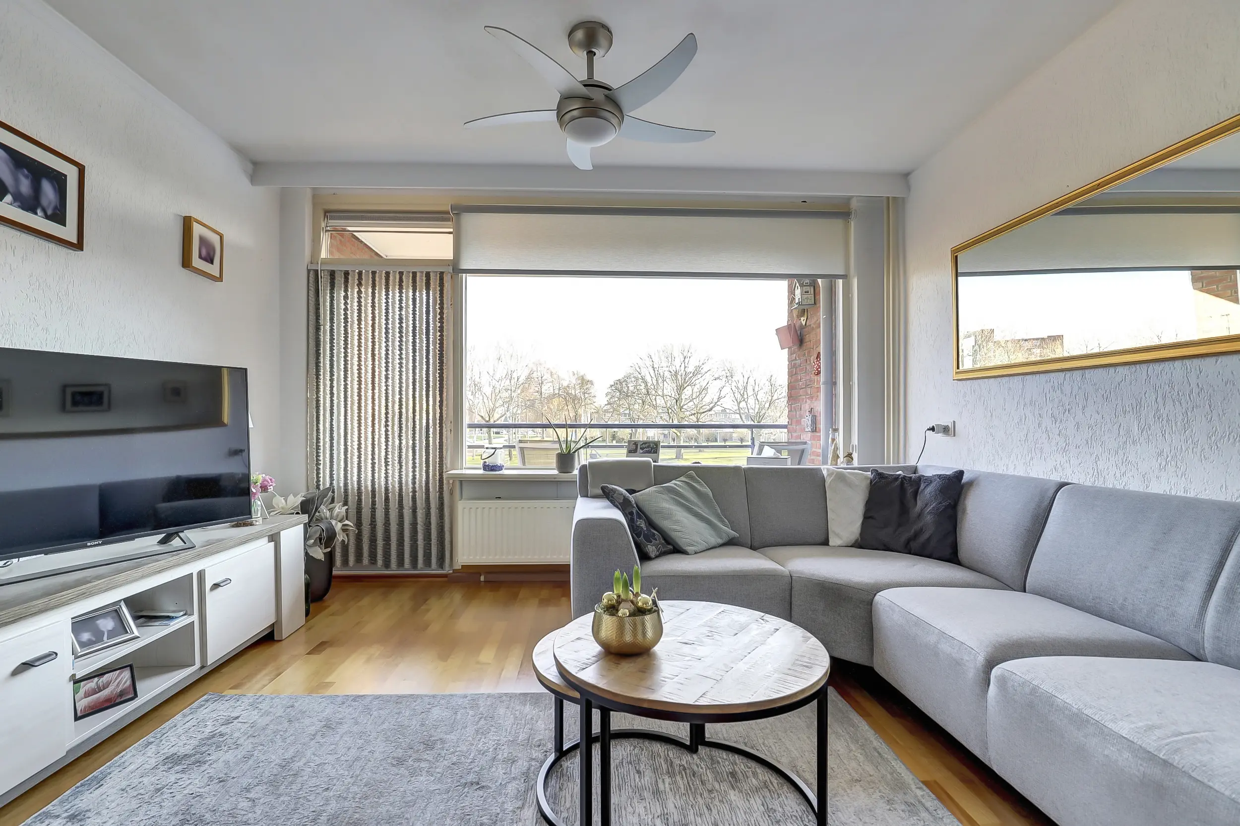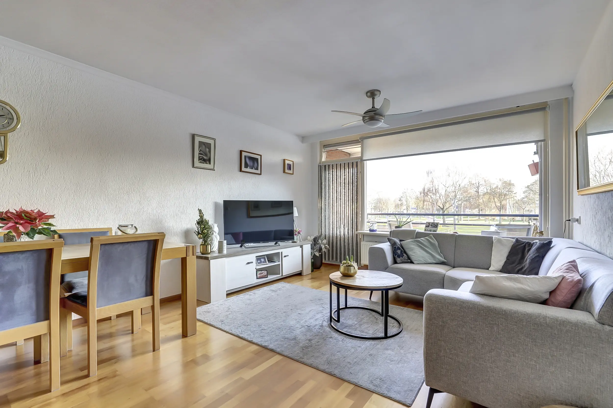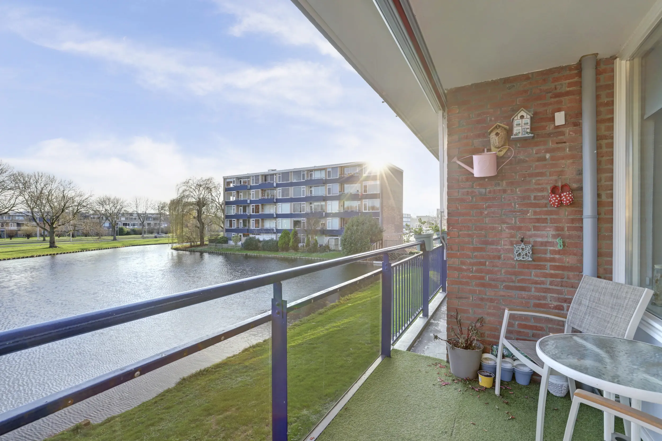 De lichte woonkamer is een prettige leefruimte en geeft toegang tot het balkon aan de achterzijde. Hier is het echt genieten van zowel de ochtend- als de middagzon, met een mooi uitzicht over de vijver en de groene omgeving.