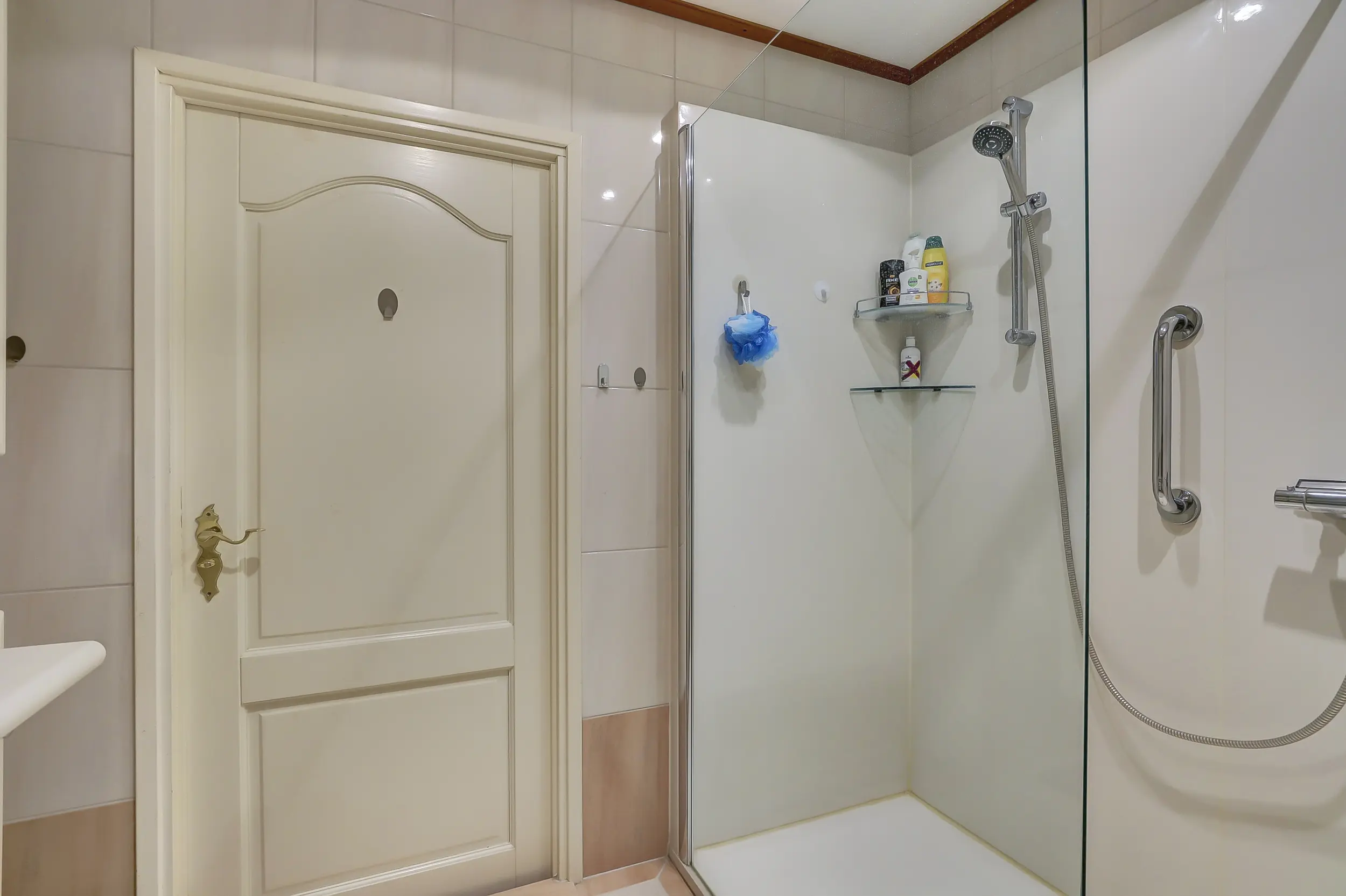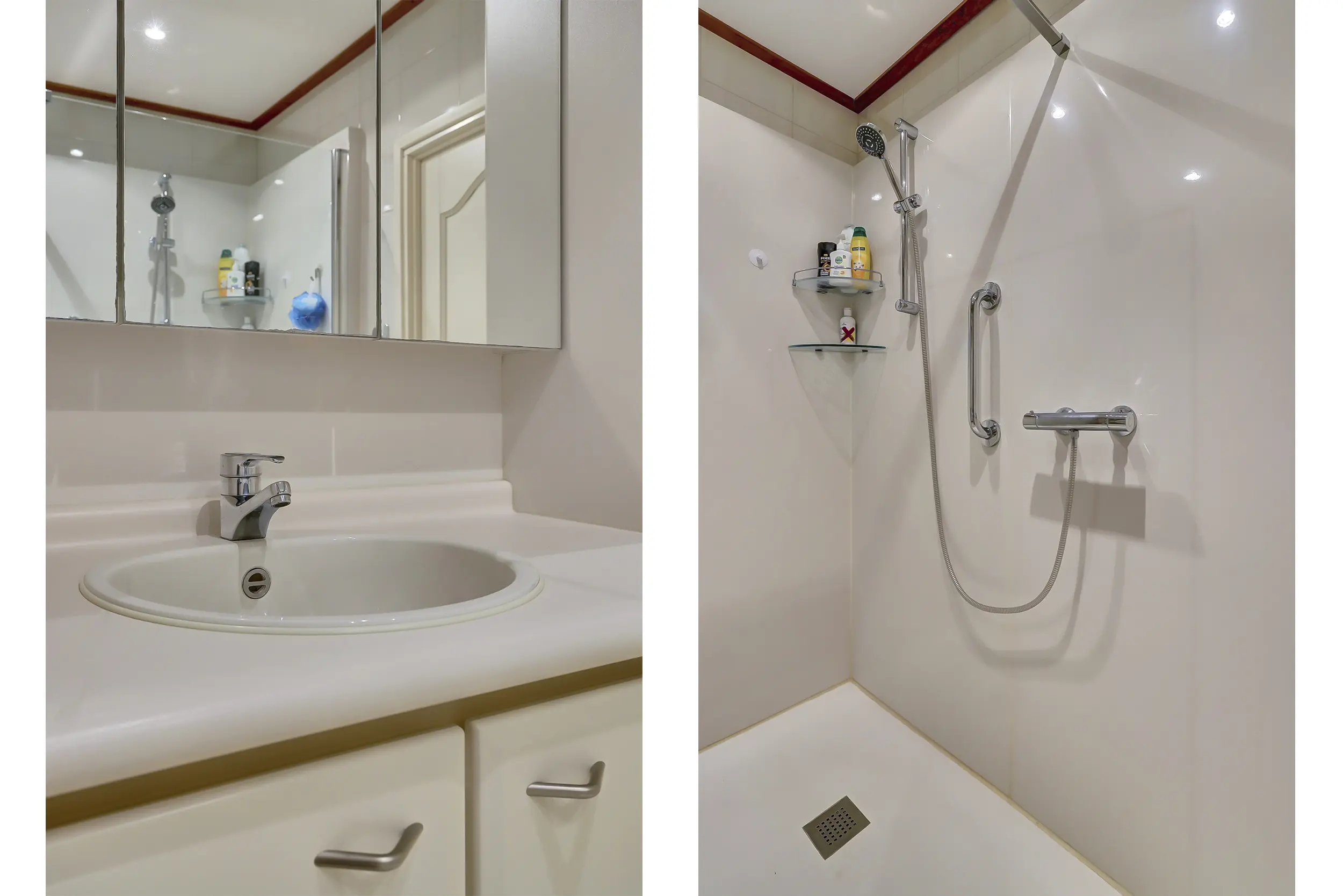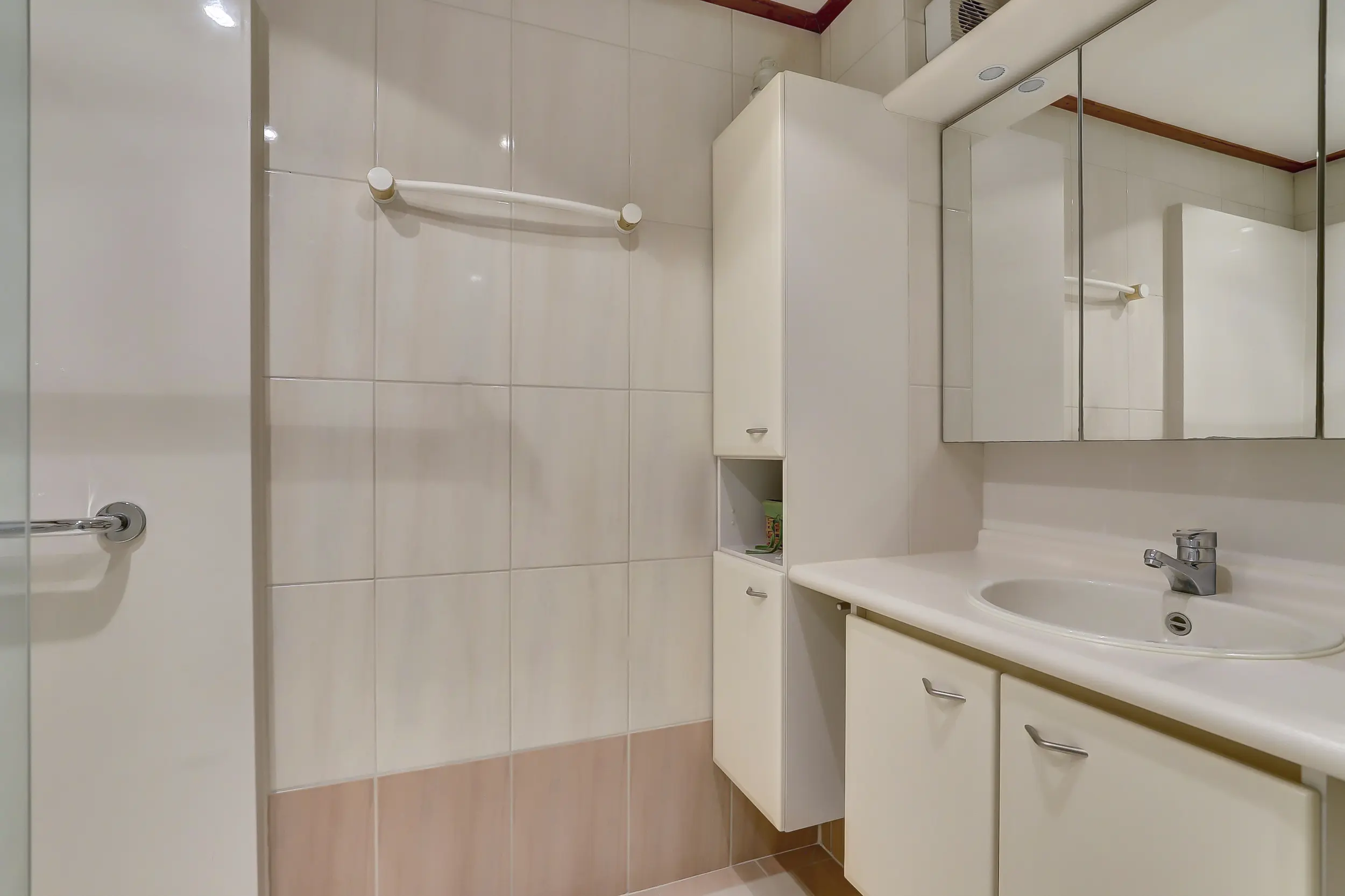 De badkamer is voorzien van een ruime douche en een wastafelmeubel.