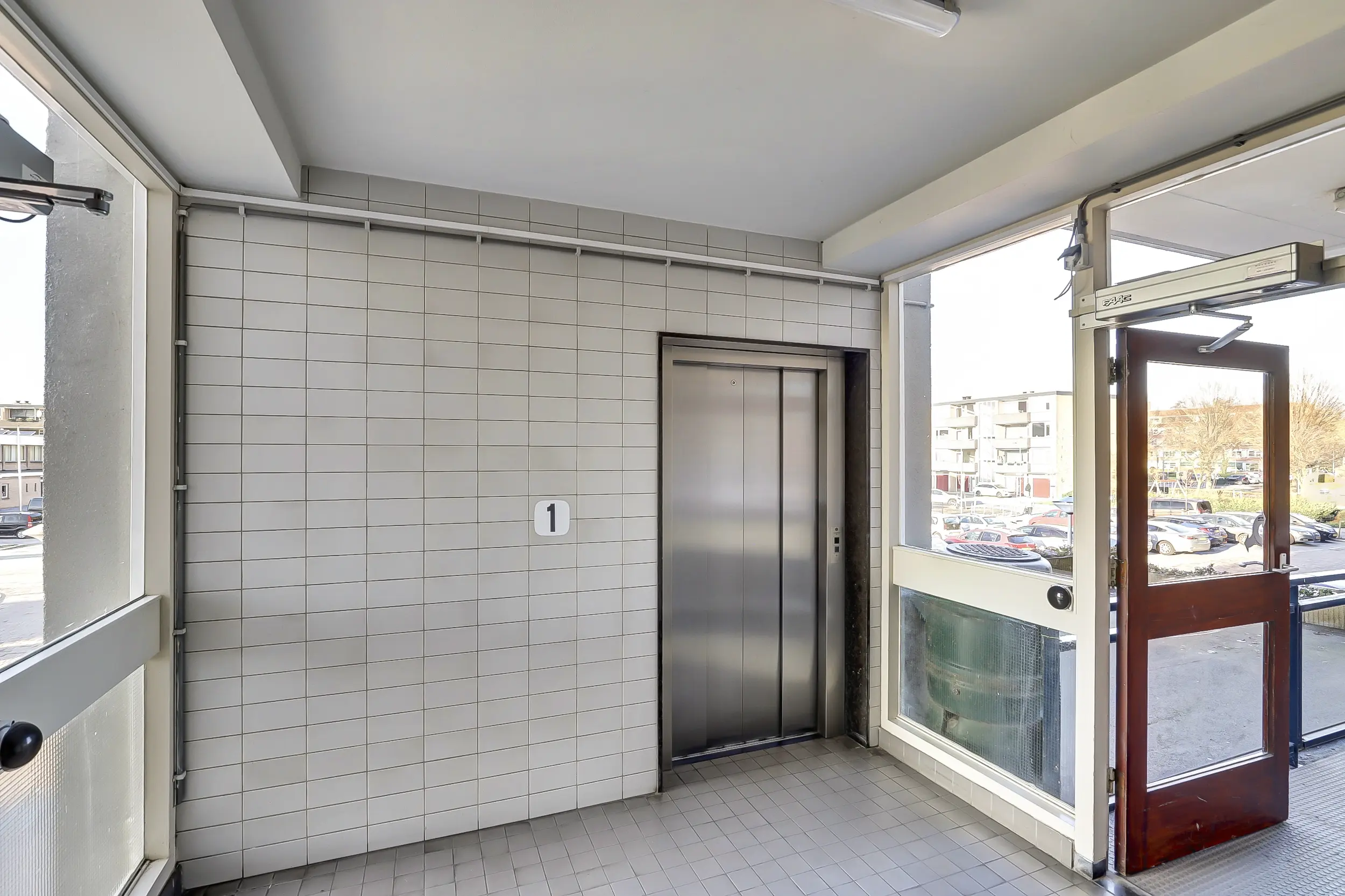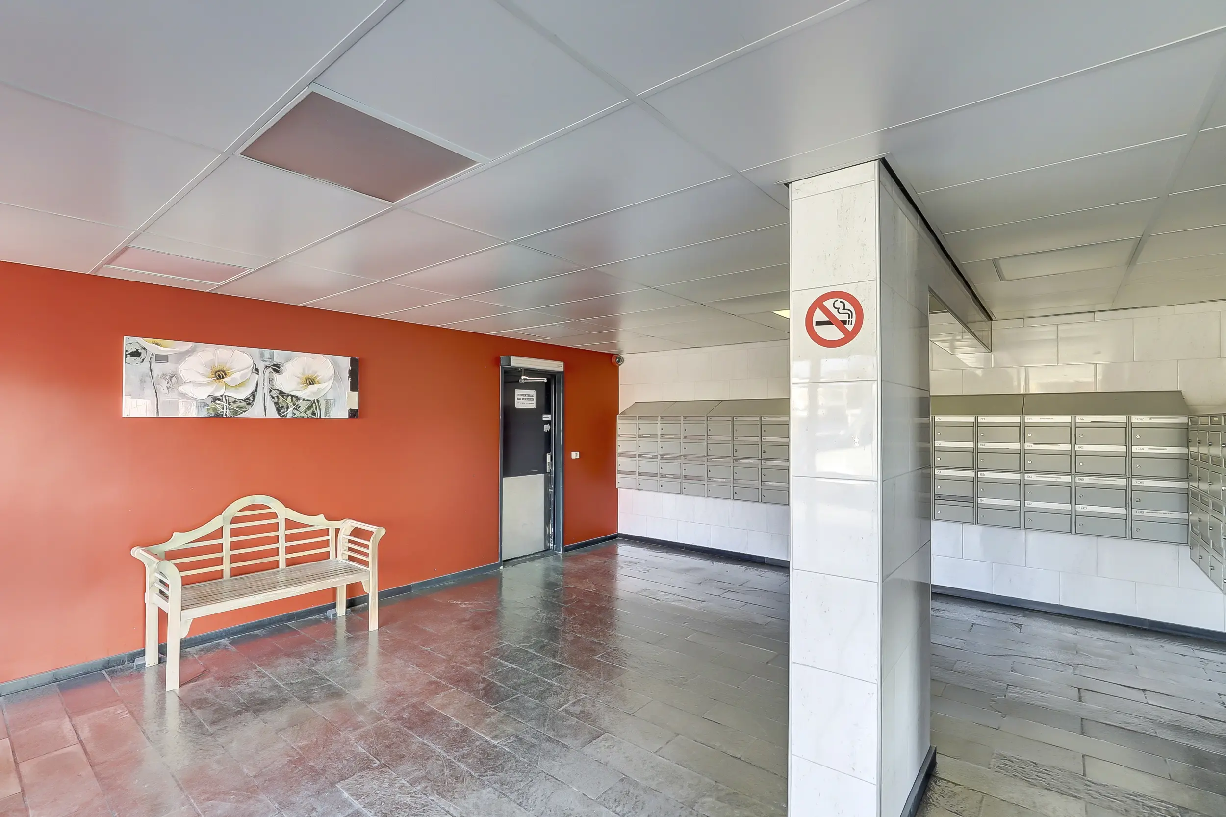 Via de entree aan de voorzijde van het complex stap je binnen in een verzorgde en uitnodigende ontvangstruimte. Hier is alles overzichtelijk geregeld: een modern videofoon systeem met camerabewaking, een brieven- en bellentableau, toegang tot de liften en het trappenhuis én de doorgang naar de bergingen.
