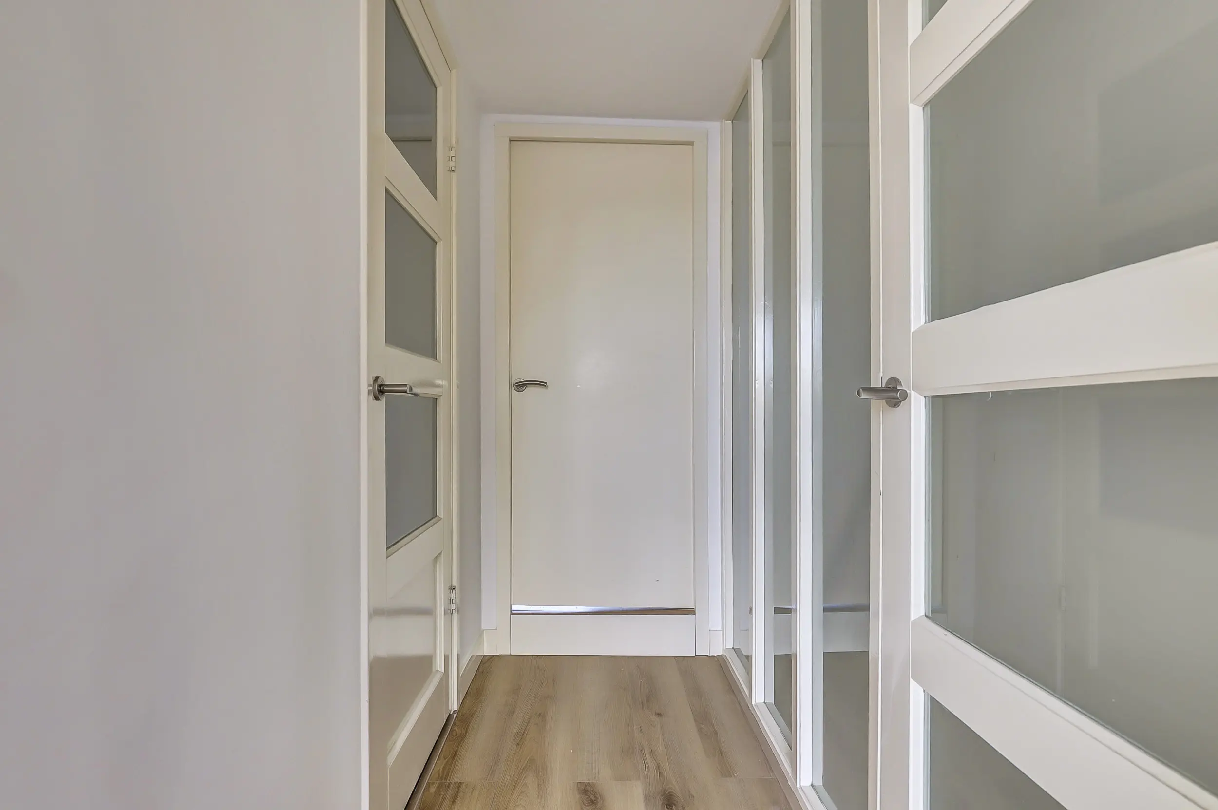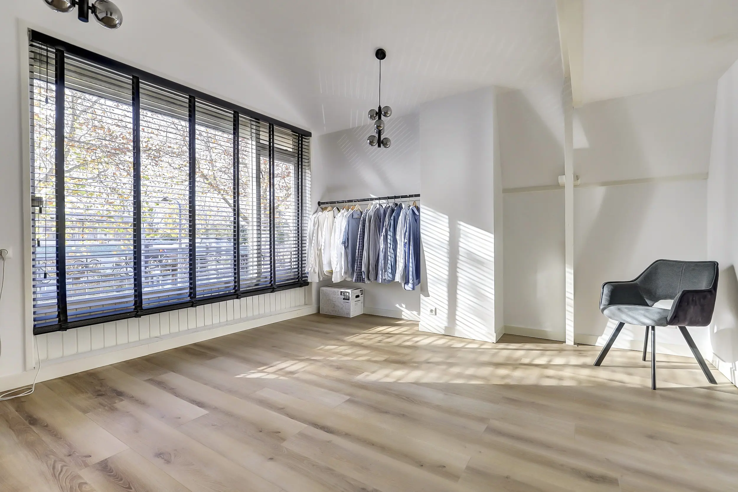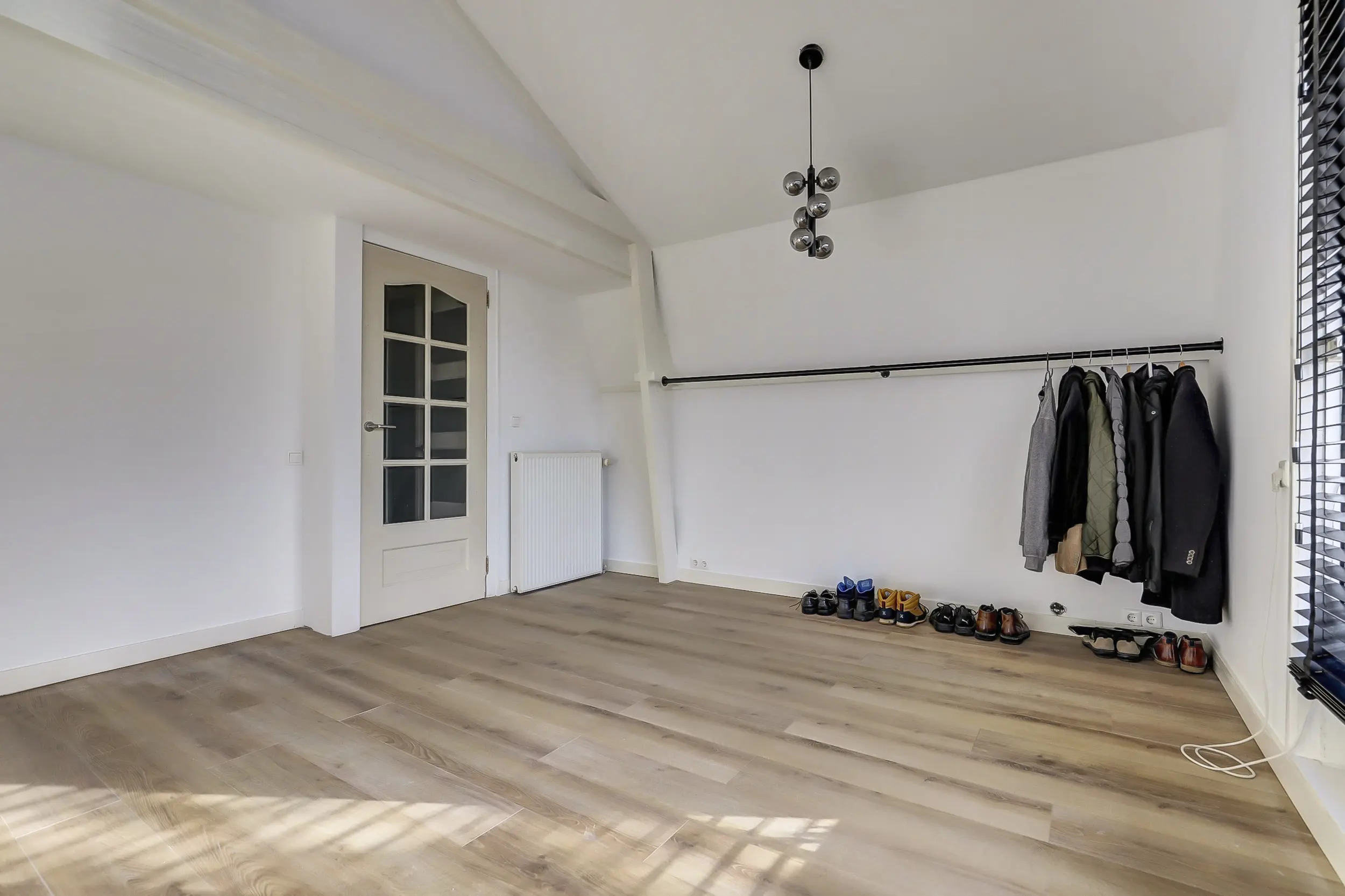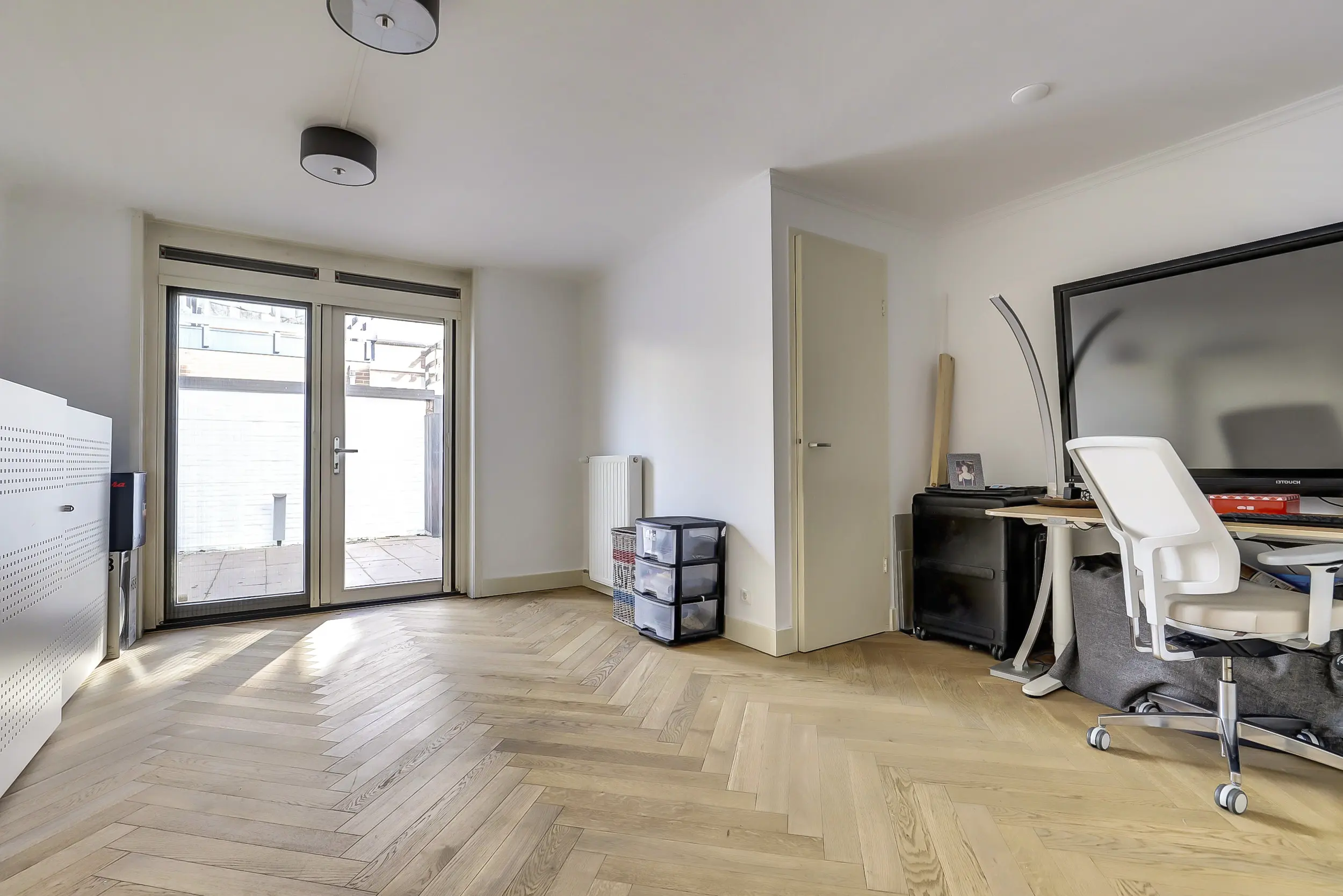 Aansluitend bevindt zich een multifunctionele ruimte met openslaande deuren naar de achtertuin. Deze ruimte kan dienst doen als eetkamer, maar ook als kantoor gehele begane grond is voorzien van een hoogwaardige visgraat parketvloer (2020).