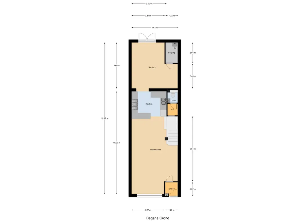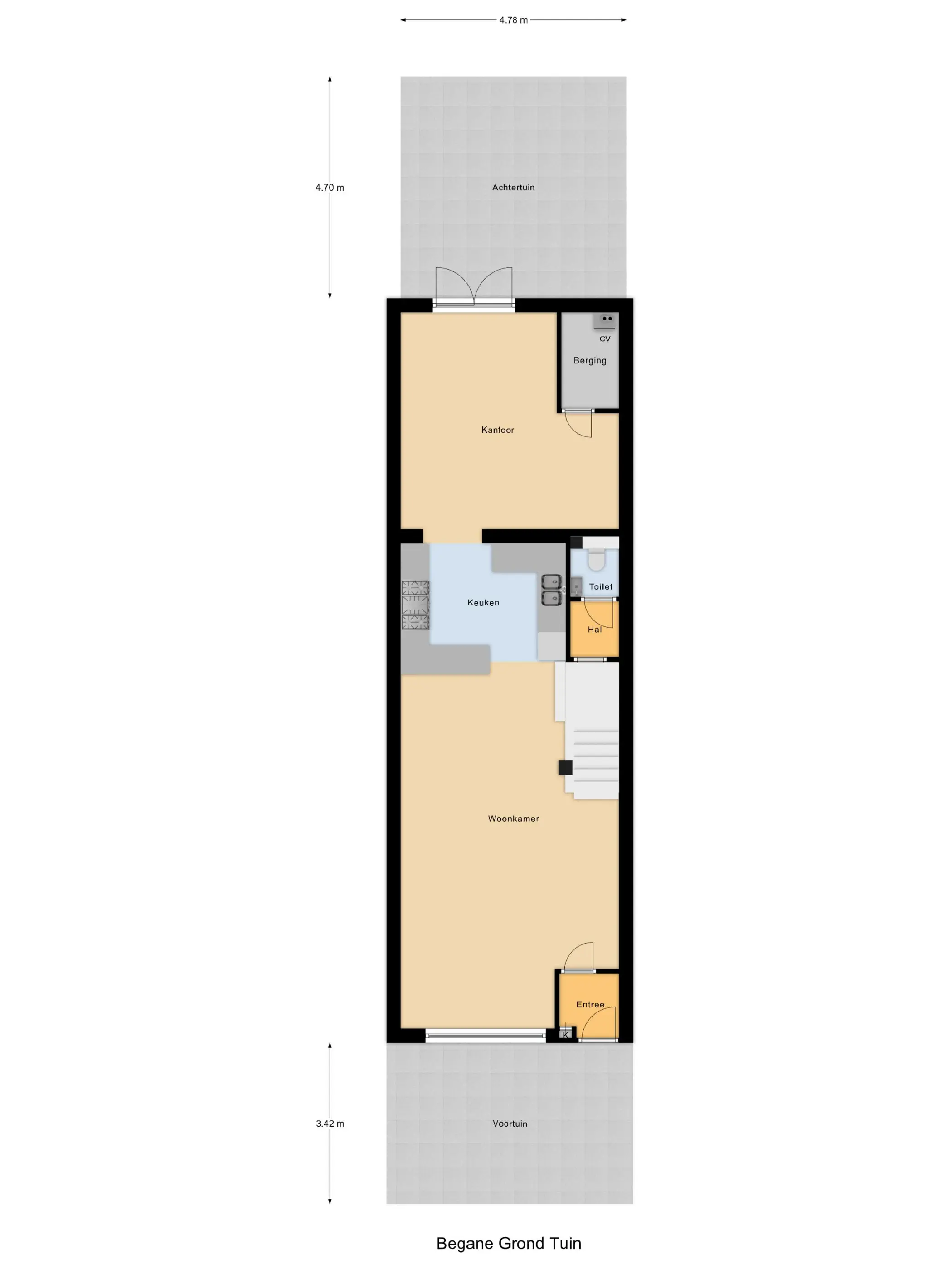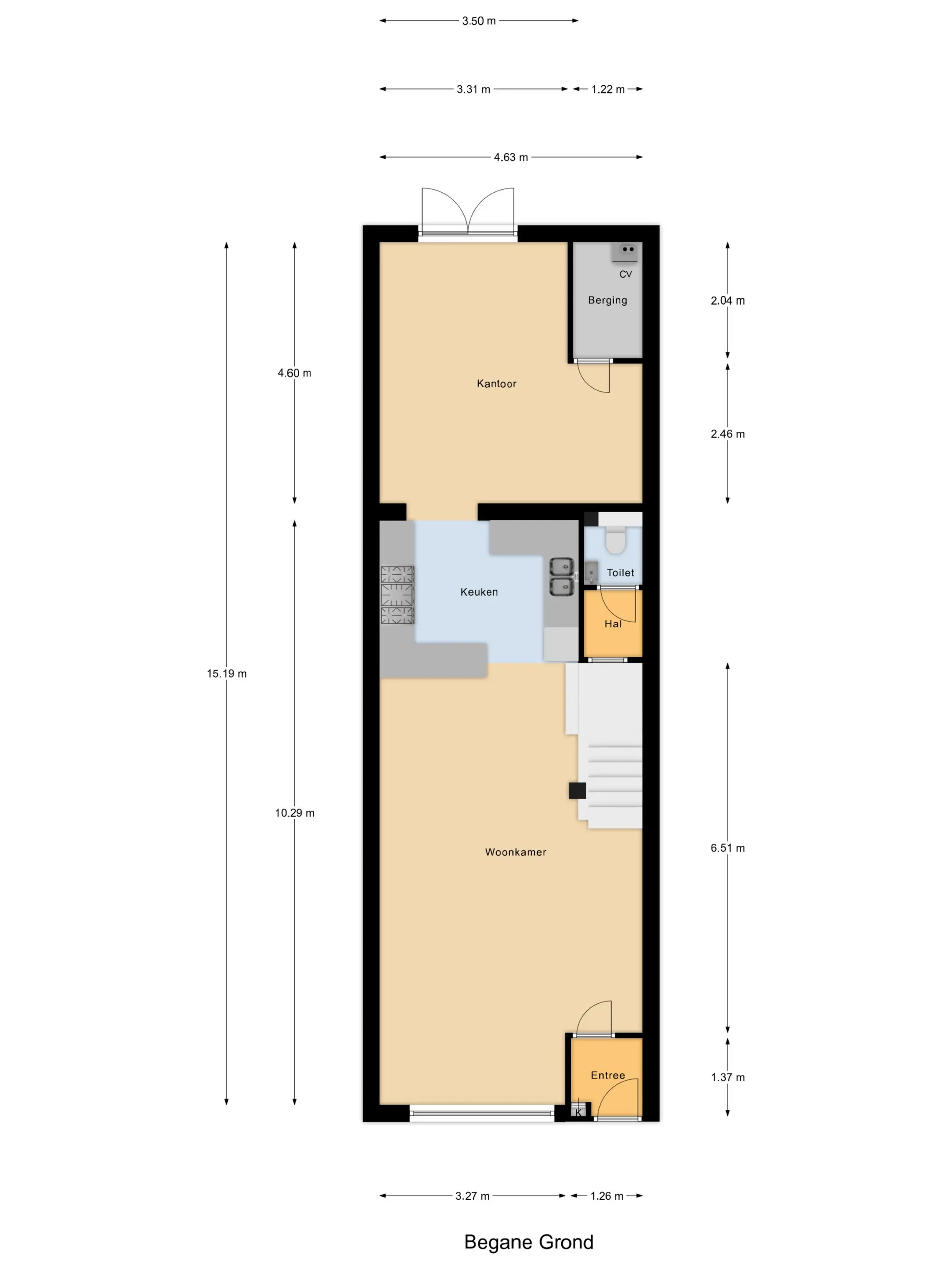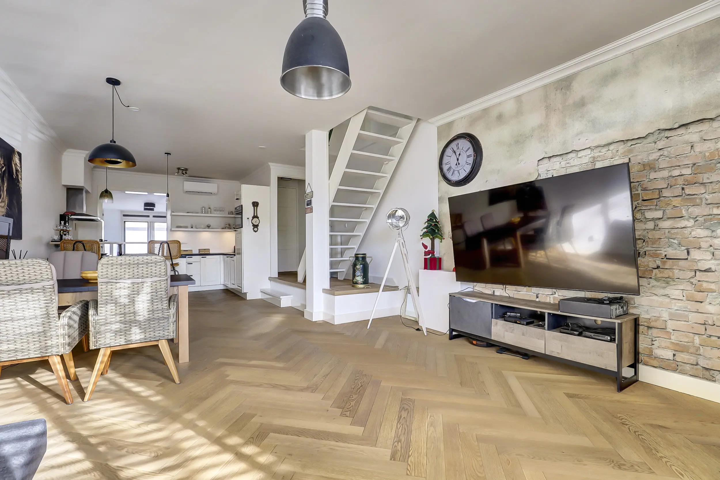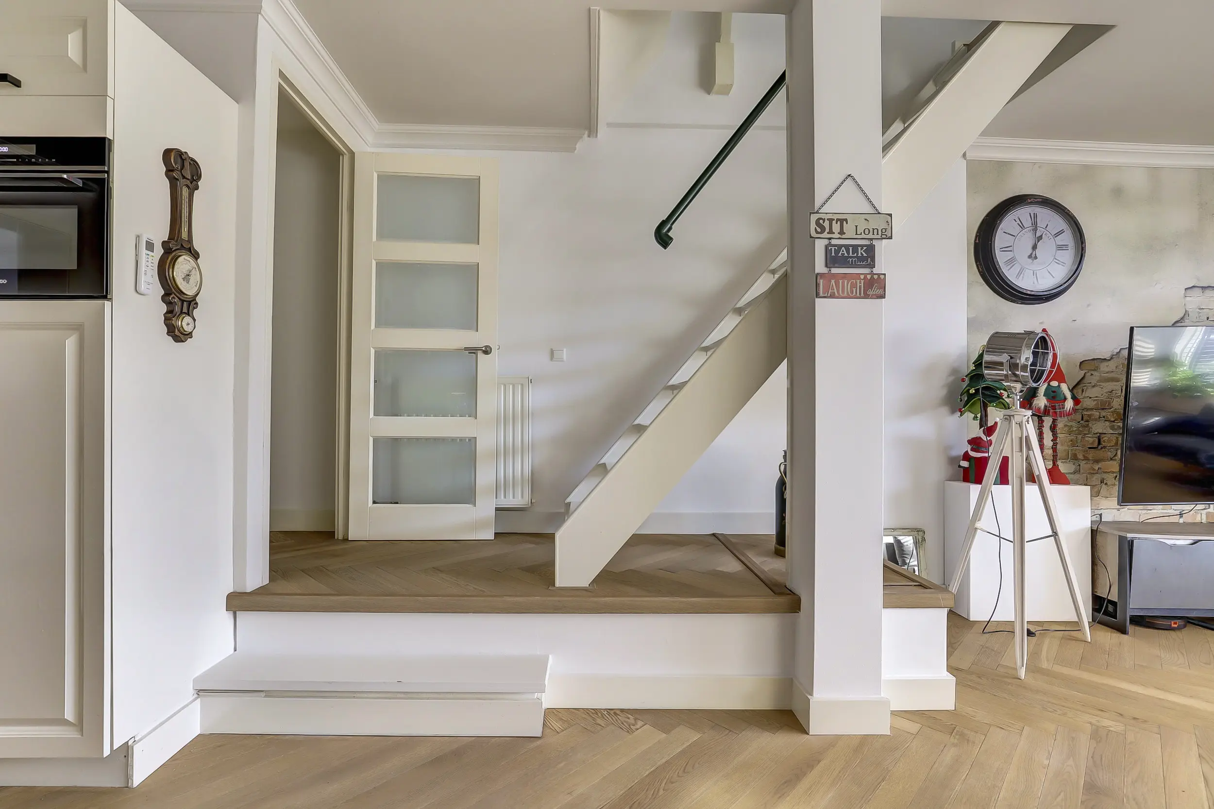 Entree via de voortuin naar de hal met meterkast. De sfeervolle living strekt zich uit over maar liefst 7,75 meter diep en biedt een ruime zithoek aan de voorzijde, een open trap en toegang tot het moderne toilet met fonteintje.