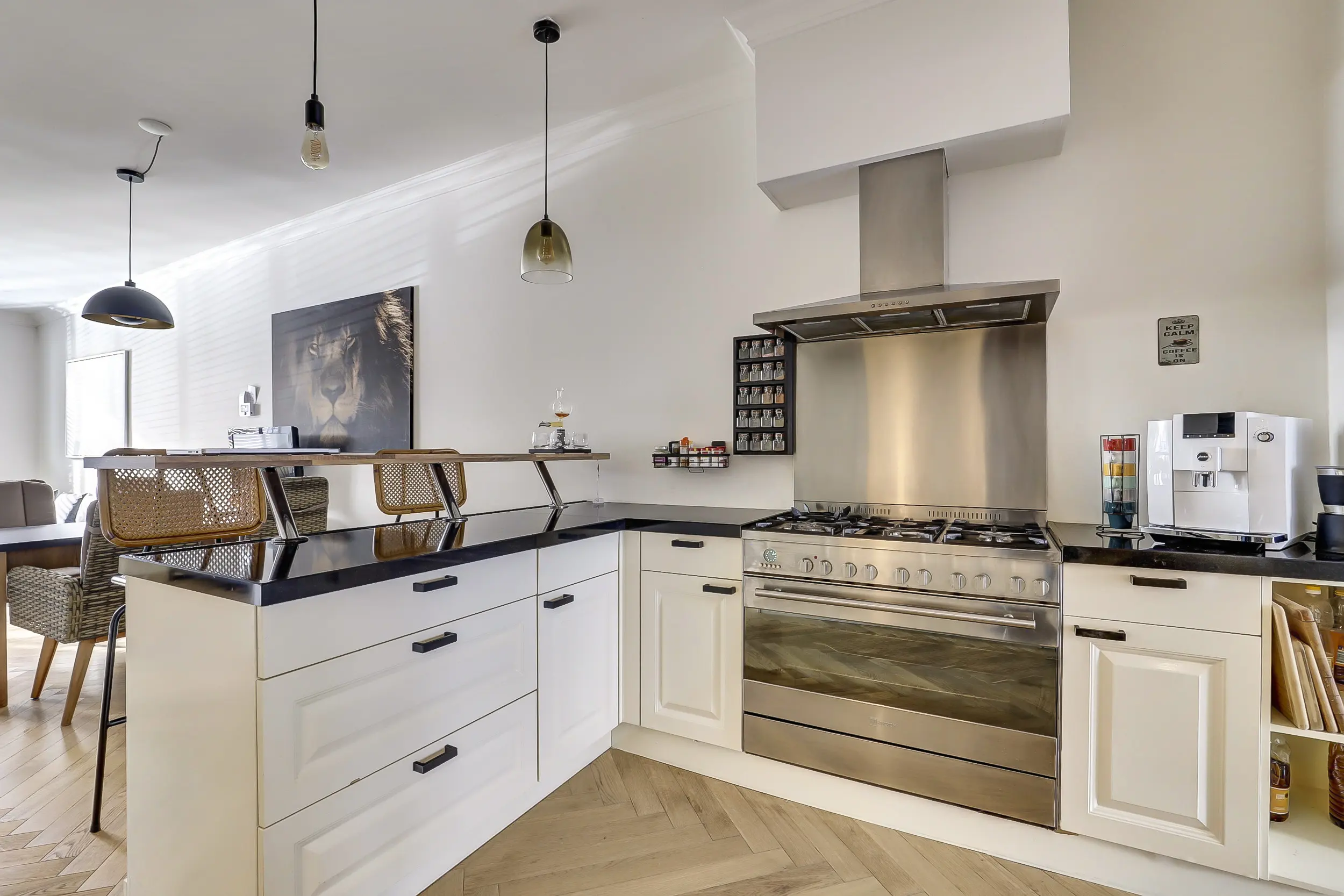In het hart van de woning ligt de keuken, met een dubbele opstelling, granieten werkblad, RVS-fornuis met 6 pitten, afzuigkap, vaatwasser, koelkast, combioven en een gezellige eetbar.