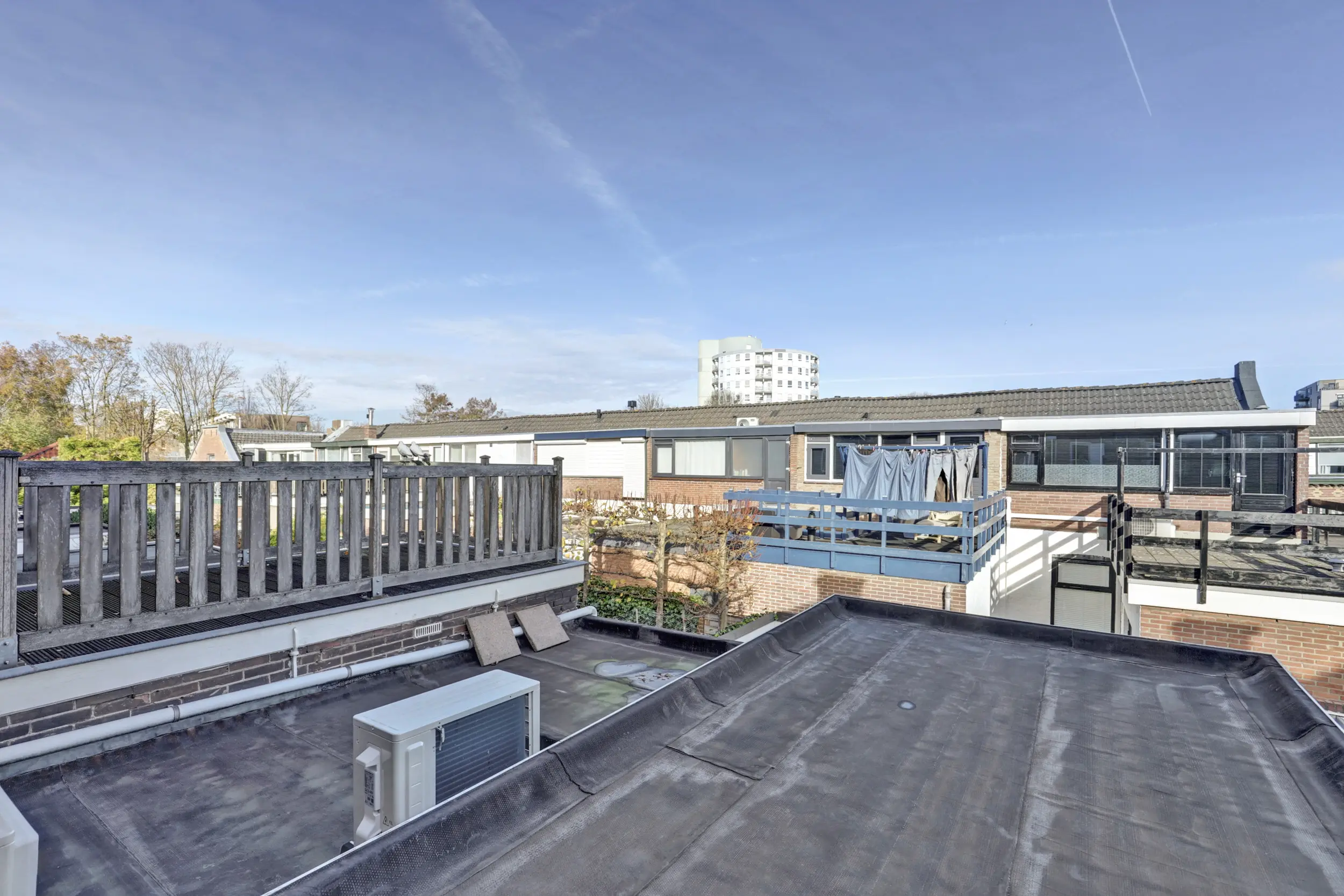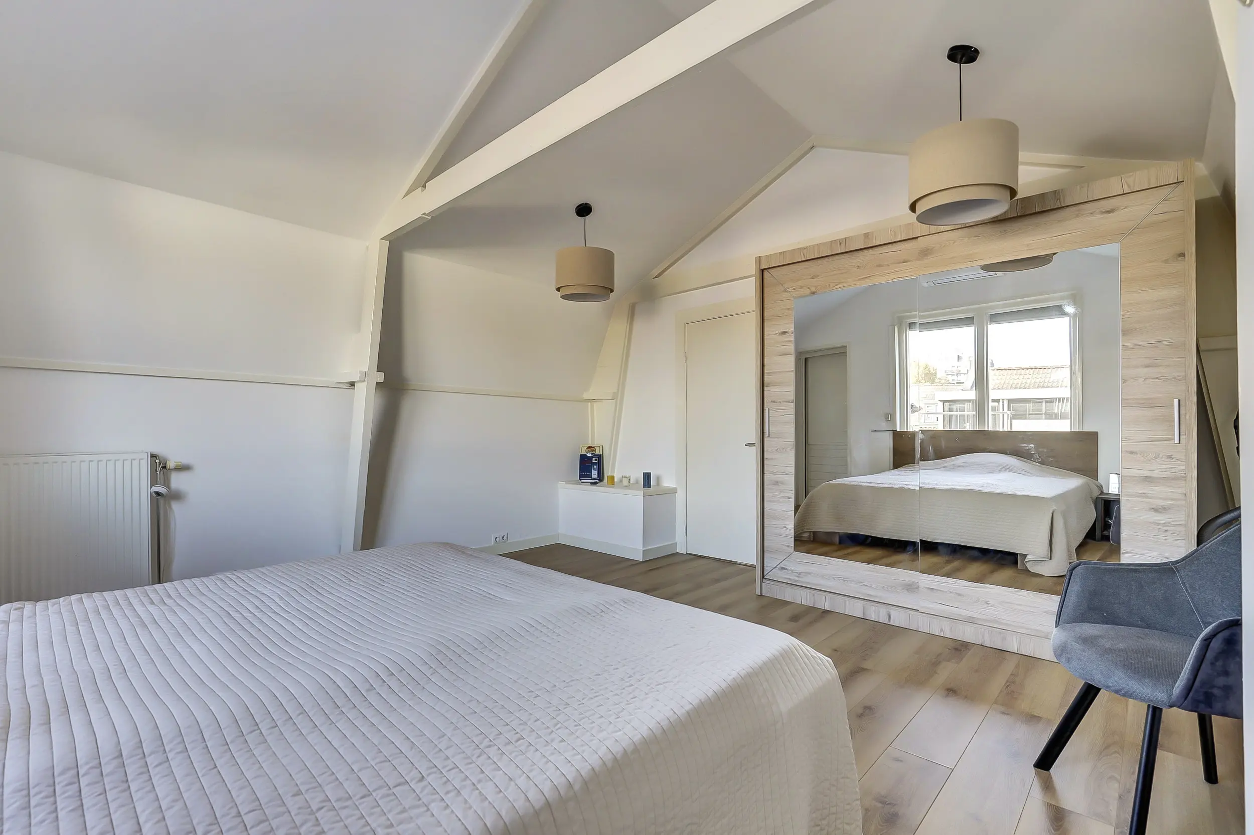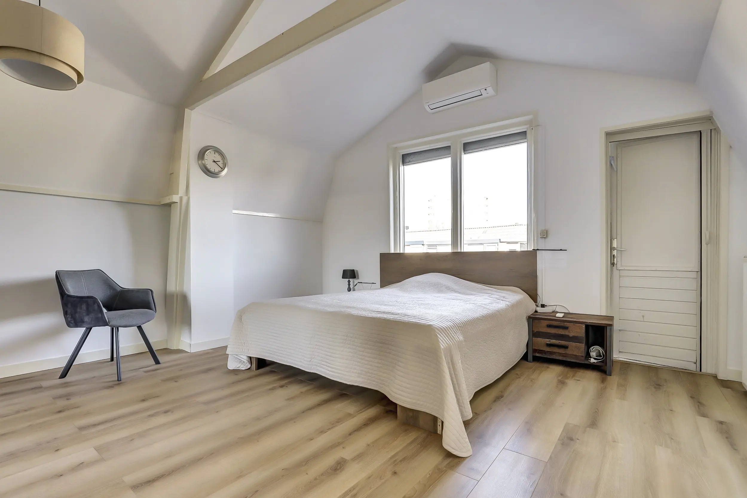 De hoofdslaapkamer aan de achterzijde heeft een open nok voor extra hoogte, airconditioning, elektrisch rolluik en toegang tot het platte dak van de uitbouw.