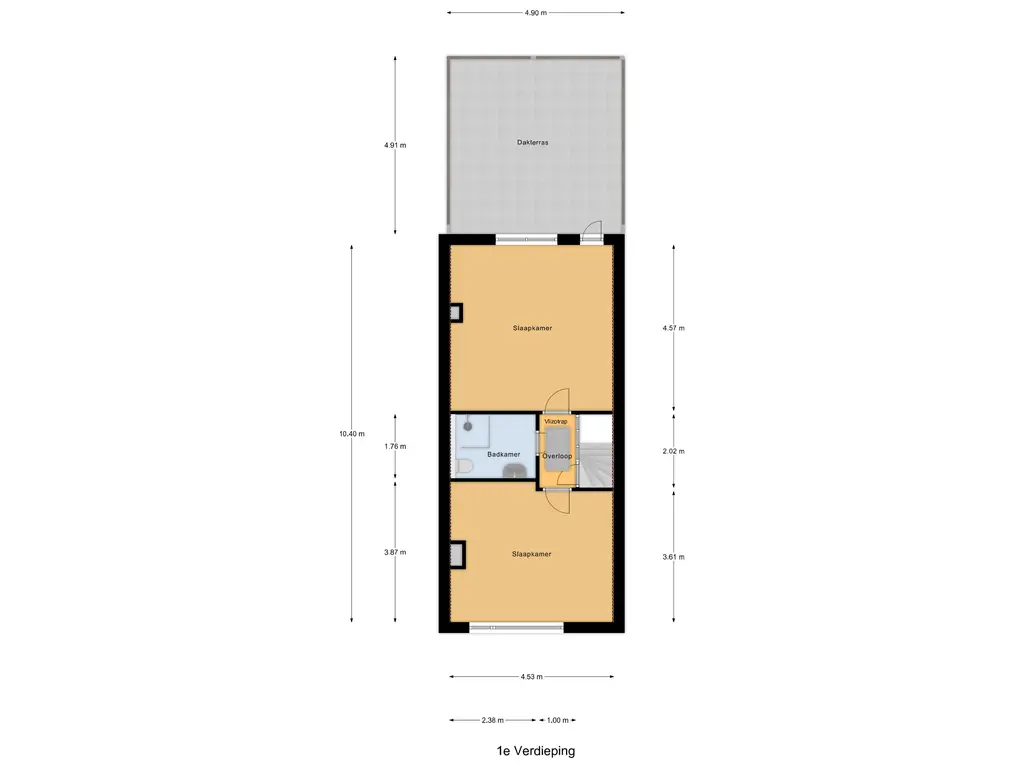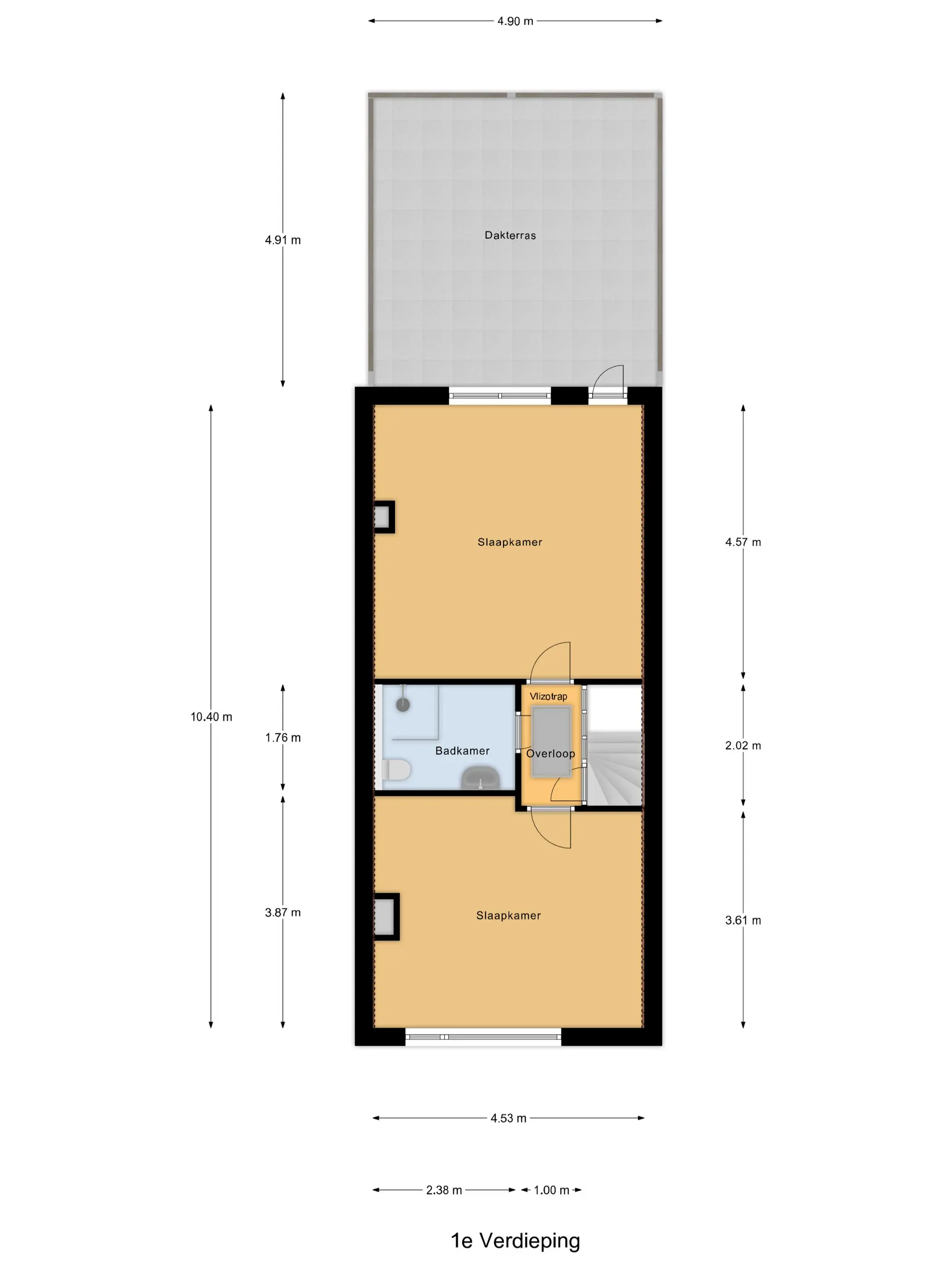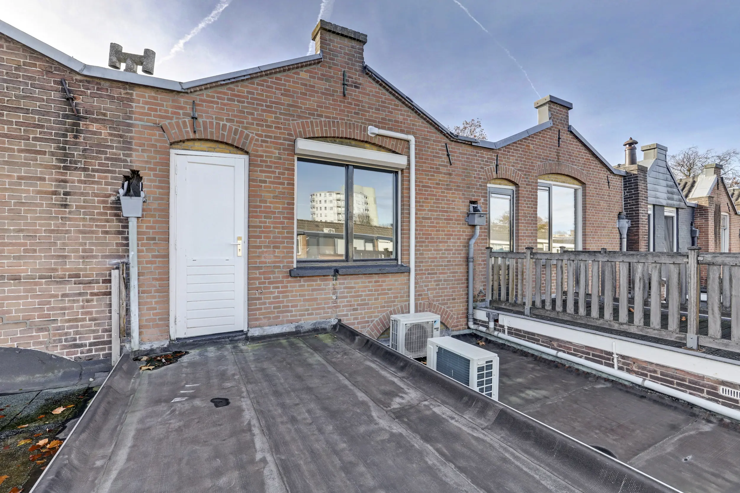 De hoofdslaapkamer aan de achterzijde heeft een open nok voor extra hoogte, airconditioning, elektrisch rolluik en toegang tot het platte dak van de uitbouw.