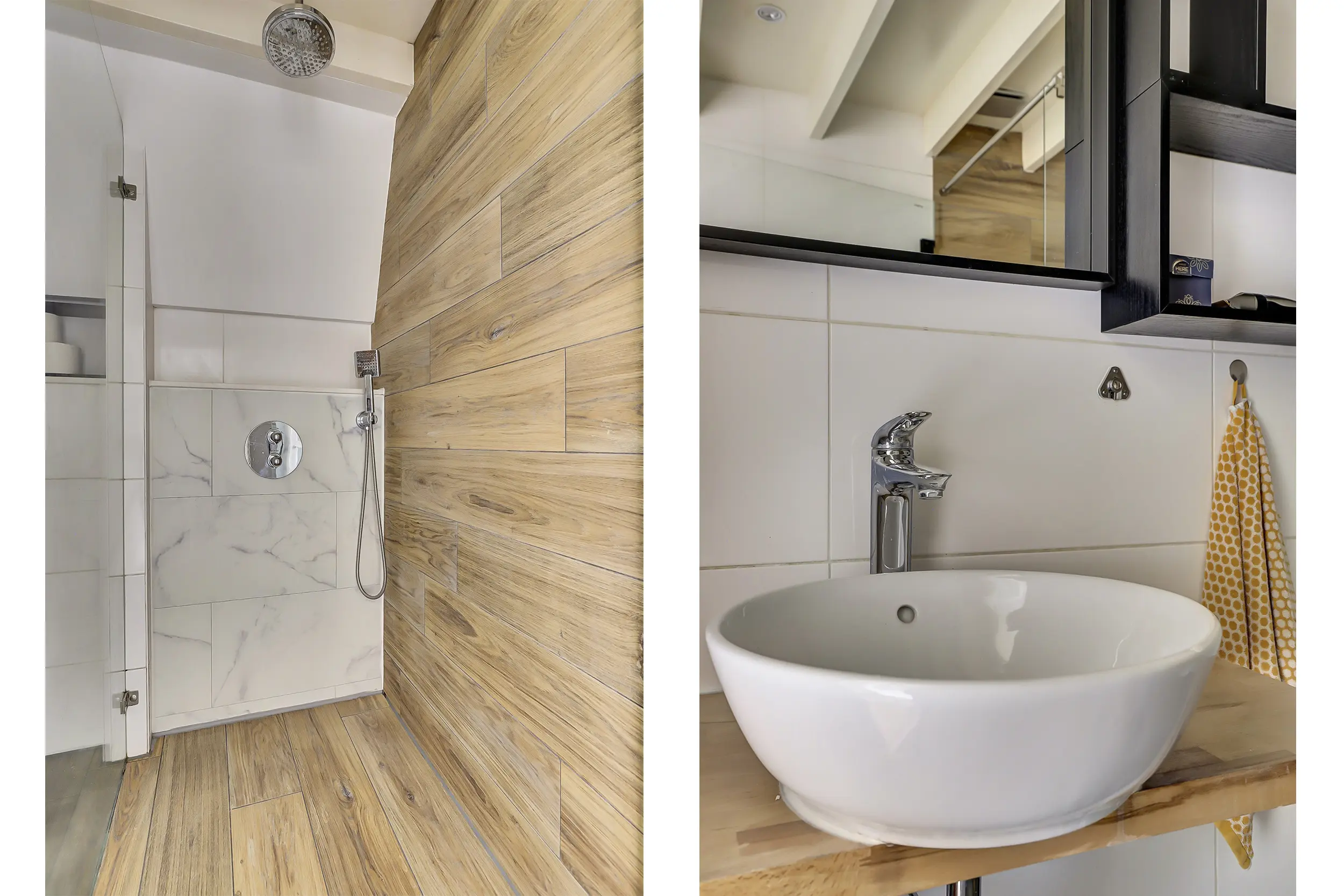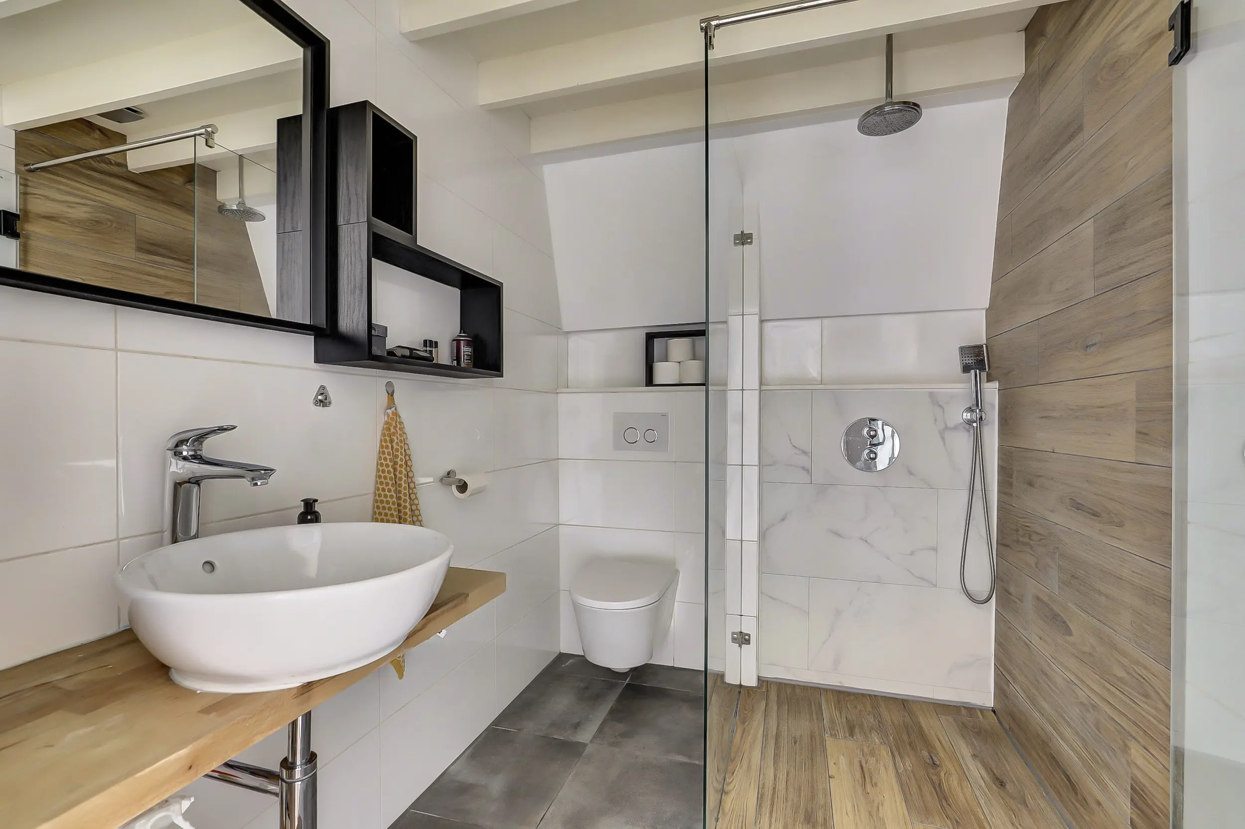 De badkamer is stijlvol ingericht met een inloopdouche (regendouche, handdouche, easydrain), tweede toilet en modern wastafelmeubel met verwarmde spiegel.