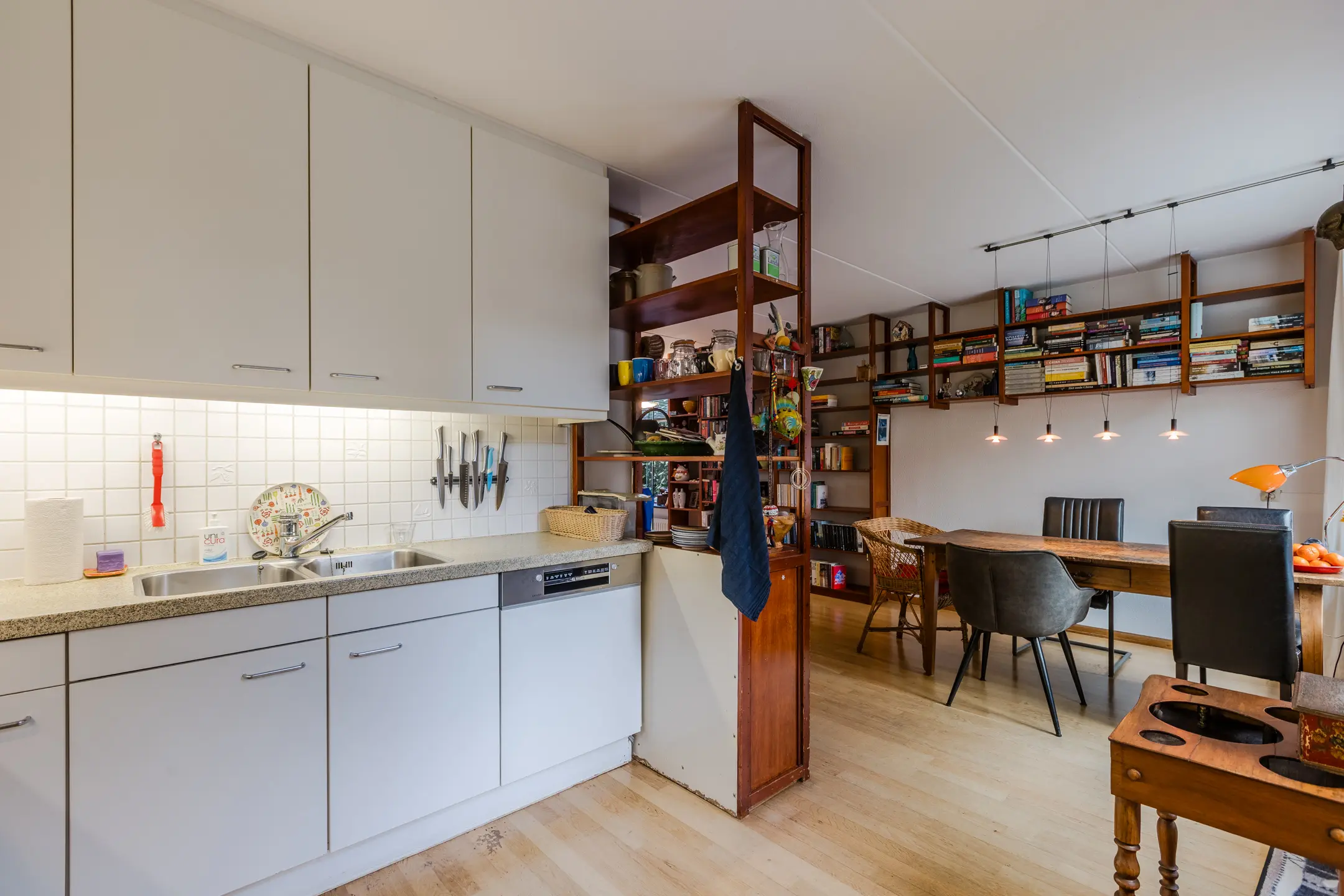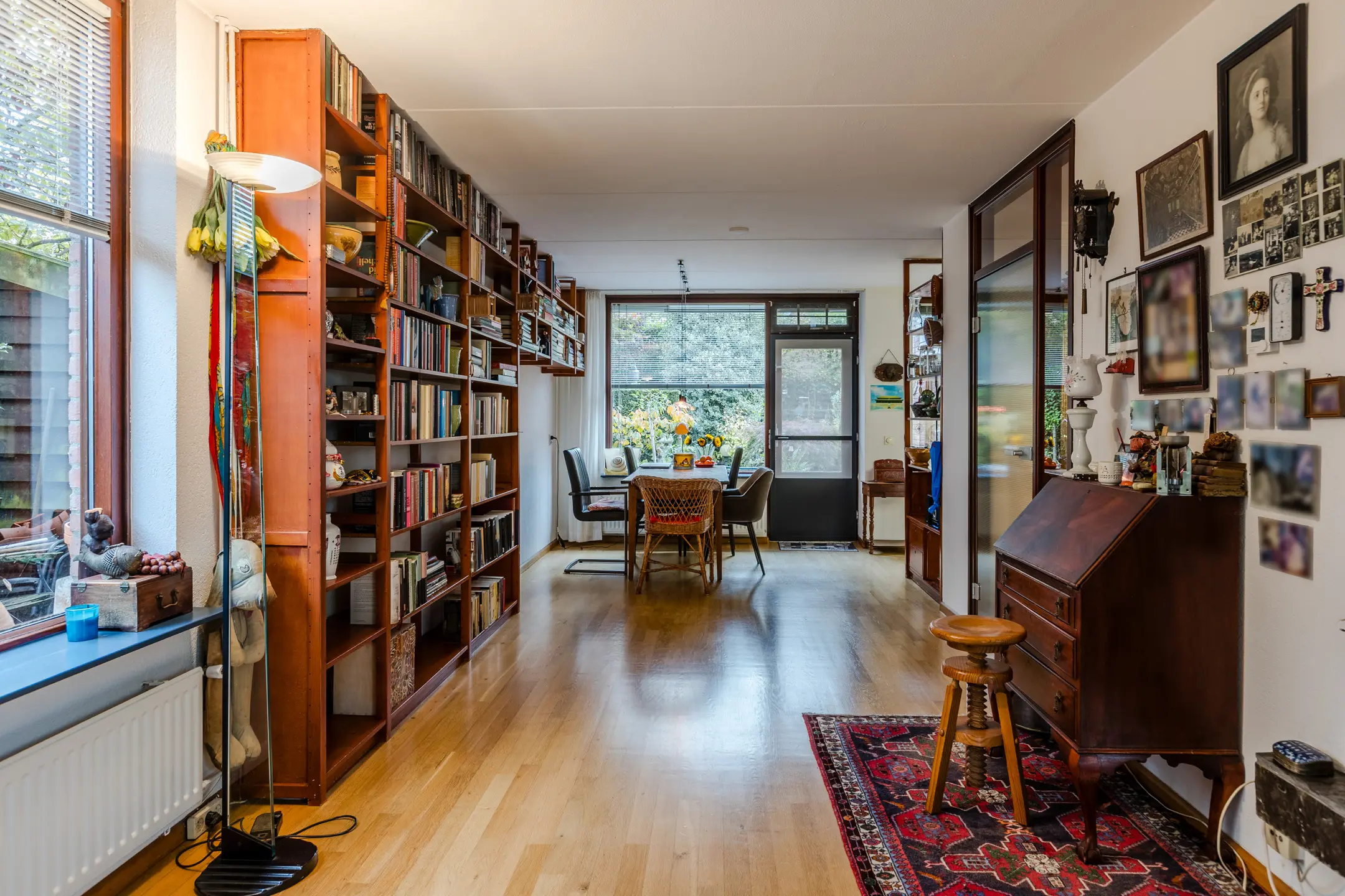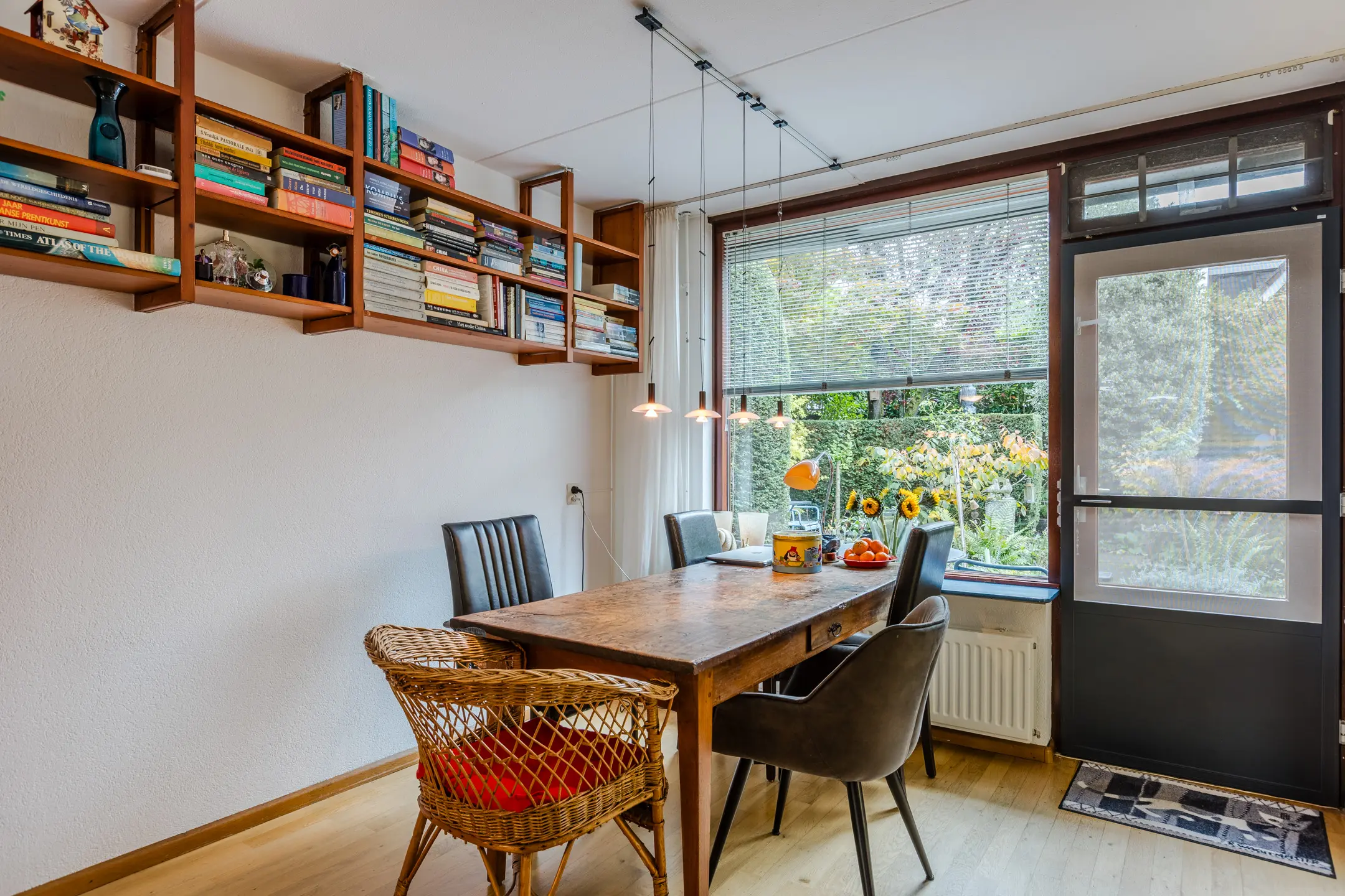 Aan de achterzijde bevindt zich de eetkamer, die in open verbinding staat met de keuken. Terwijl je kookt, kijk je uit over de zonnige tuin – ideaal voor wie graag met de tuindeuren open kookt of dineert met uitzicht op het groen.