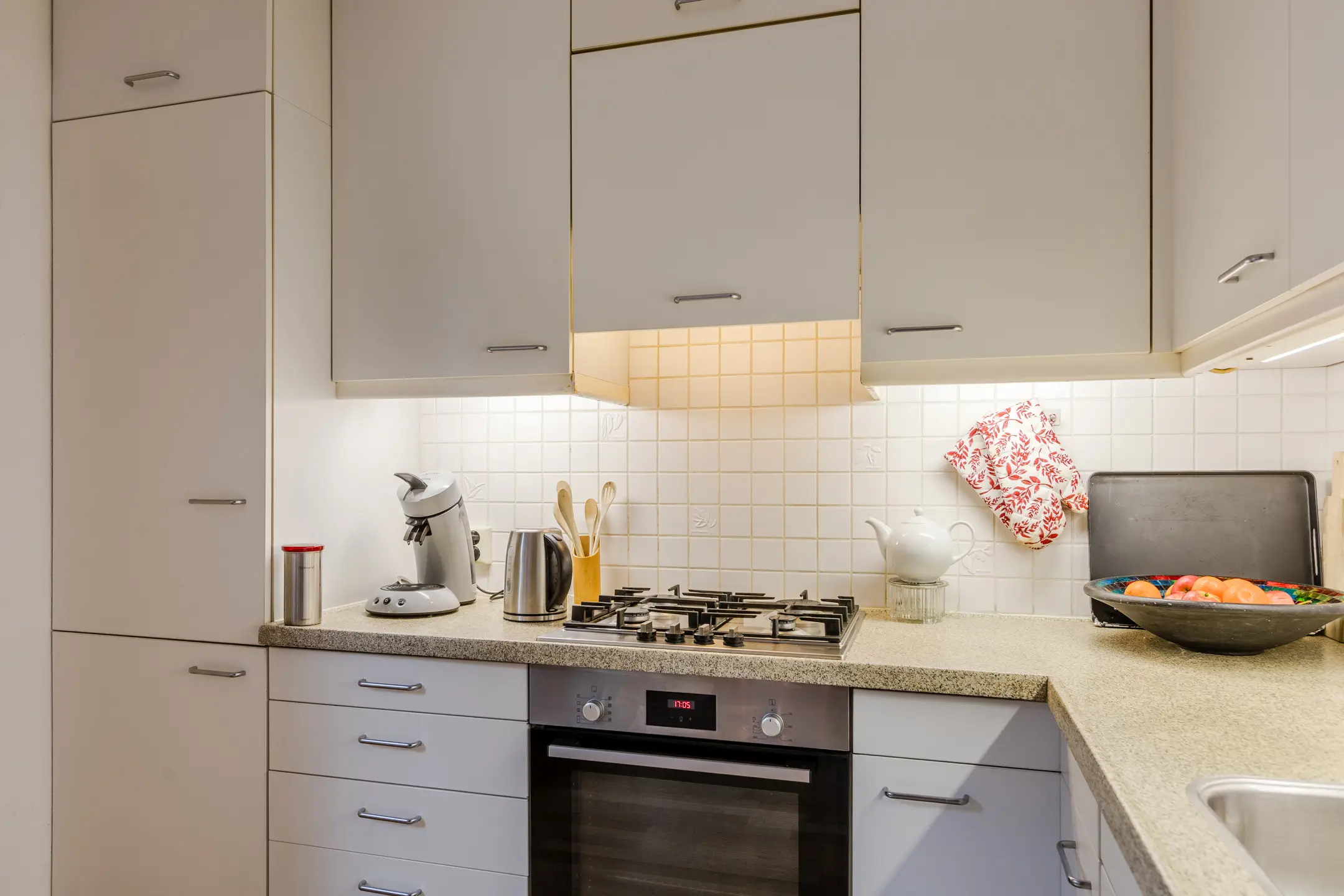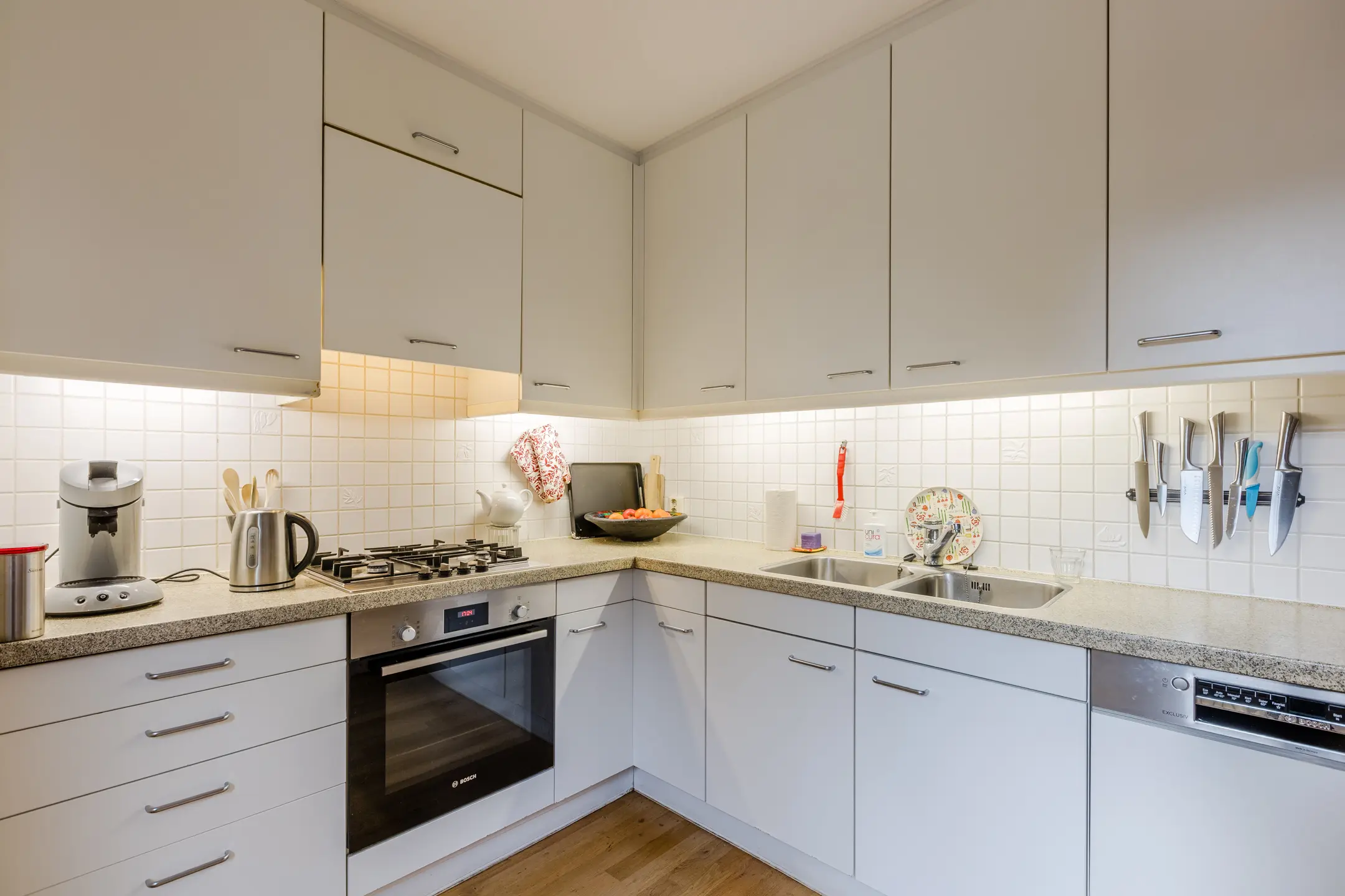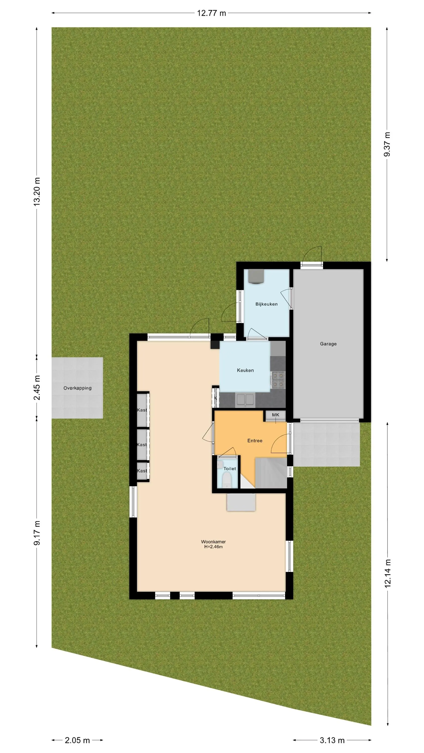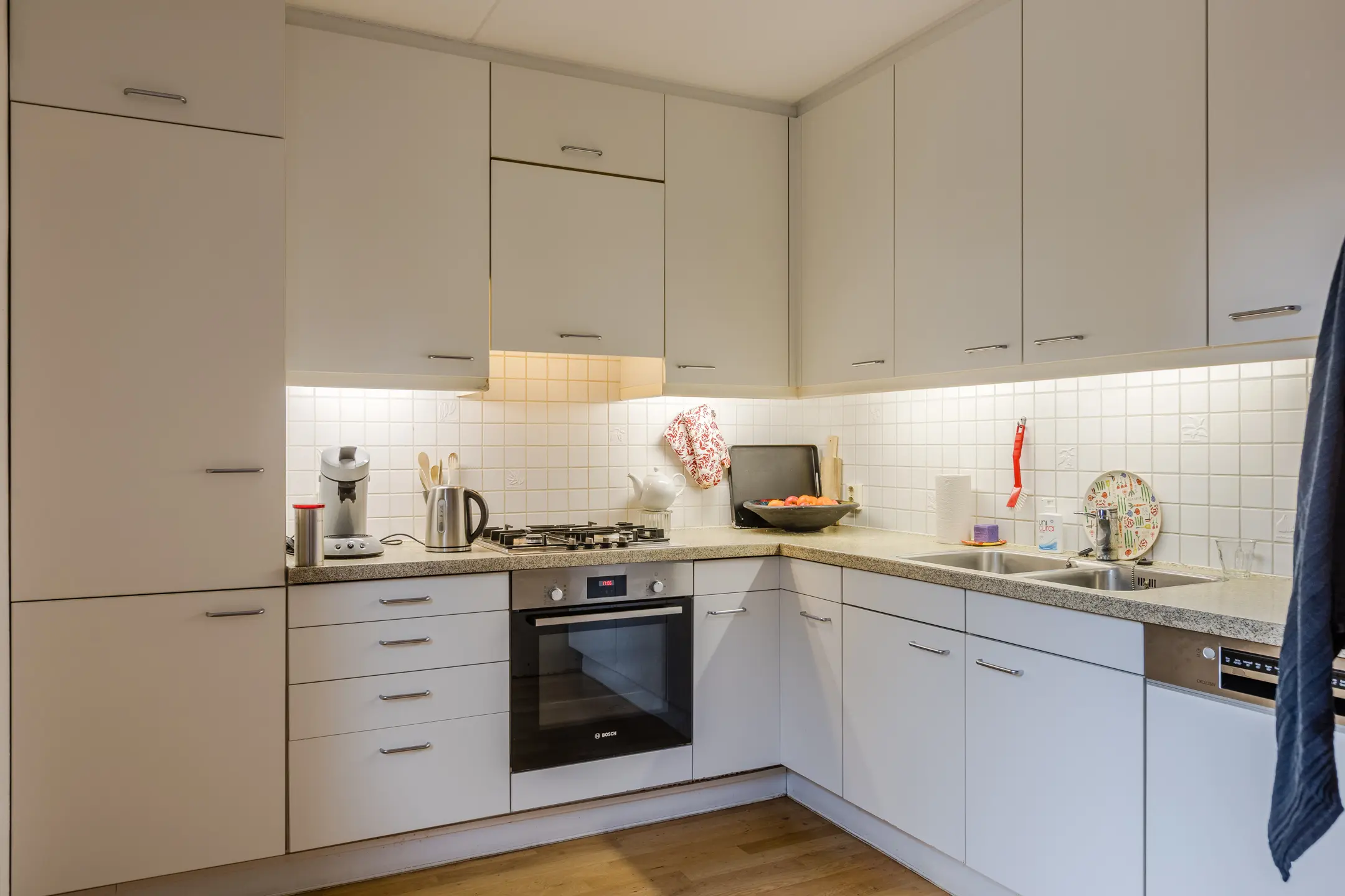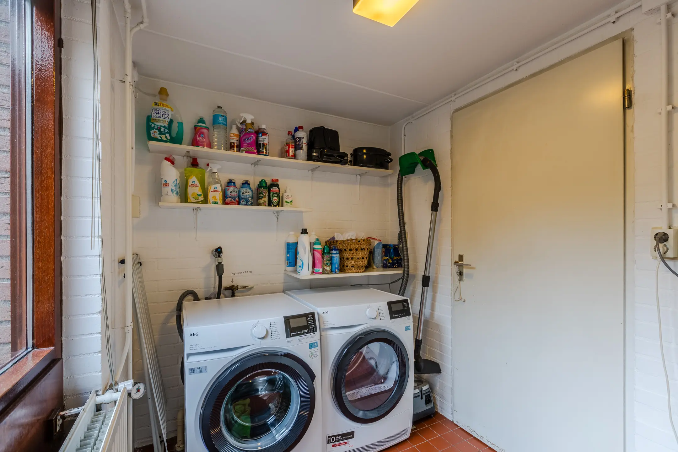 Aansluitend aan de keuken ligt de praktische bijkeuken met aansluitingen voor wasmachine en droger. Vanuit hier heb je directe toegang tot de achtertuin én de inpandige garage. Ook vanuit de woonkamer, keuken en garage kun je zo de tuin in stappen – dat geeft een heerlijk gevoel van vrijheid en verbinding met buiten.