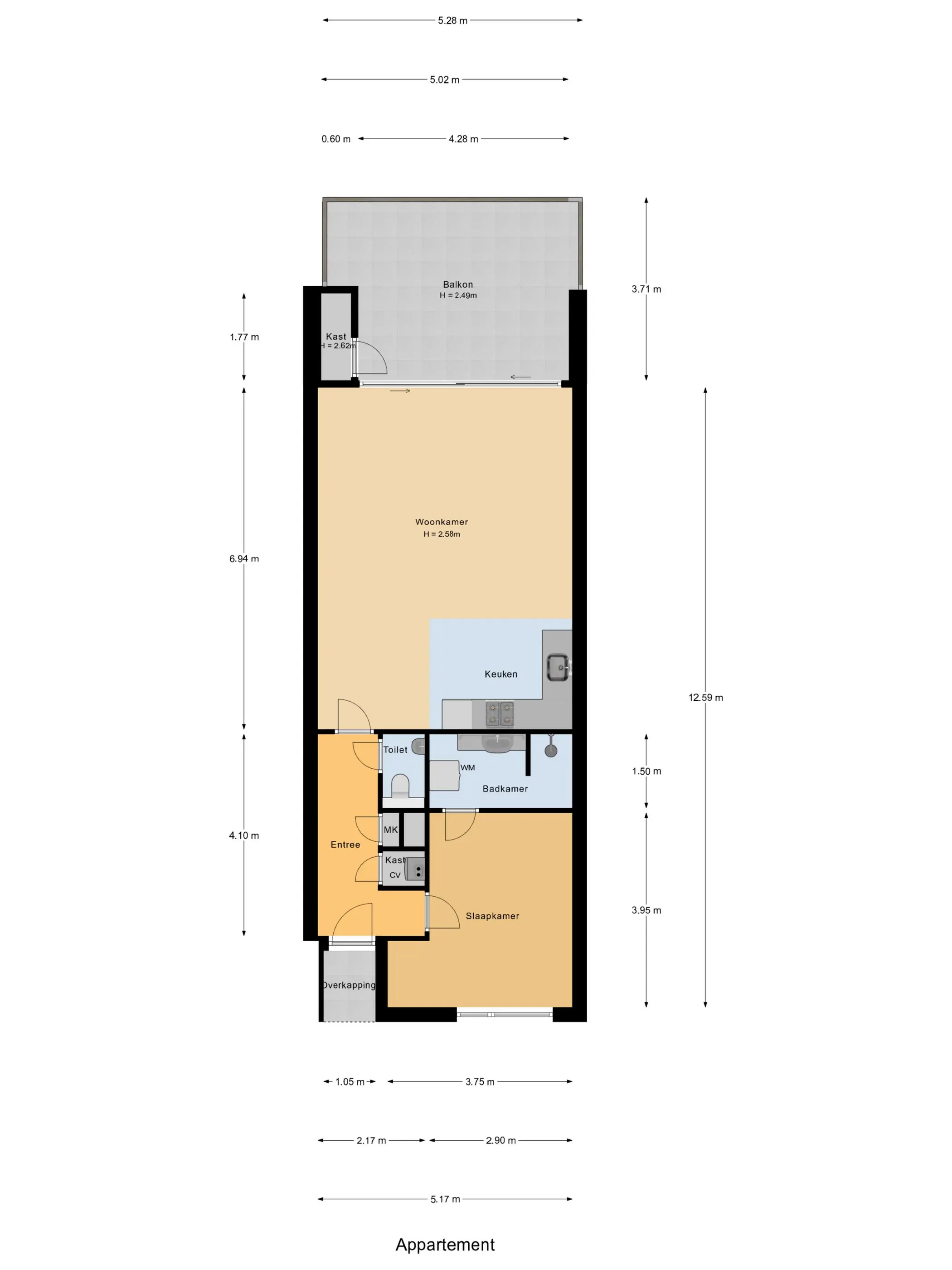Via de eigen voordeur komt u binnen in de hal van het appartement. Hier bevinden zich de meterkast, de toiletruimte en de stookruimte met opstelling van de CV-combiketel (2006).
