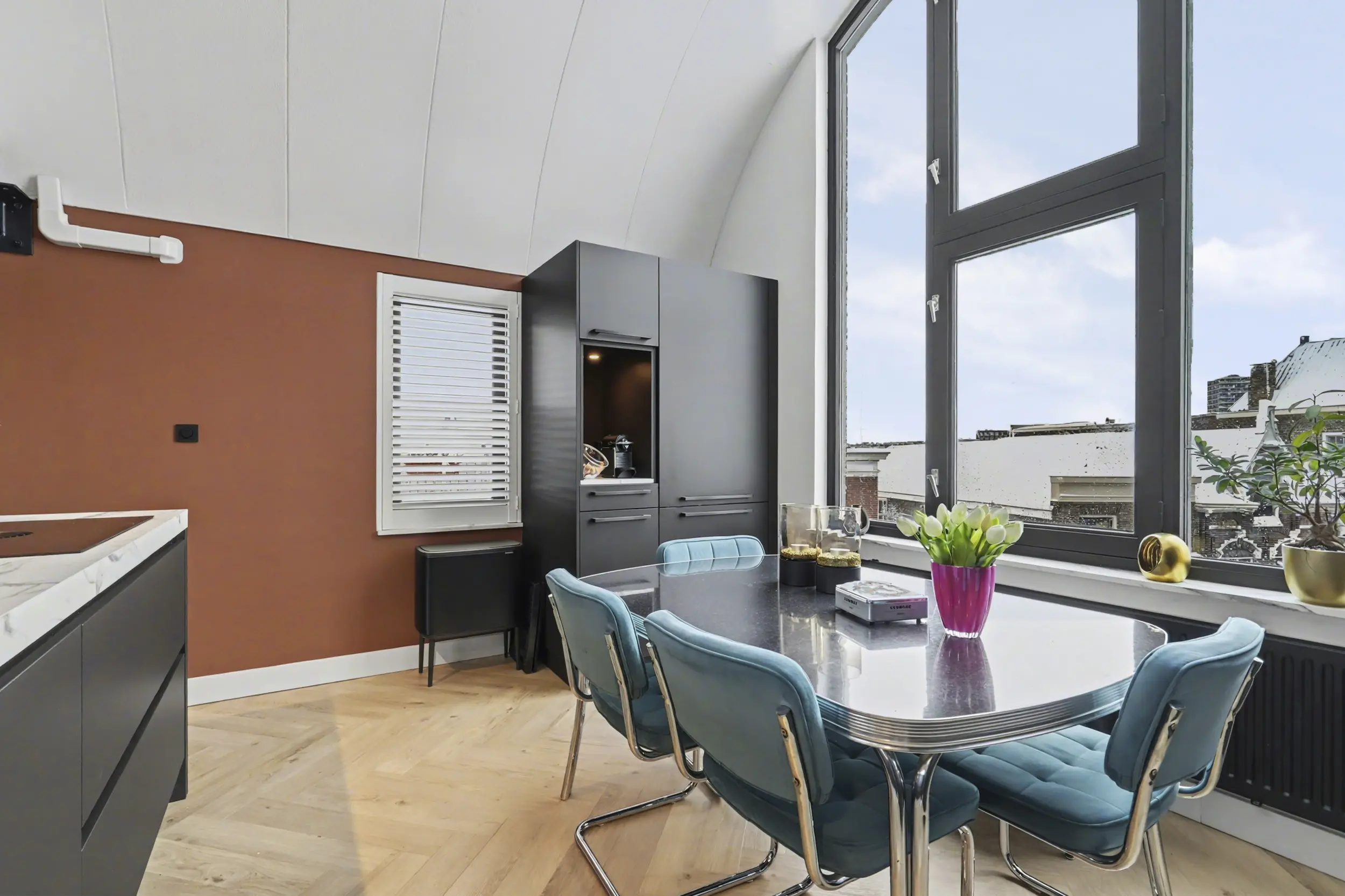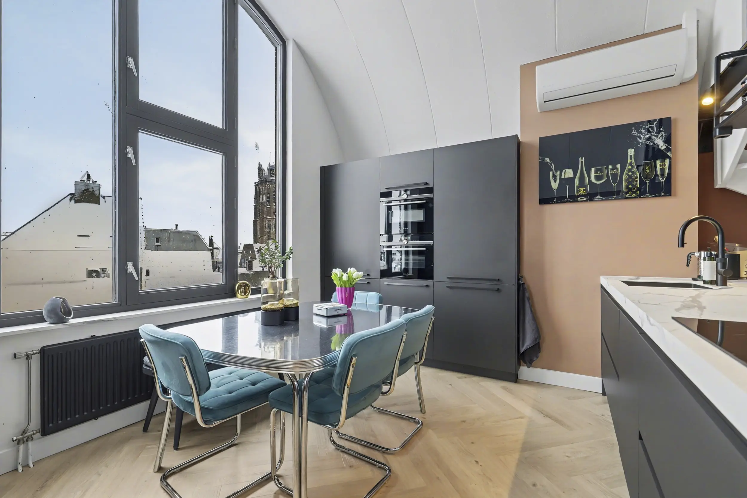 Stel je voor: je opent ’s ochtends de shutters en kijkt uit op de spoorbrug, de Grote Kerk en de historische gevels van de binnenstad. Op Slikveld 44 woon je letterlijk tussen de Dordtse iconen, in een sfeervol appartement met geweldig zonneterras.