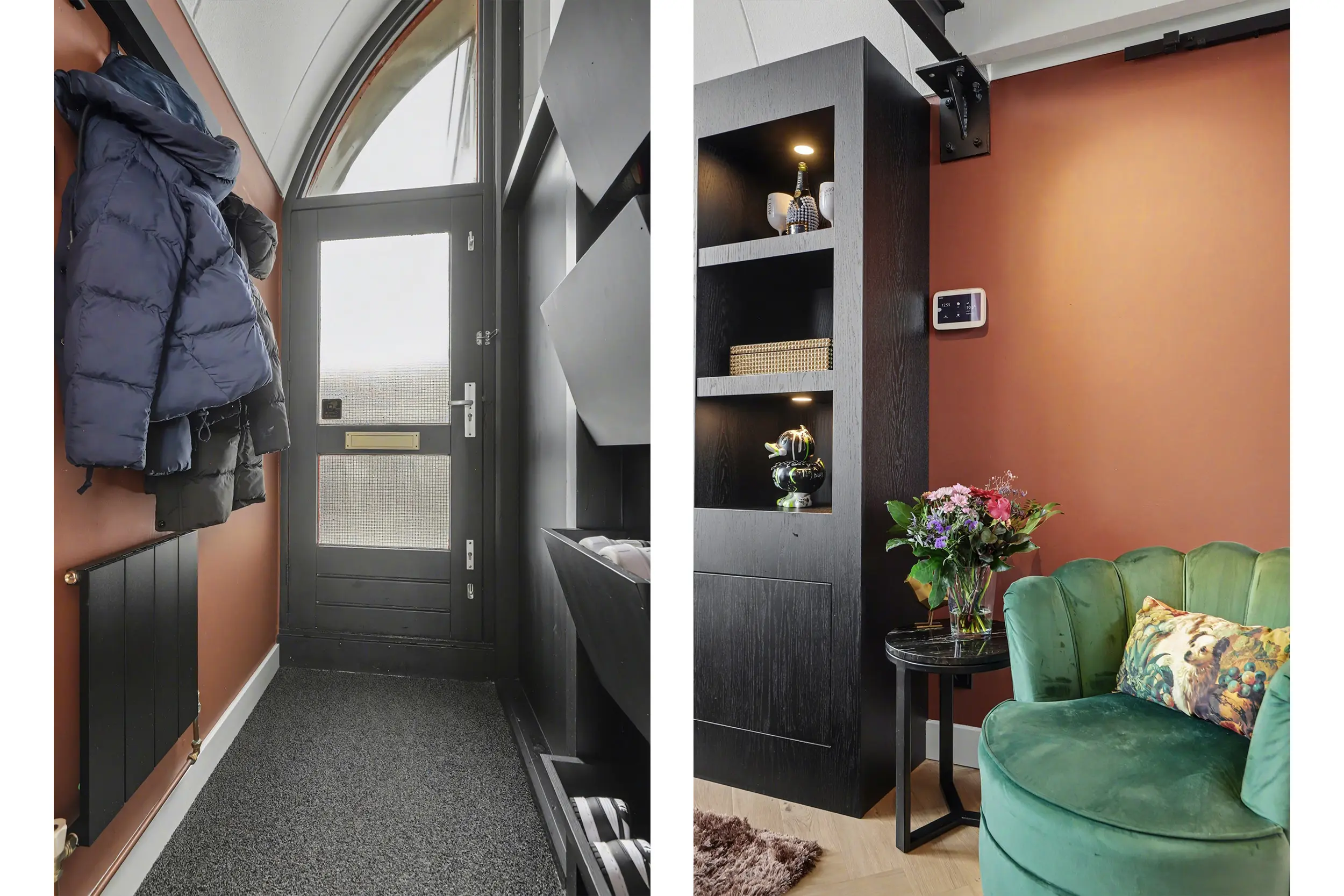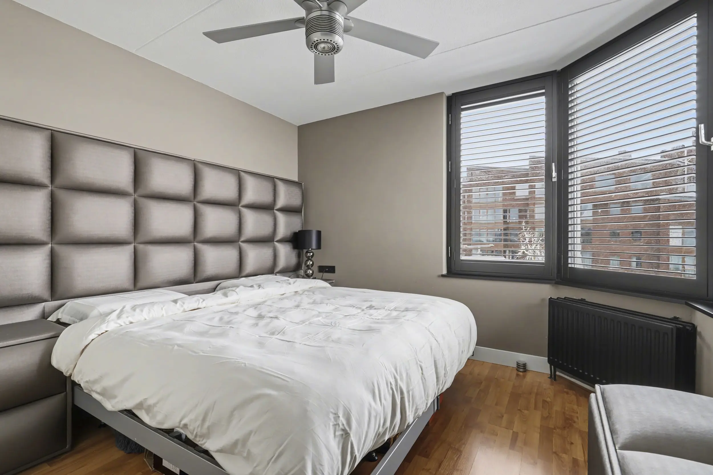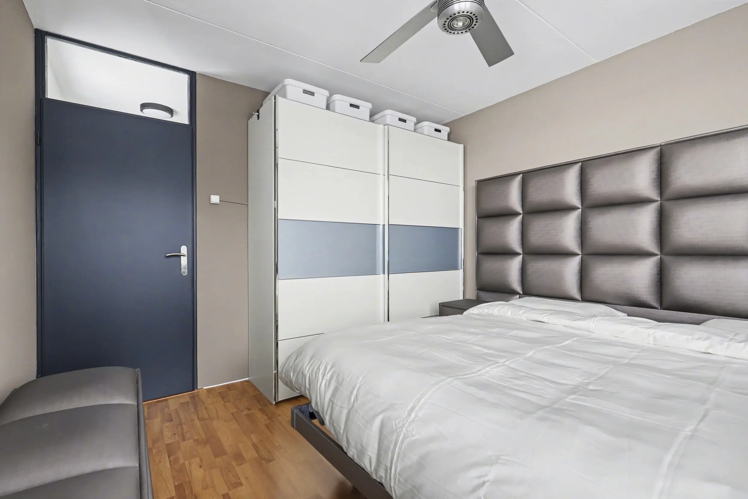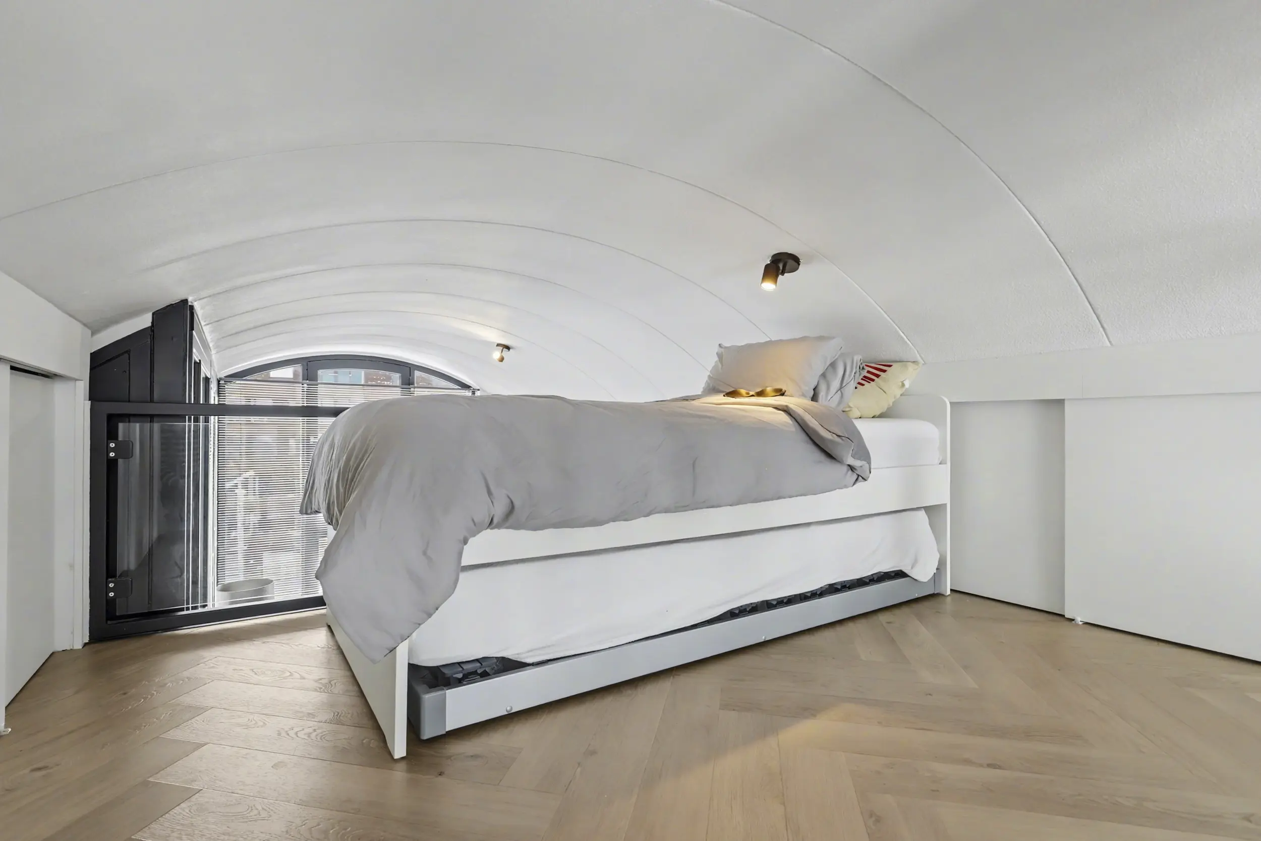 Een trap leidt naar de entresol, een charmante extra ruimte die zich perfect leent voor een werkplek, leeshoek of logeerbed. Via industriële schuifdeur in de woonkamer bereik je het separate Japanse toilet met gietvloer en fontein, de badkamer en het zonneterras. De badkamer, die in 2017 is vernieuwd en keurig is onderhouden, vormt de doorgang naar de ruime slaapkamer met laminaatvloer: een fijne, rustige plek om je terug te trekken.