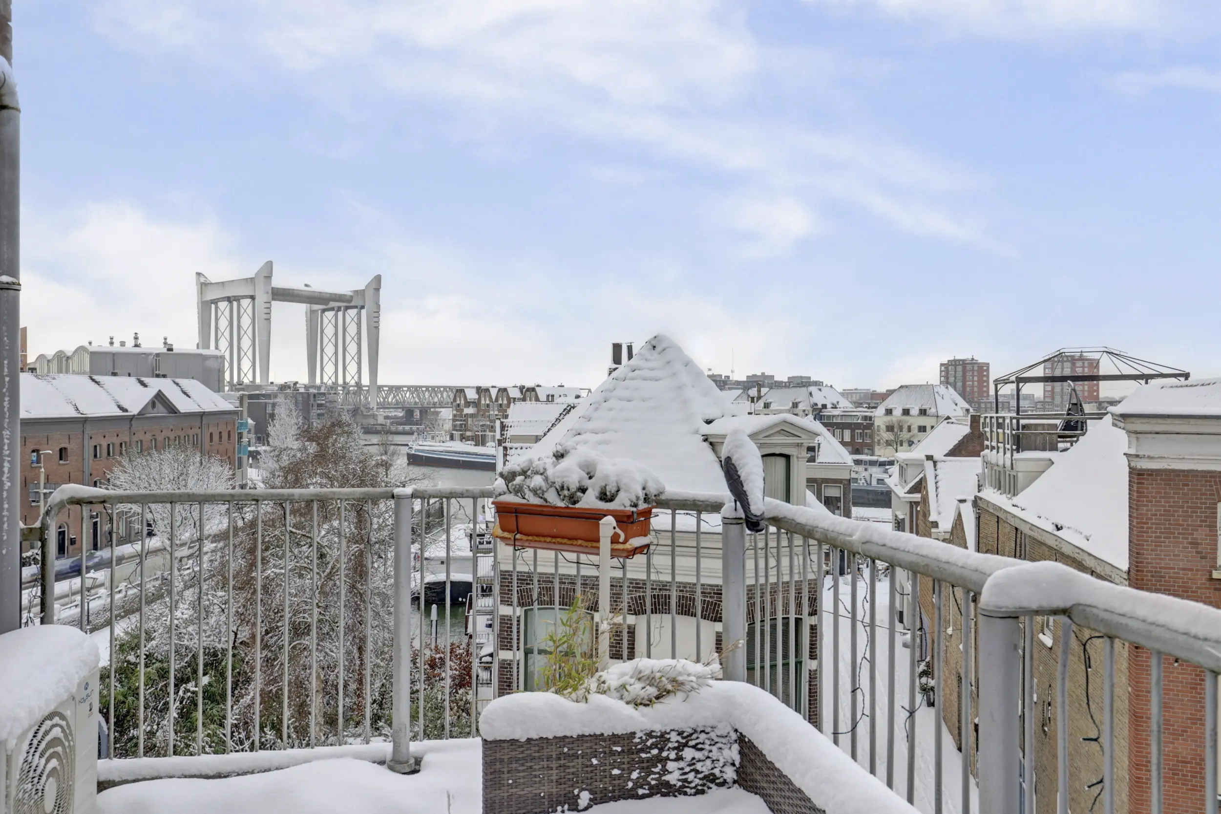 -Zonneterras op Zuidwesten met uitzicht op twee Dordtse iconen; de spoorbrug en Grote Kerk;