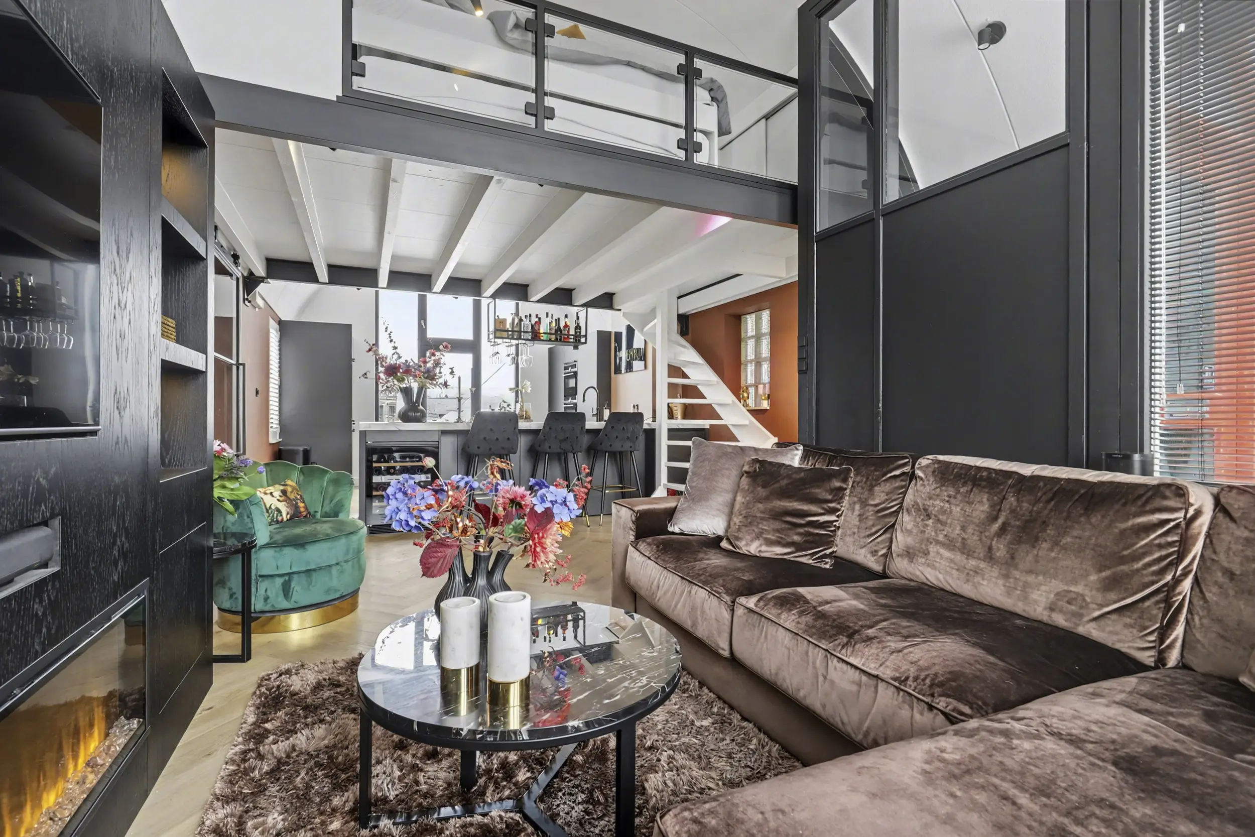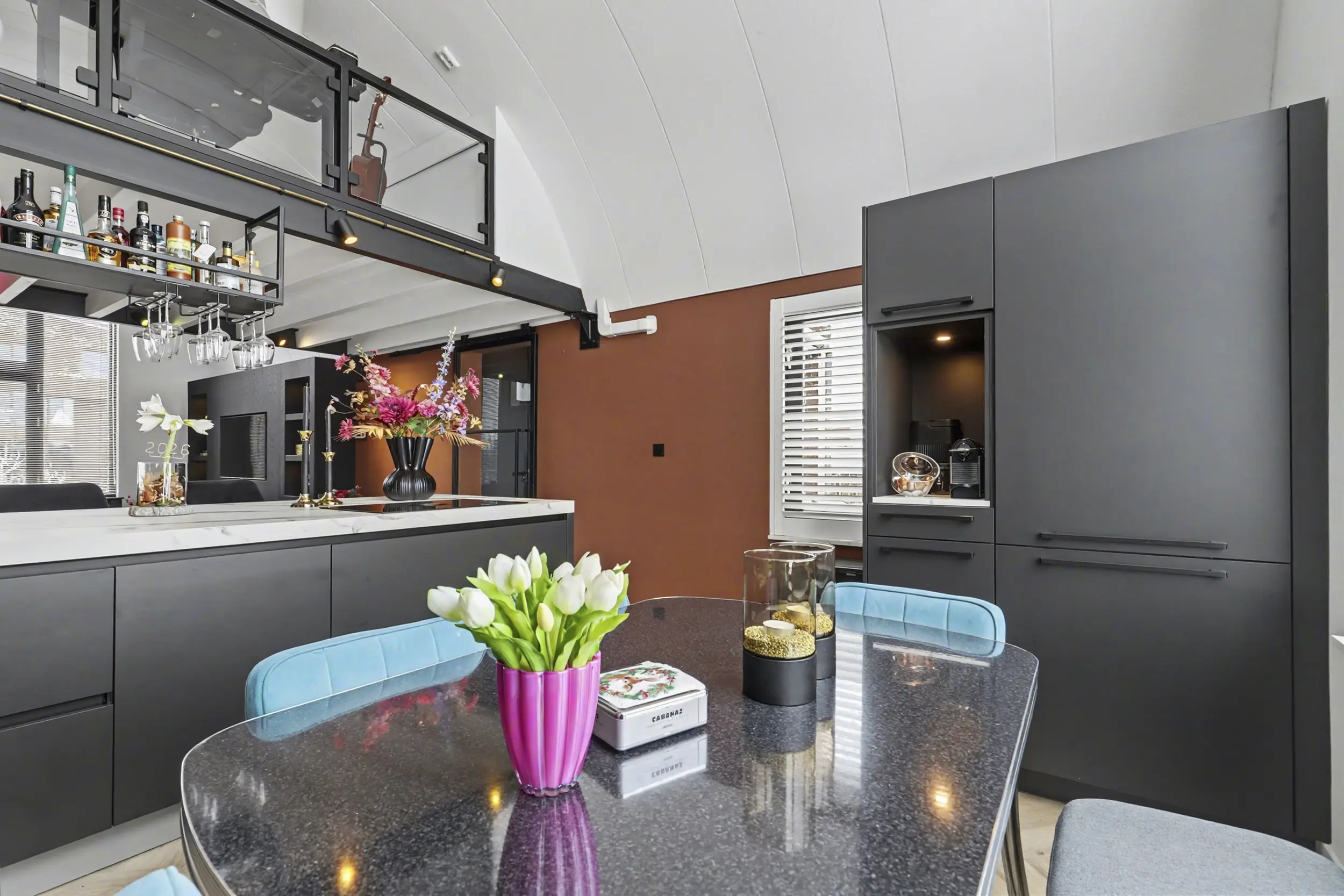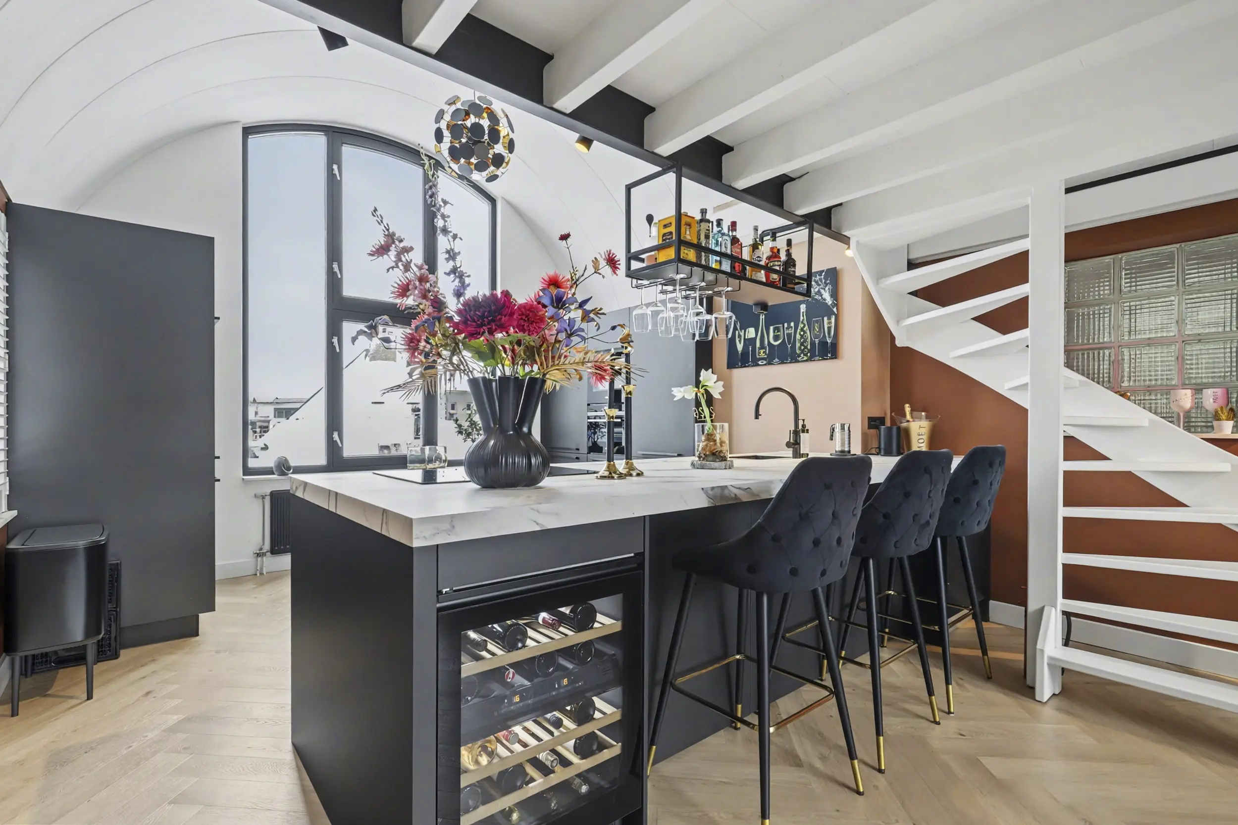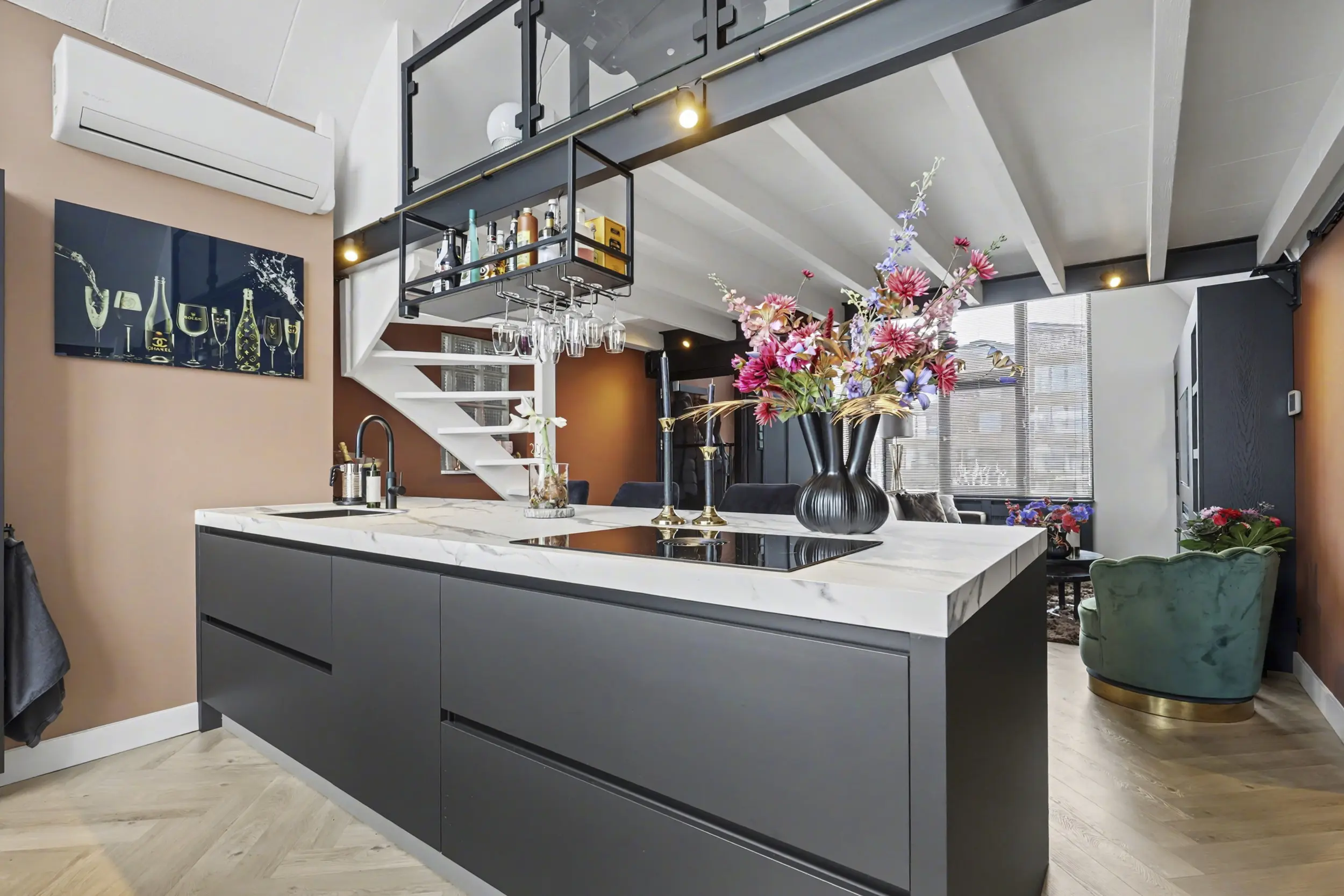 Via de entree stap je binnen in de woonkamer met open woonkeuken. Wat direct opvalt zijn de grote raampartijen die zorgen voor een prachtige lichtinval en een ruimtelijk gevoel. De keuken is een echte eyecatcher met een kookeiland, hoogwaardige Siemens- apparatuur, een Miele wijnklimaatkast met 2 zones, Quooker Flex kokend waterkraan, Bora kookplaat met geïntegreerde afzuiging, Bauknecht koel-vriescombinatie (extra breed, 70cm) en een aparte koffiehoek: een fijne plek om te koken, bij te praten en te genieten. De visgraatvloer is van PVC en loopt strak door in het woon- en keukengedeelte en geeft het geheel een moderne, rustige uitstraling.