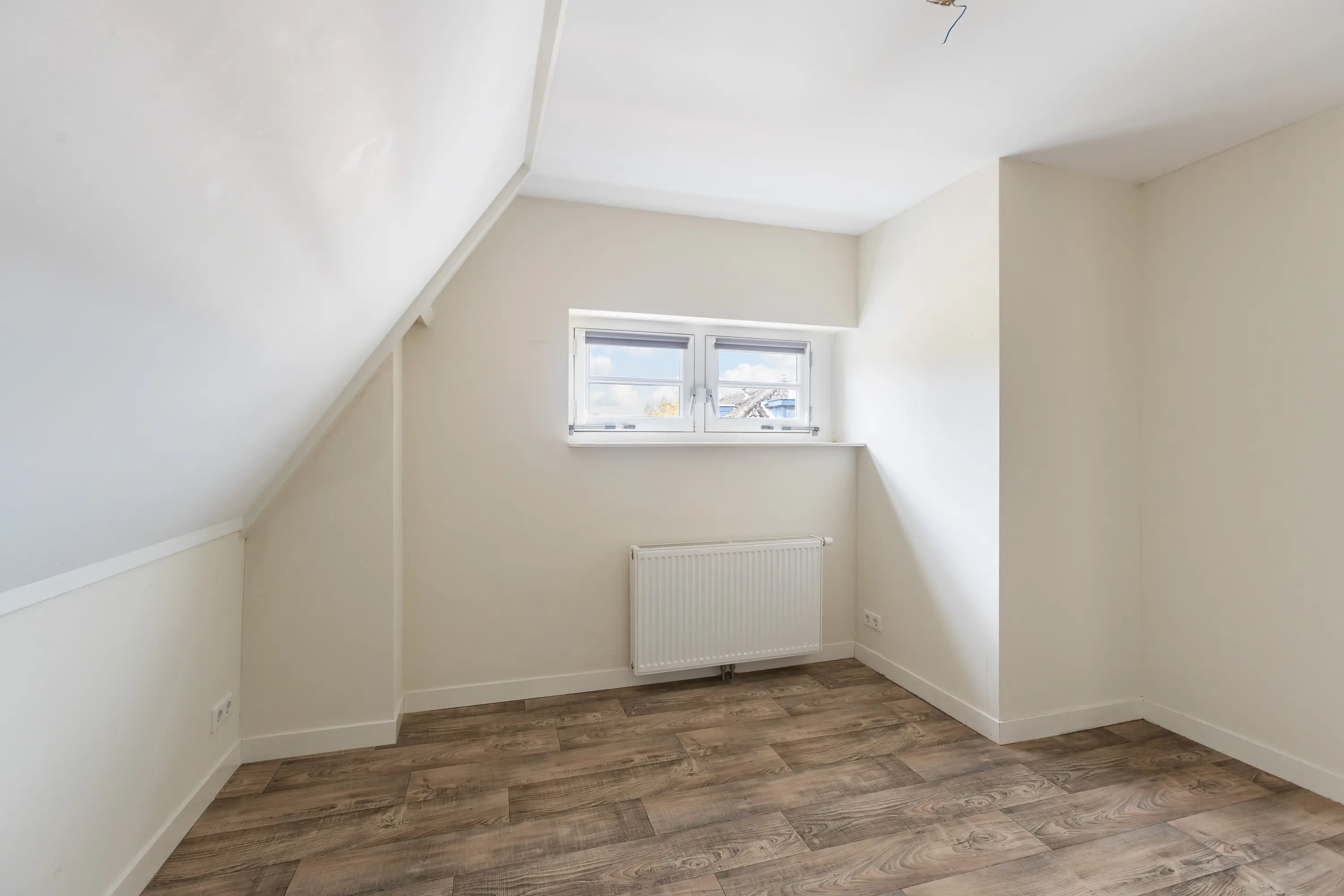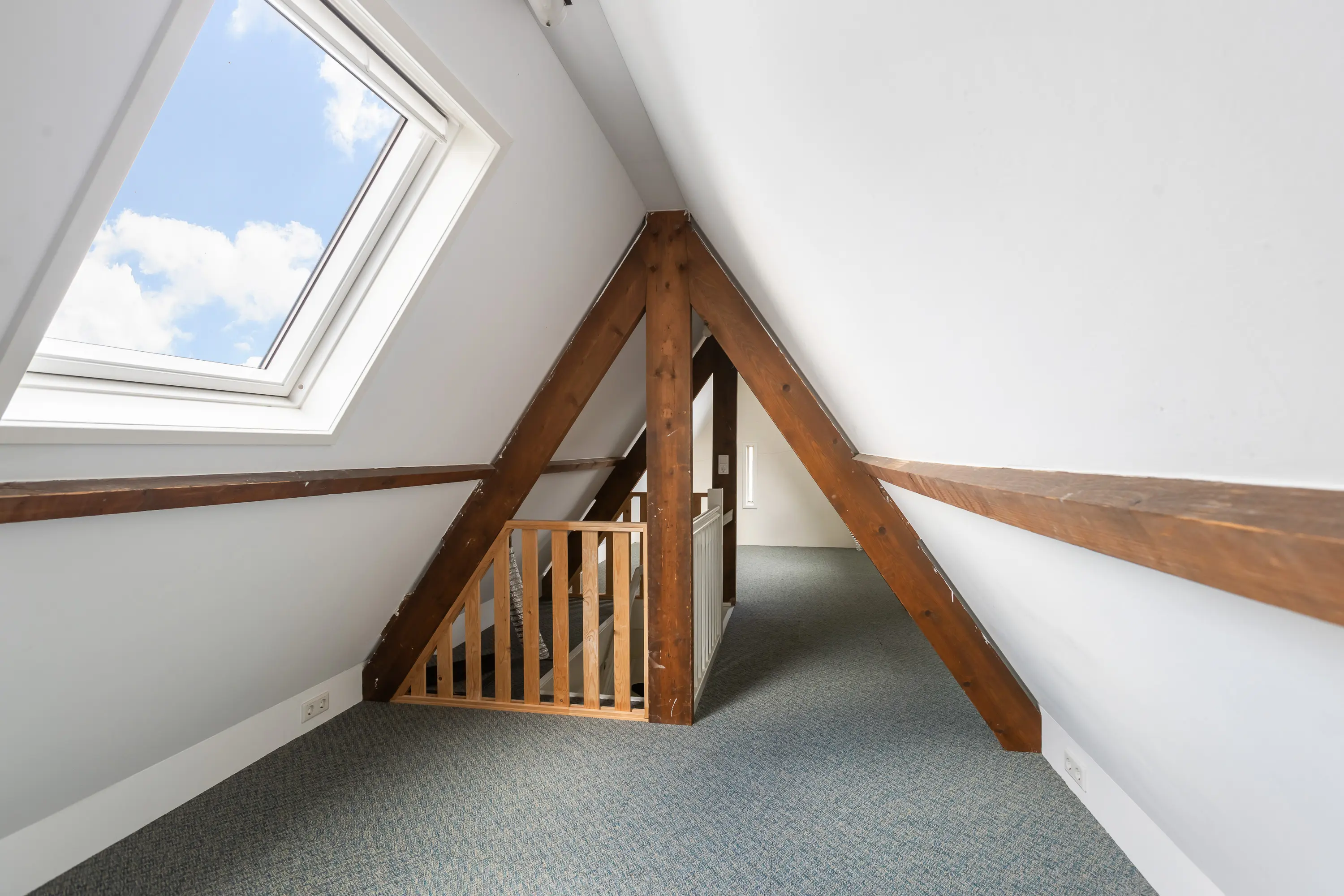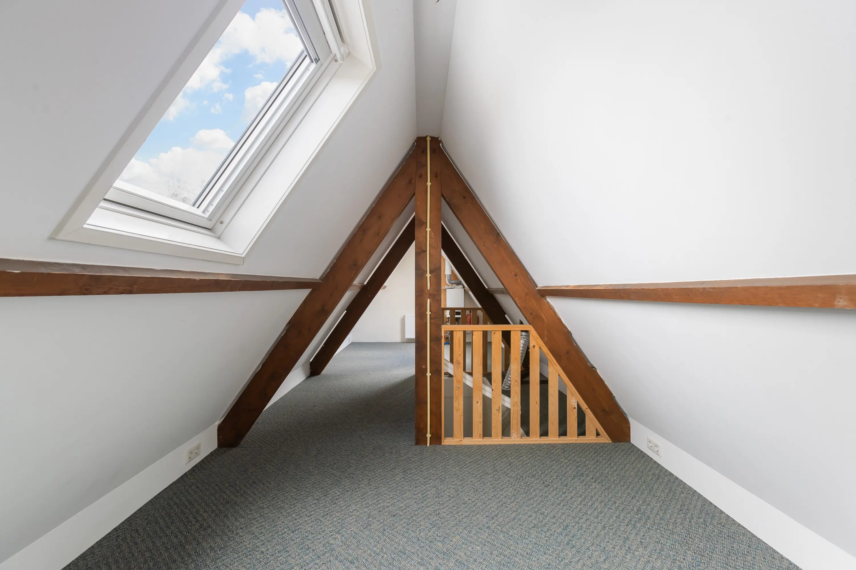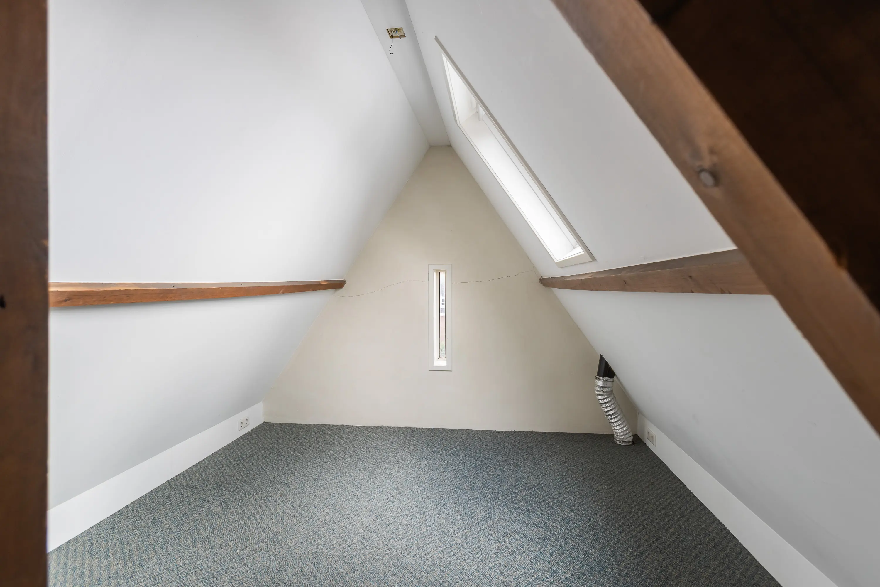 Via de vaste trap en ruime overloop toegang tot de bovengelegen verdieping waar eventueel nog een slaapkamer te realiseren valt of een fijne werkplek. Leuk detail hier is werkelijk het aller smalste raampje ooit wat ik gezien heb.