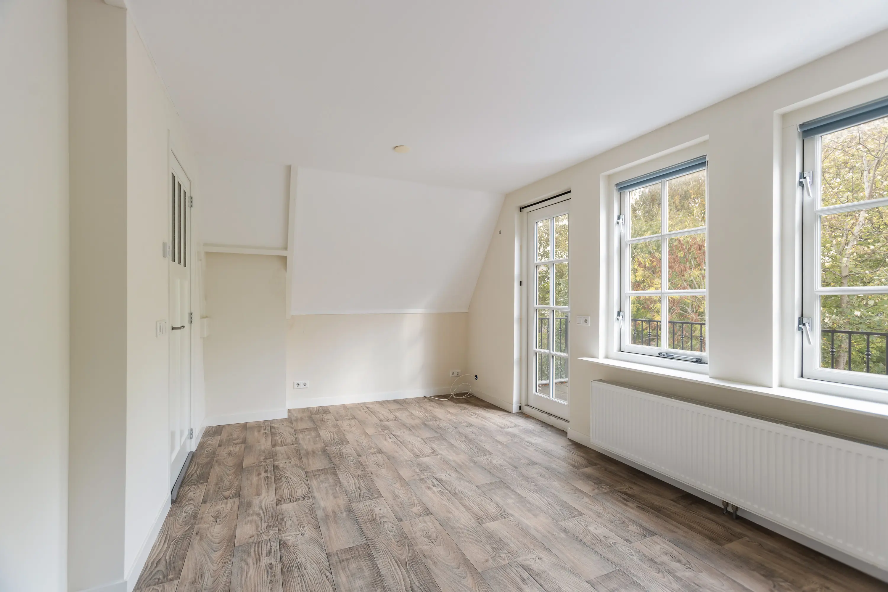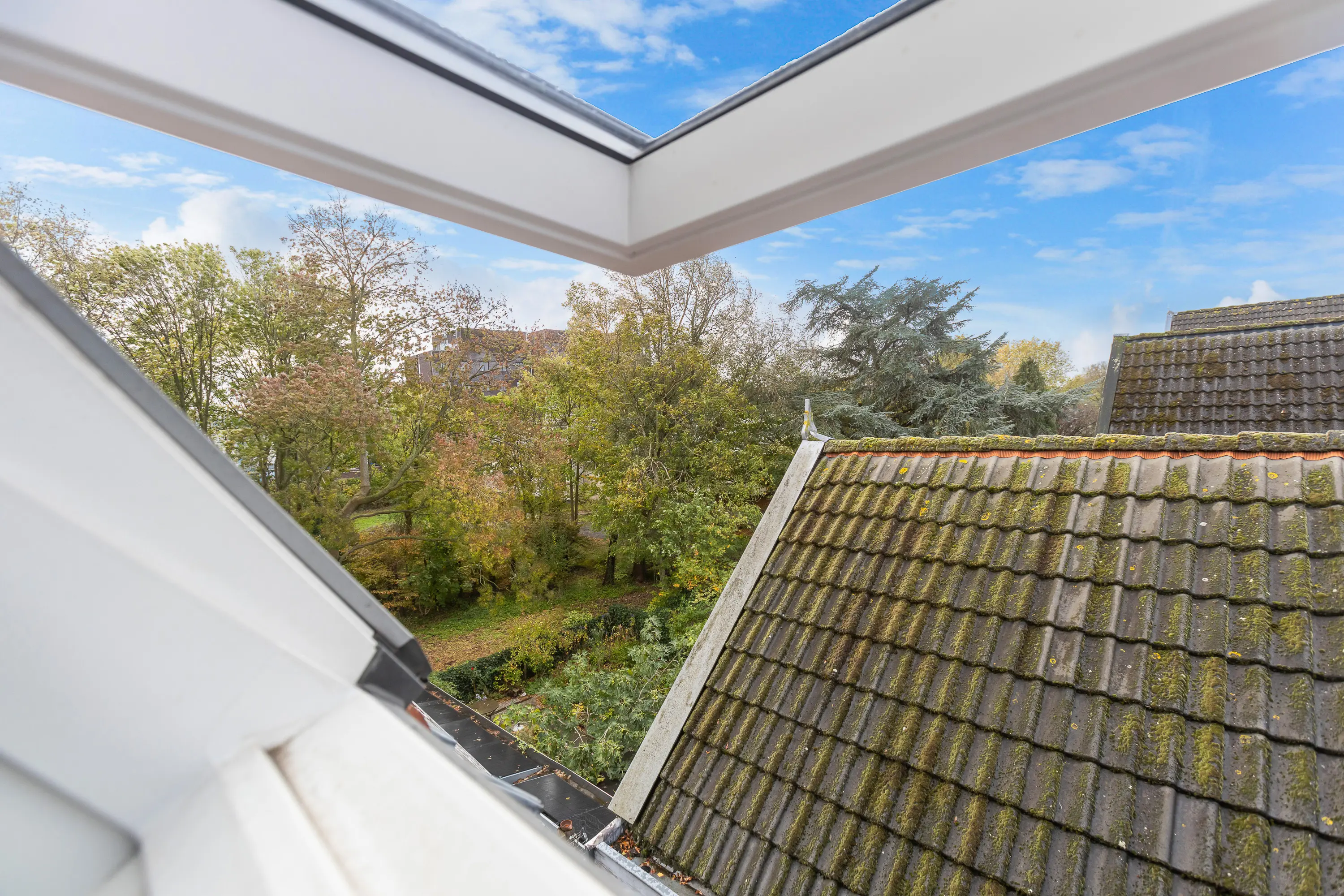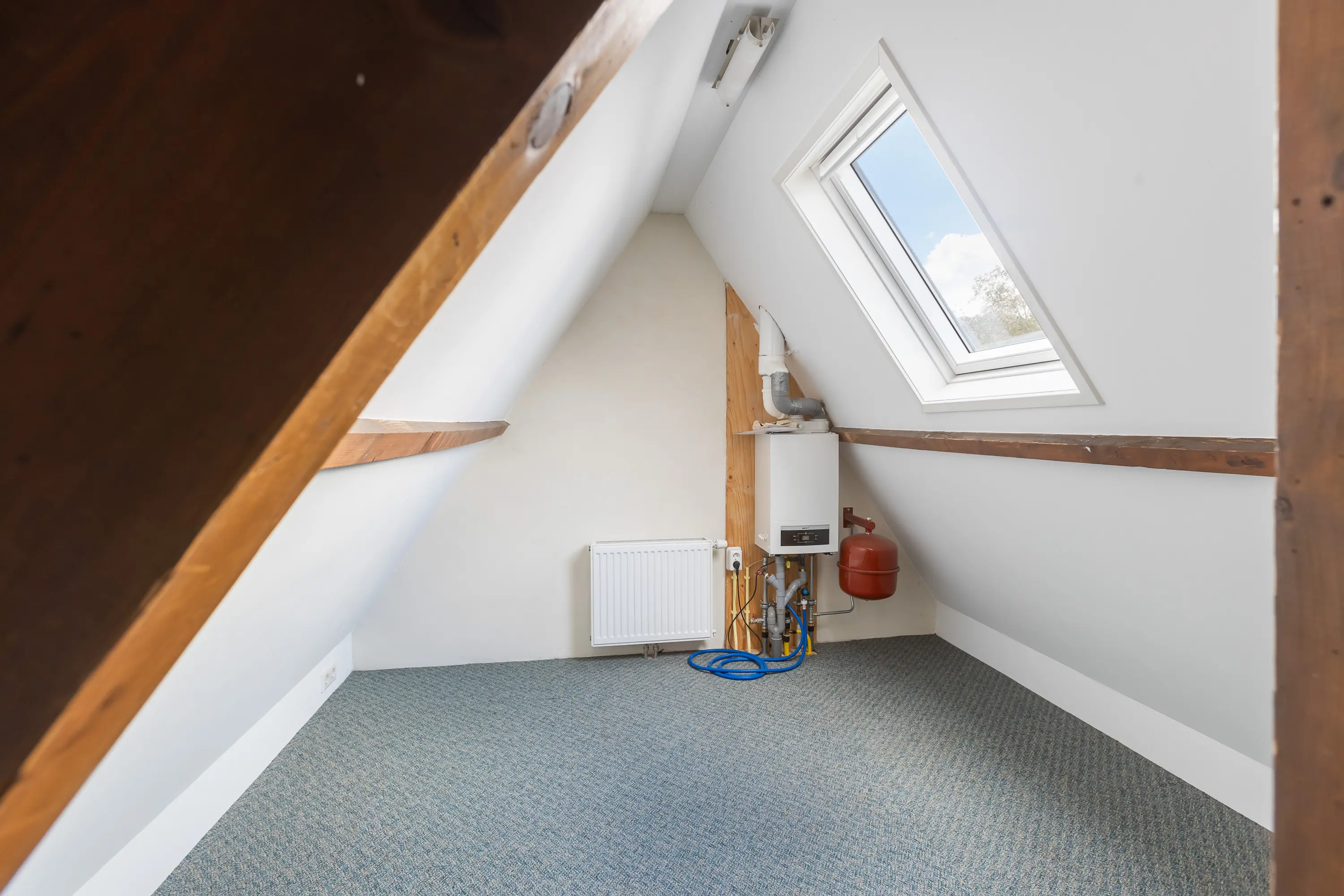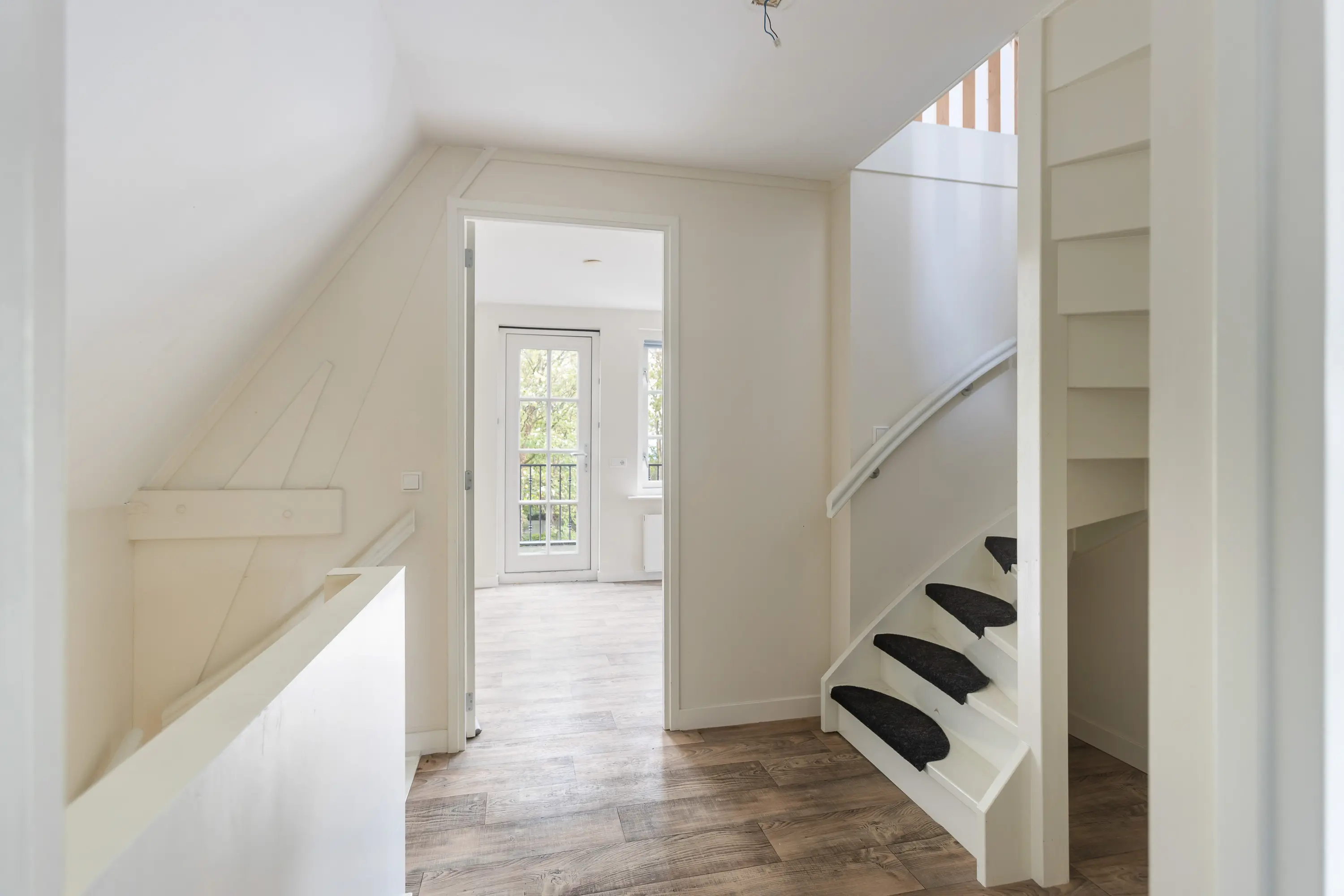 Via de vaste trap en ruime overloop toegang tot de bovengelegen verdieping waar eventueel nog een slaapkamer te realiseren valt of een fijne werkplek. Leuk detail hier is werkelijk het aller smalste raampje ooit wat ik gezien heb.