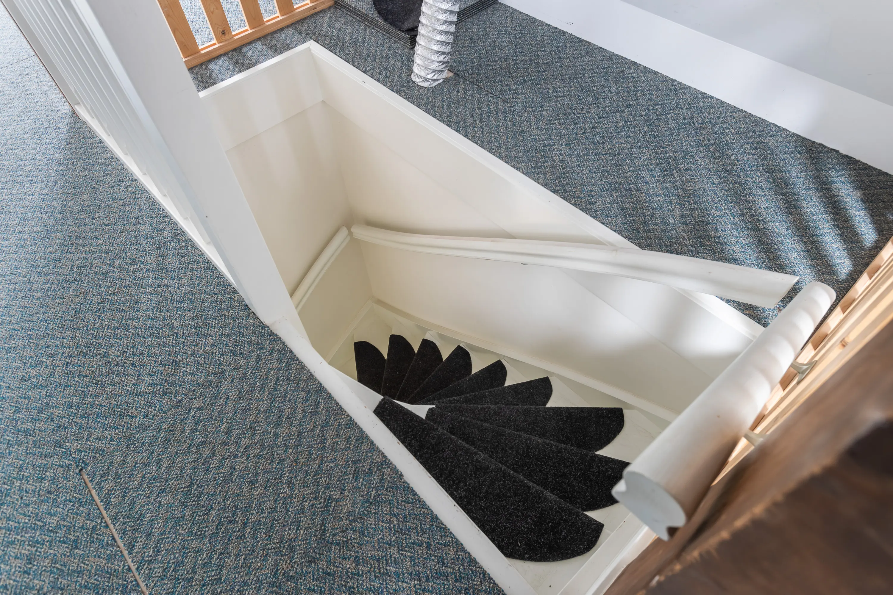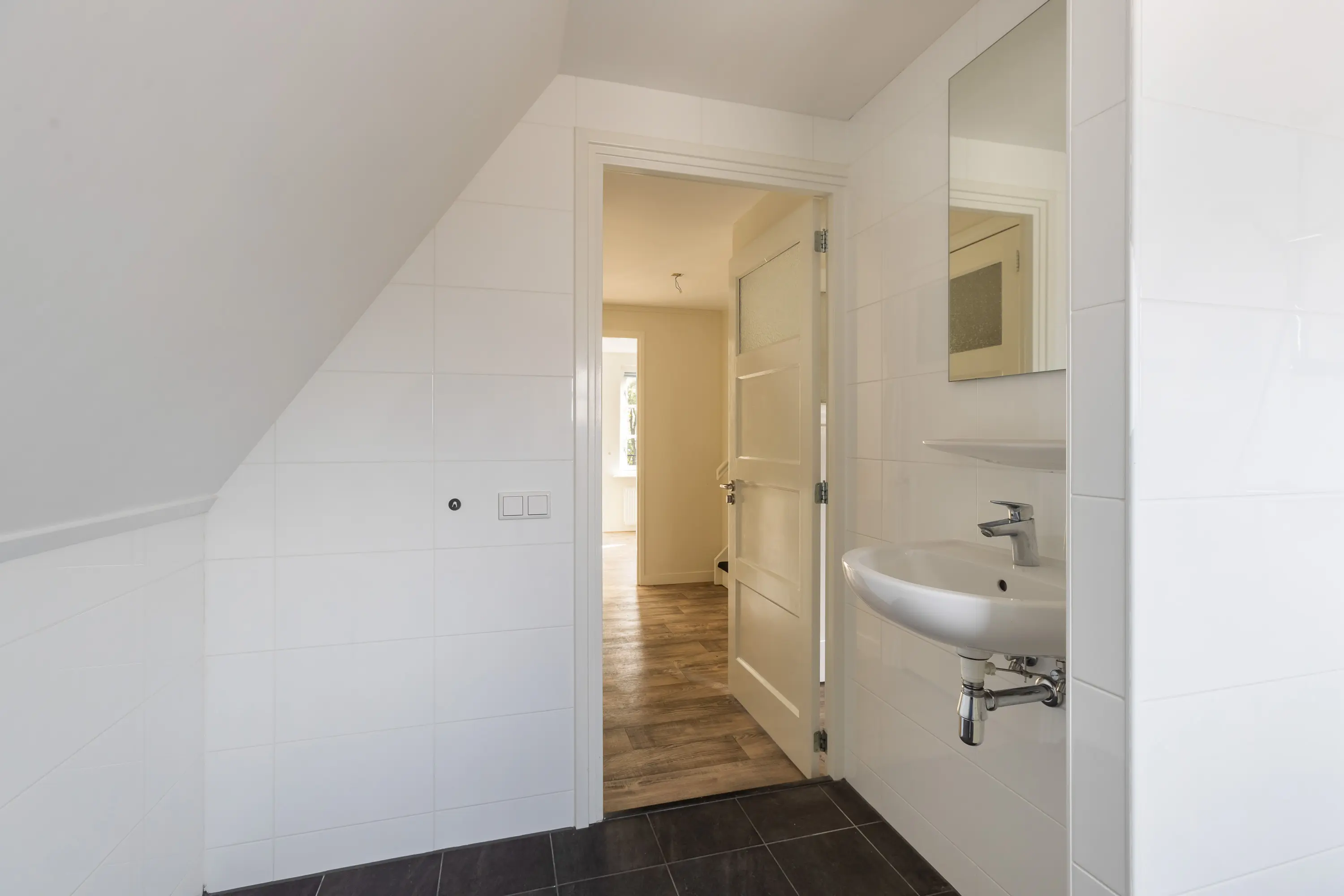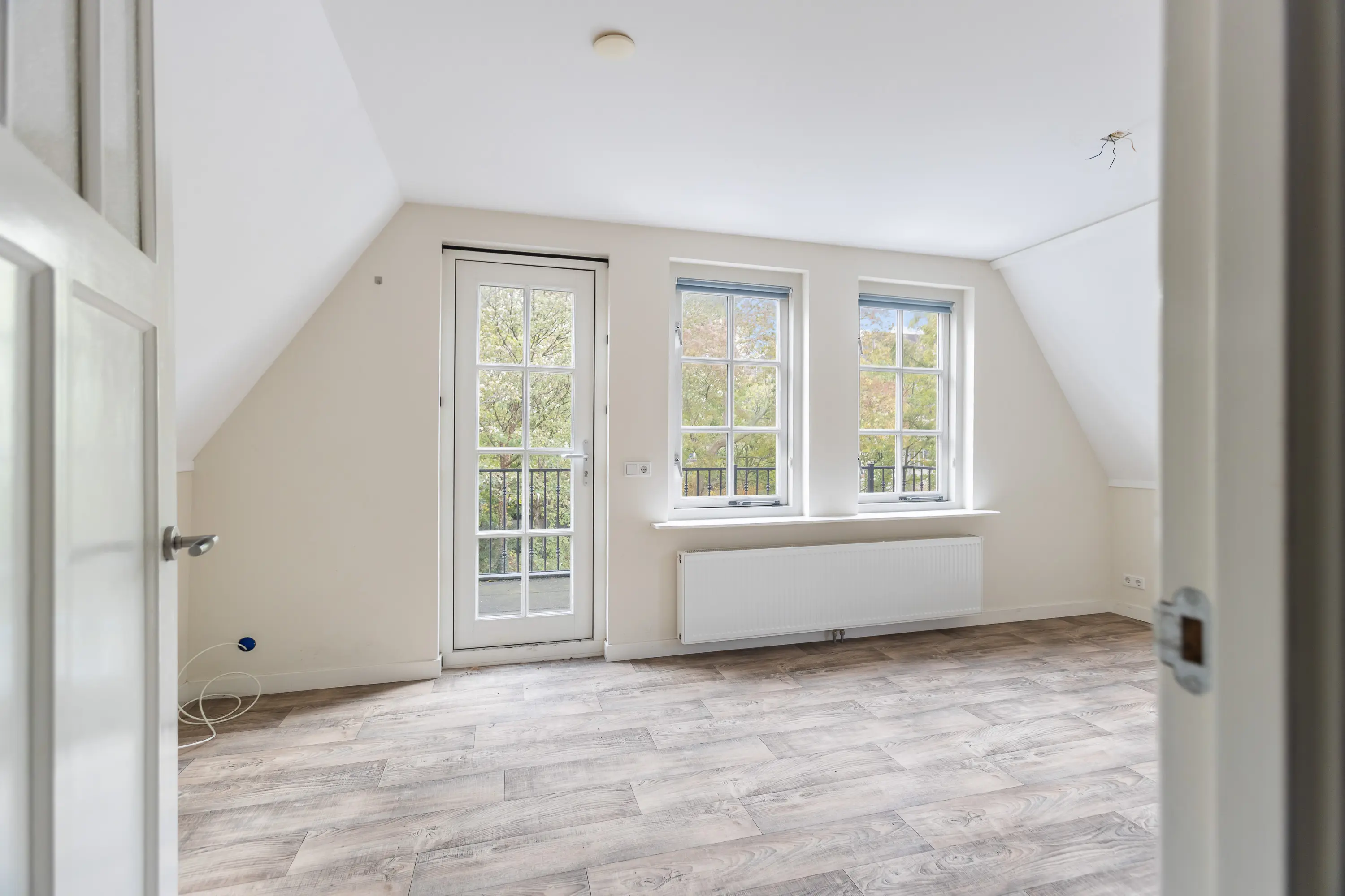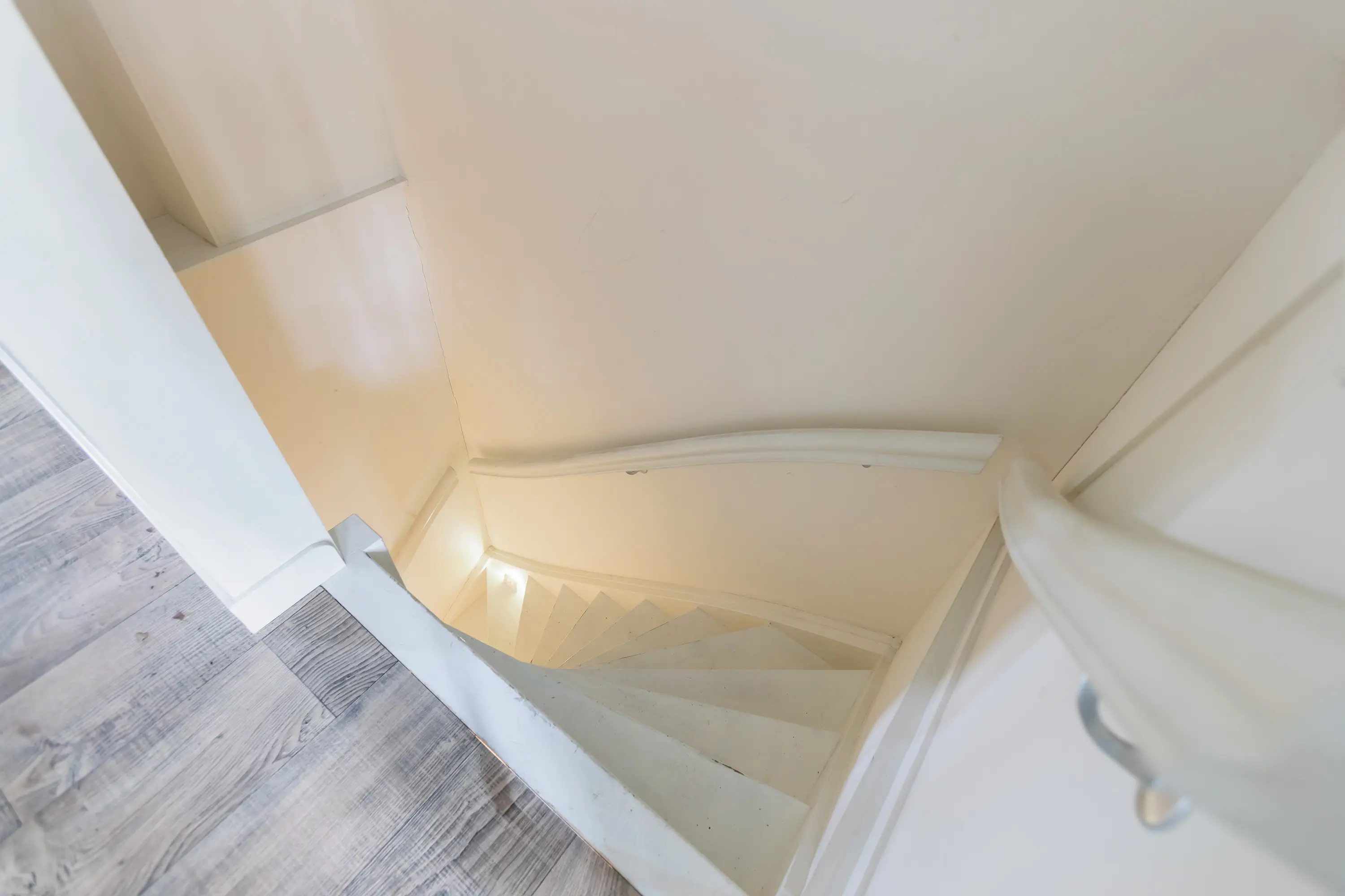 Via de vaste trap en ruime overloop toegang tot de bovengelegen verdieping waar eventueel nog een slaapkamer te realiseren valt of een fijne werkplek. Leuk detail hier is werkelijk het aller smalste raampje ooit wat ik gezien heb.