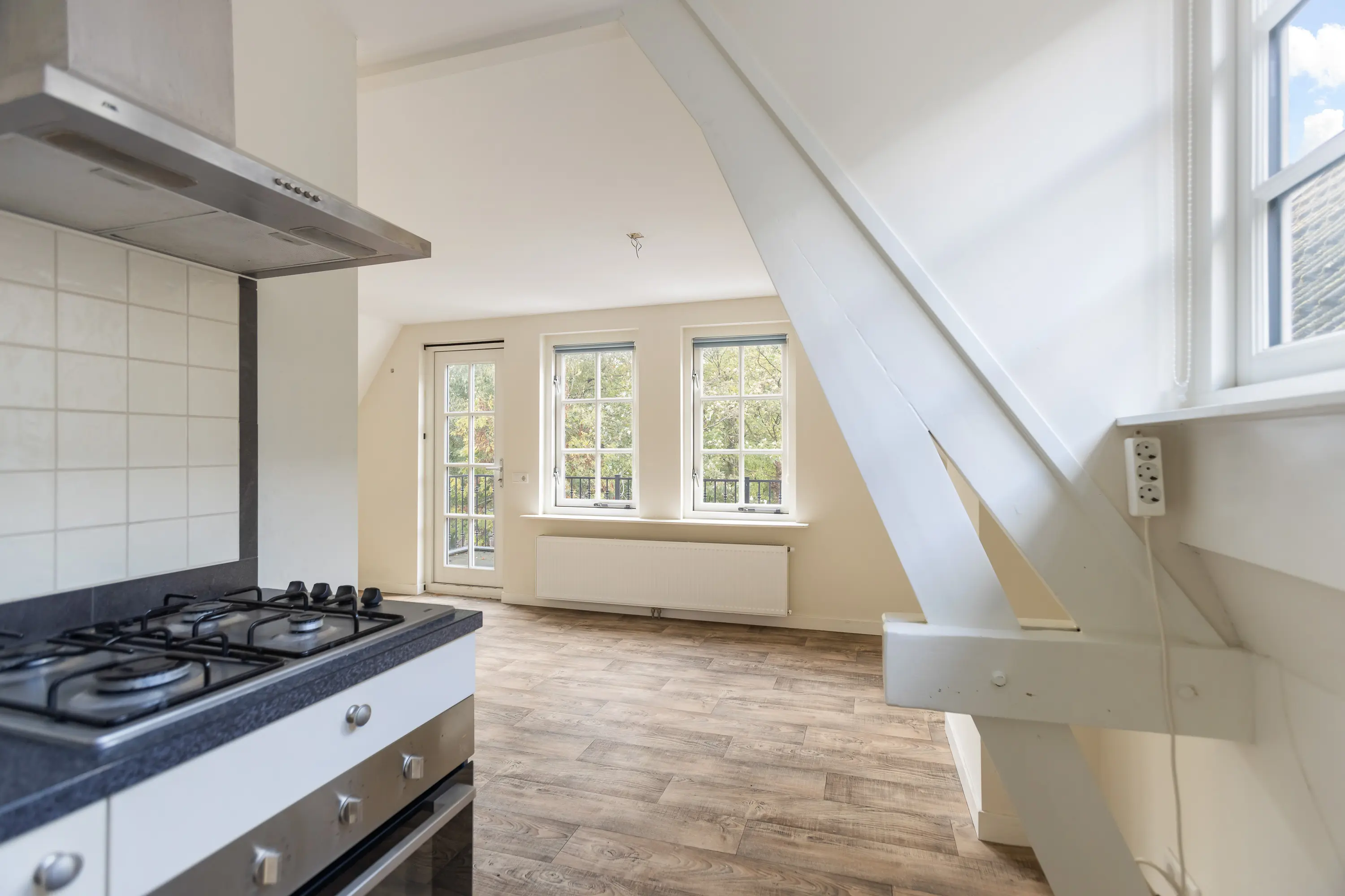 Fijne woonkamer met open keuken en toegang tot het balkon.