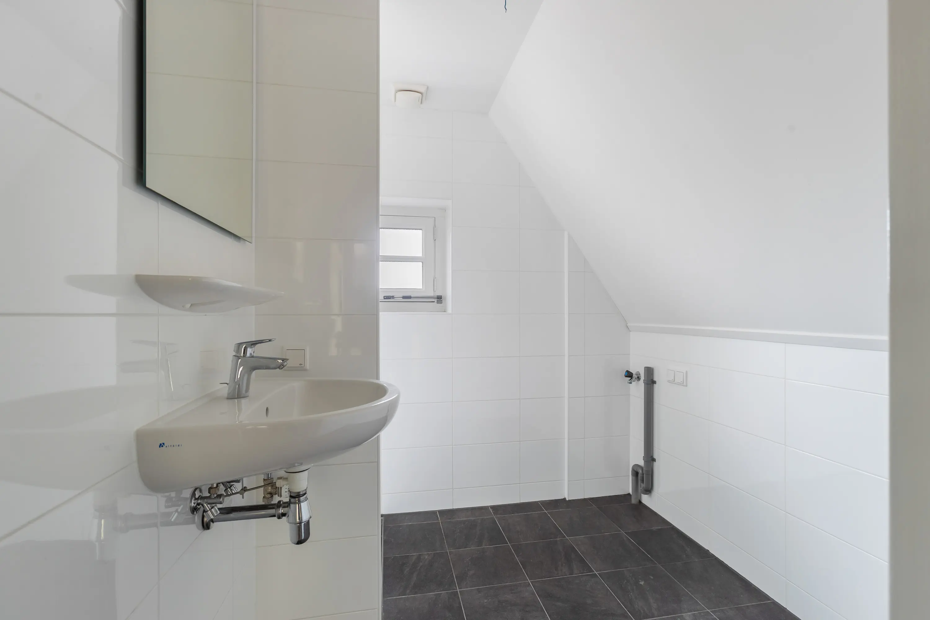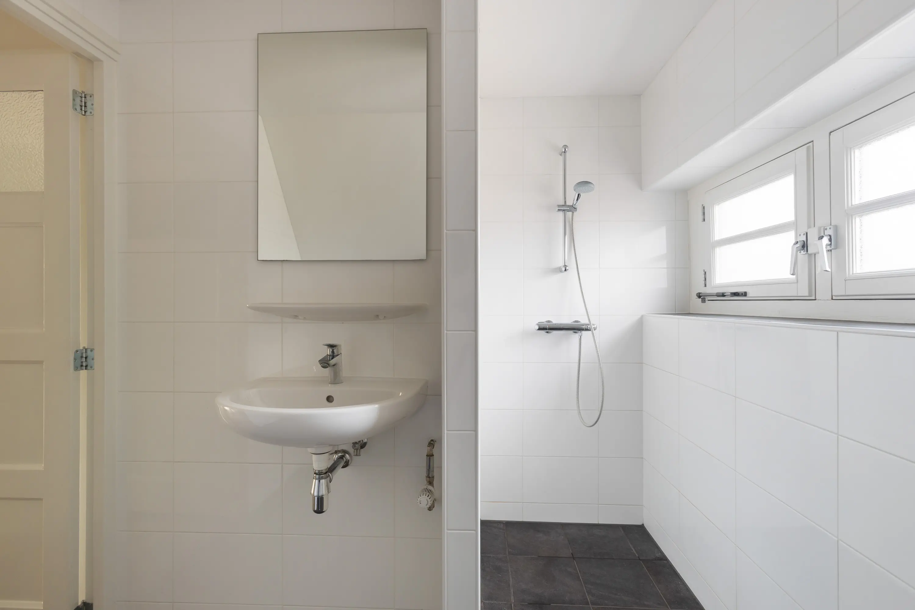 Badkamer met douche en wastafel plus tevens opstelplaats voor de wasmachine.