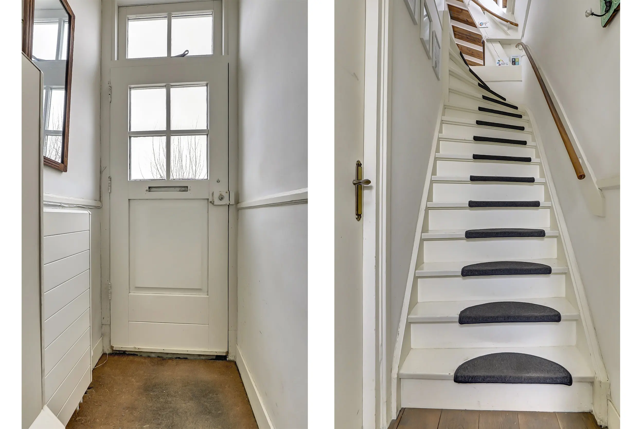 De entree, waar zich de meterkast bevindt, geeft toegang tot de woonkamer en de eerste verdieping.