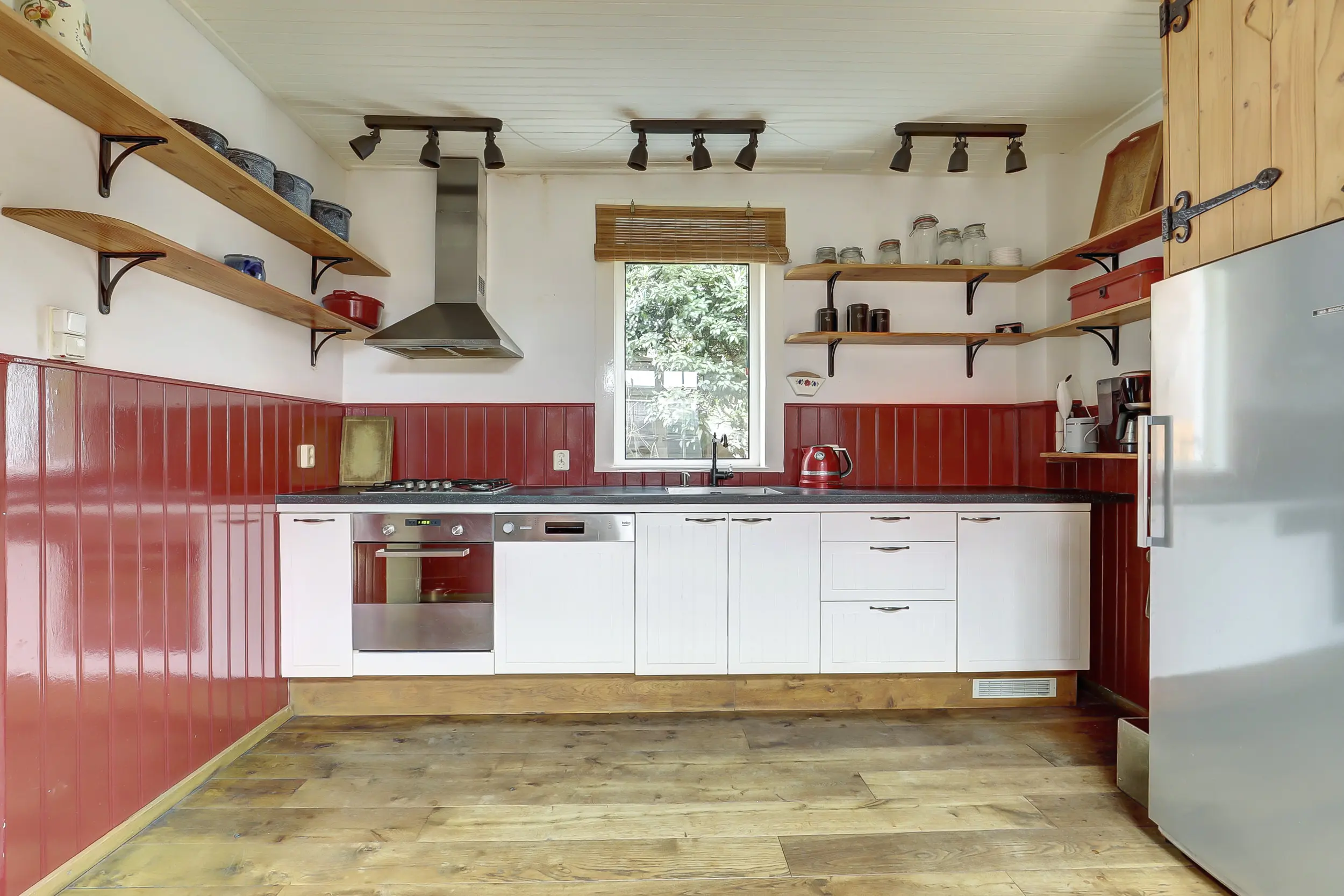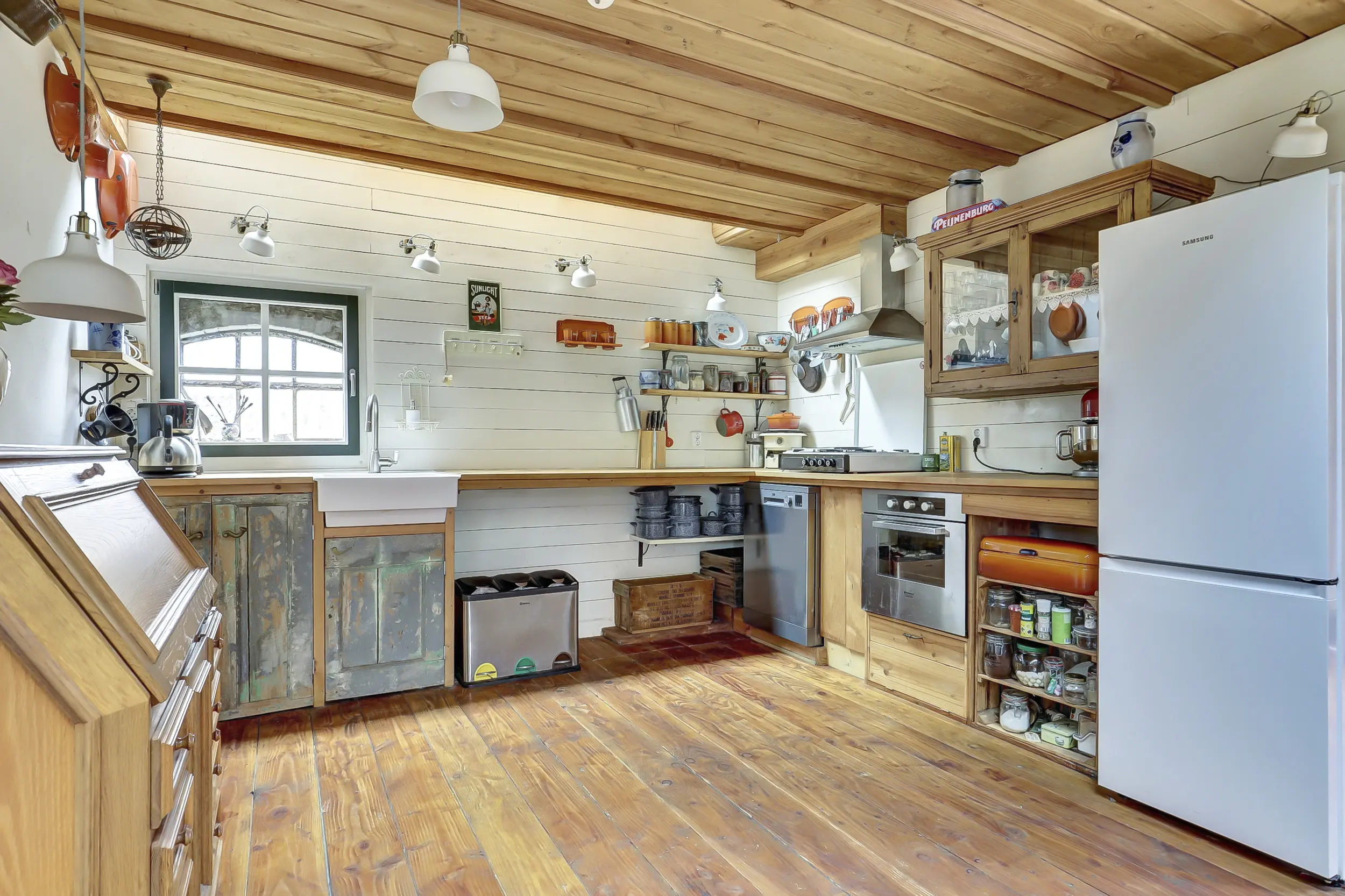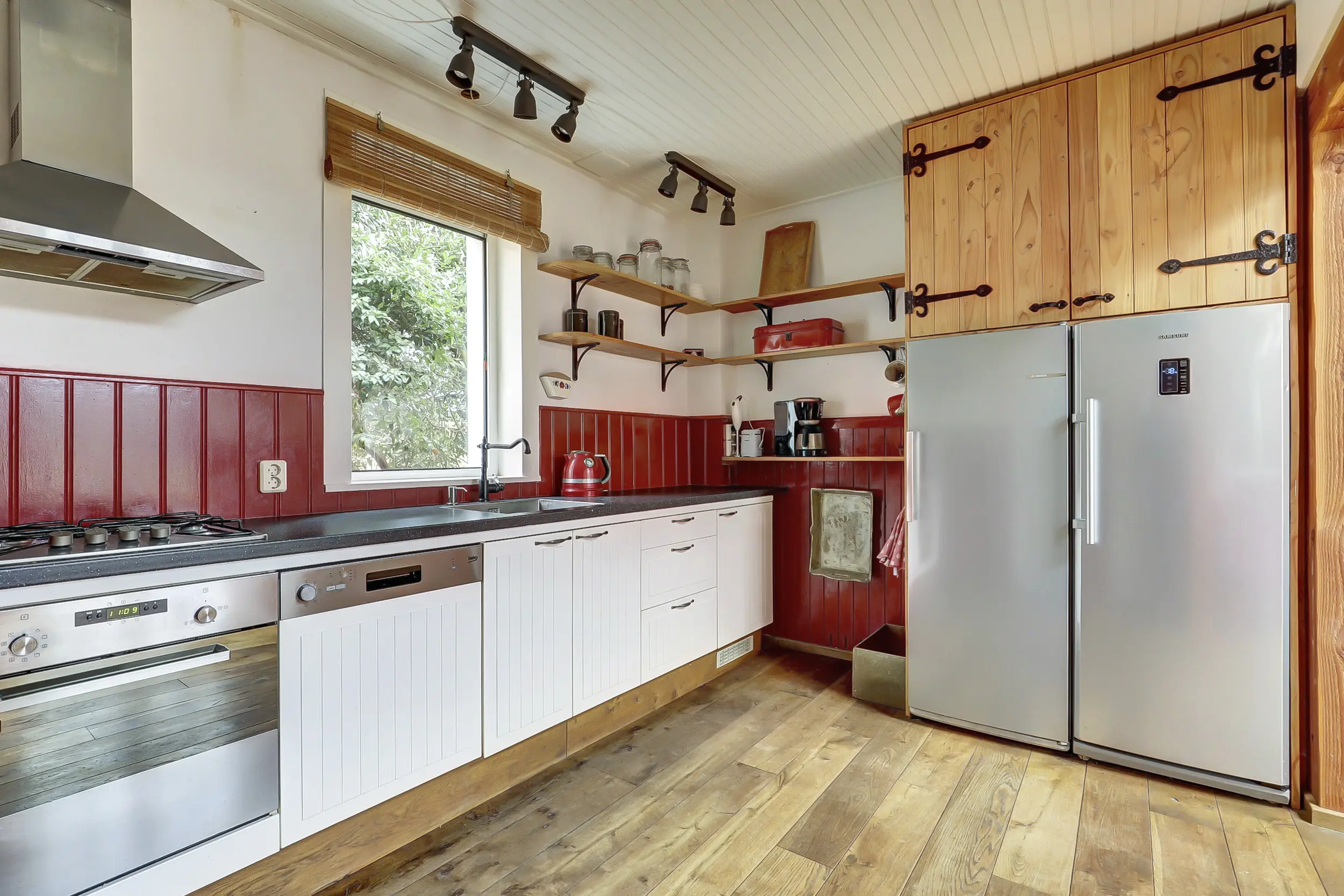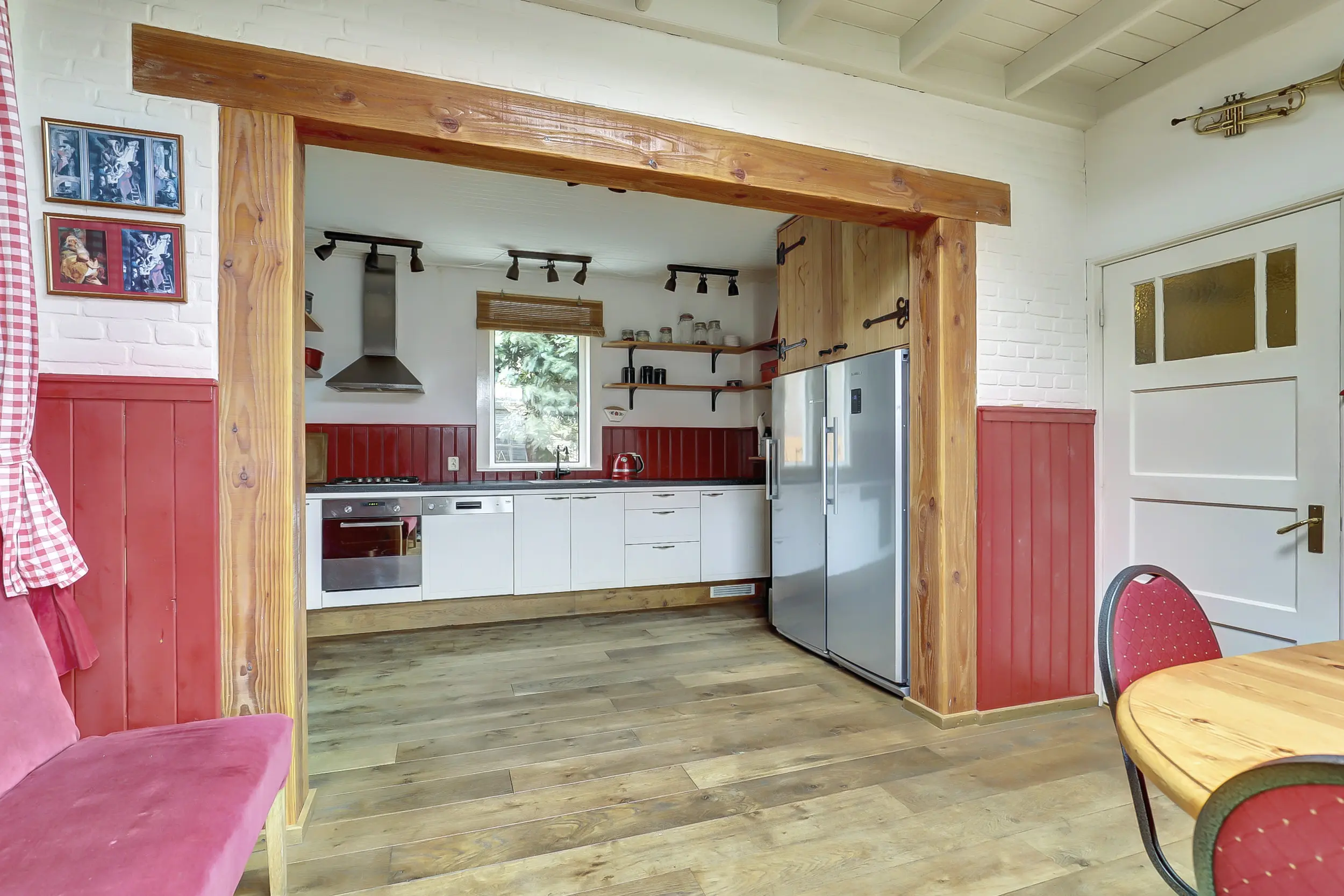 De landelijke woonkeuken bevindt zich in de uitbouw en vormt het hart van de woning. De ruimte is sfeervol ingericht en ook heel licht dankzij de geplaatste lichtkoepel. De keuken is in rechte opstelling geplaatst met aan de zijkant een vriezer en koelkast gesitueerd, waar boven vaste kasten zijn gemaakt. De keuken is voorzien van diverse inbouwapparatuur zoals een 5-pits gaskookplaat, oven, en vaatwasser. Het geheel is afgewerkt met een kunststof werkblad met 2 spoelbakken. In de ruimte, welke afgewerkt is met een fraaie houten vloer, is er voldoende ruimte voor het plaatsen van grote eettafel om heerlijk met het hele gezien te tafelen. Via de woonkeuken is de tussenhal bereikbaar.