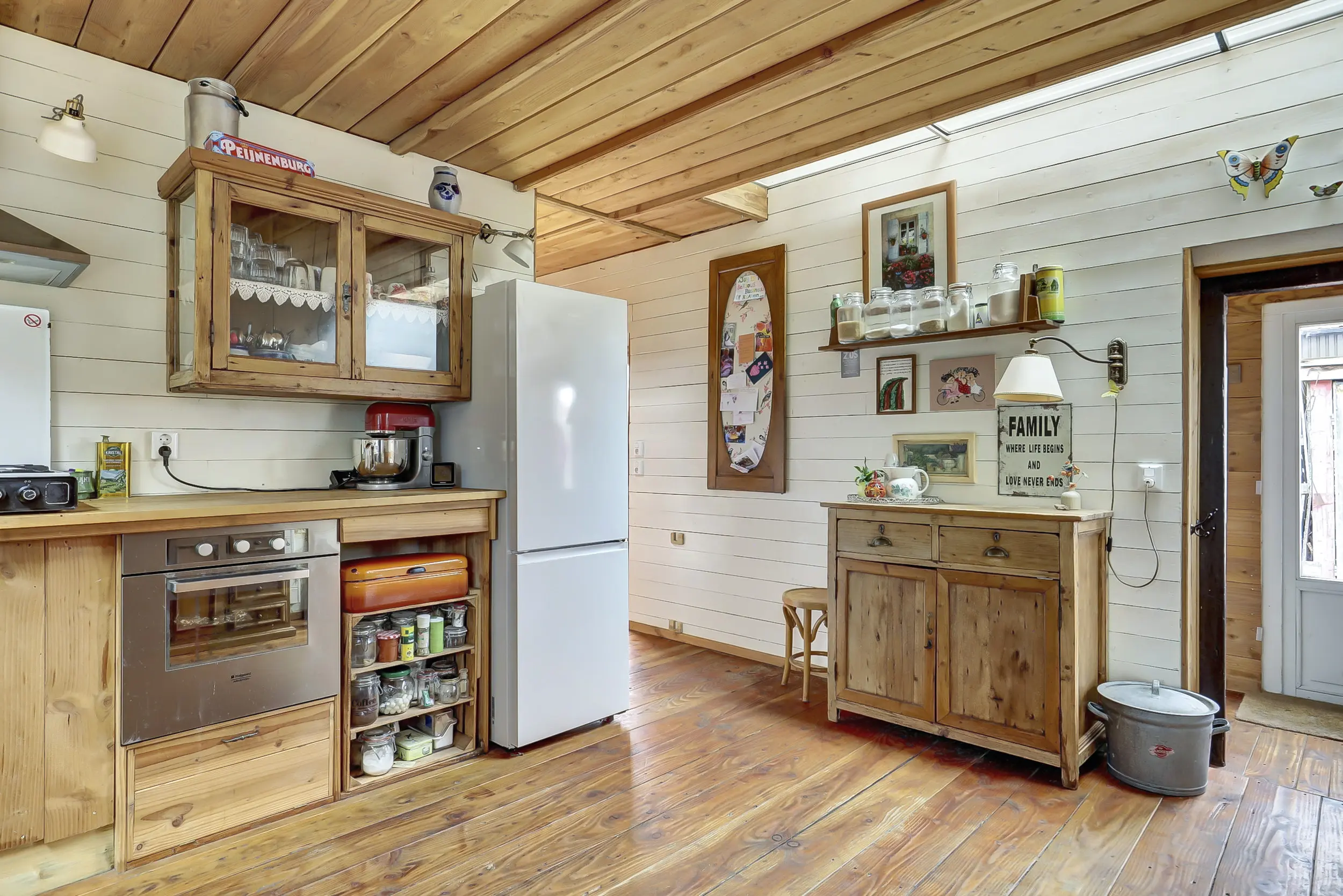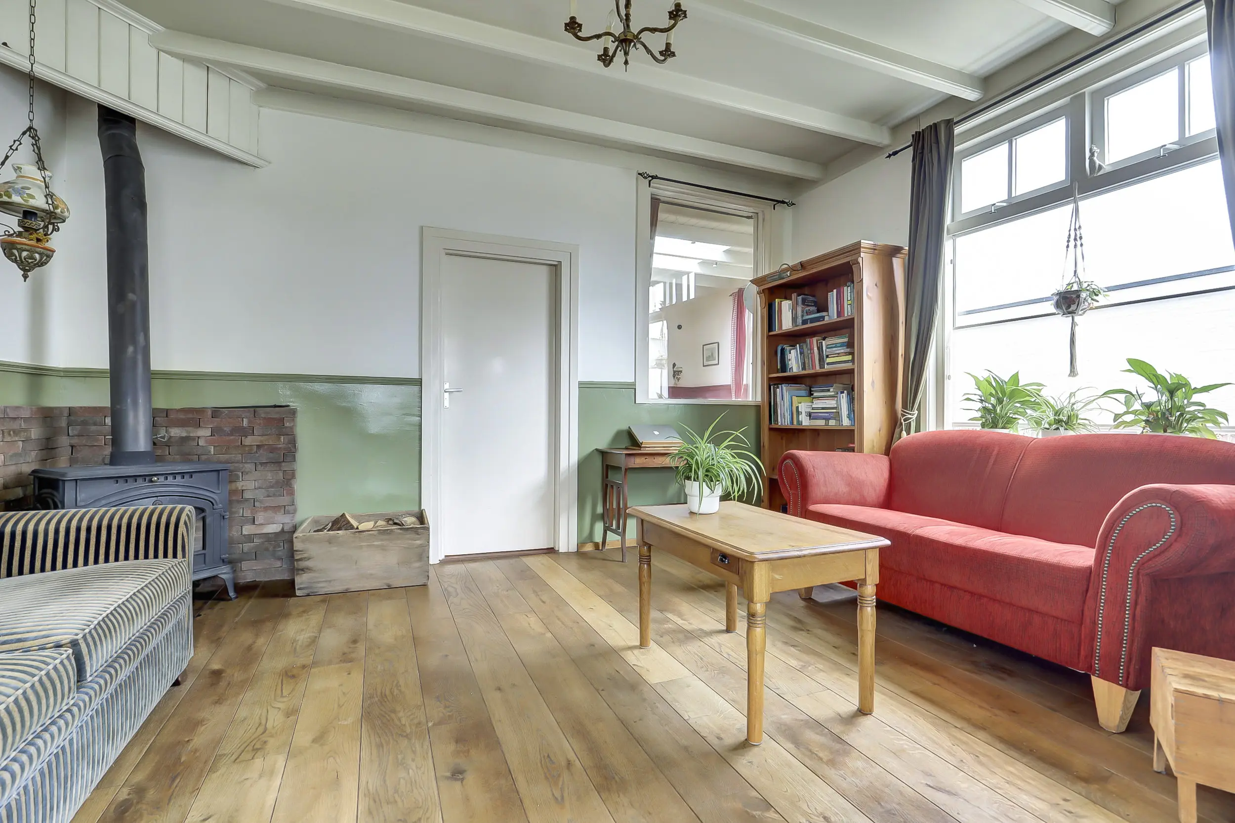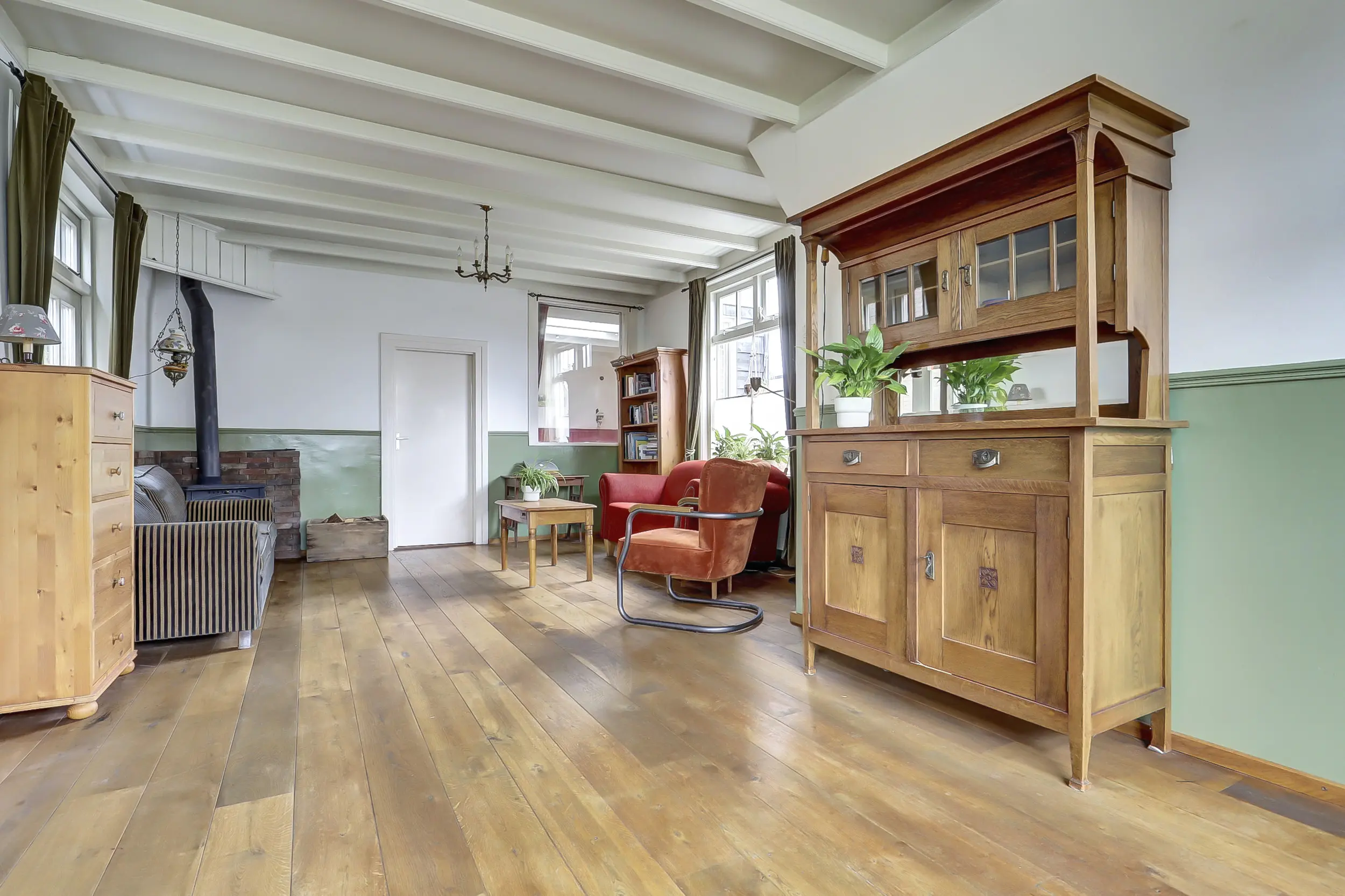 De sfeervolle woonkamer ademt sfeer en karakter uit. De fraaie afwerking met houten vloer en de opgestelde houtkachel zorgen voor een warme en uitnodigende leefruimte, waarin u zich direct thuis zult voelen. Aan de zijkant van de woonkamer is de zijtuin via openslaande deuren toegankelijk. Aan de zijkant van de kamer is nog een trapkast gesitueerd, welke toegang geeft tot de kruipruimte. Verder is er veel lichtinval door de vele raampartijen. Vanuit de woonkamer is er toegang tot de woonkeuken.