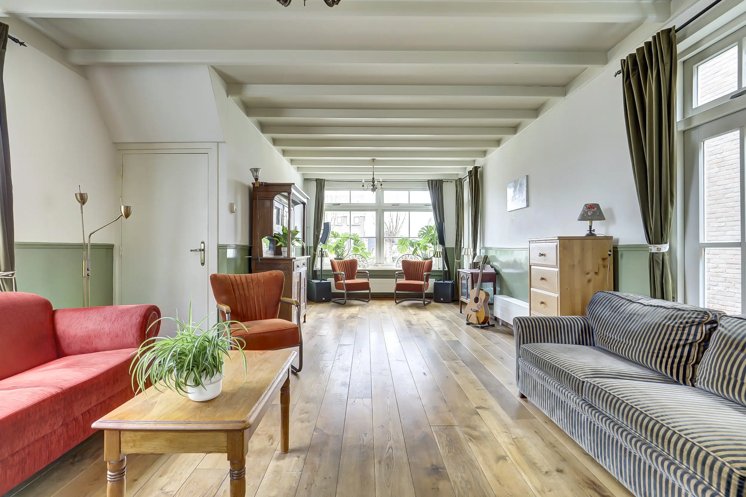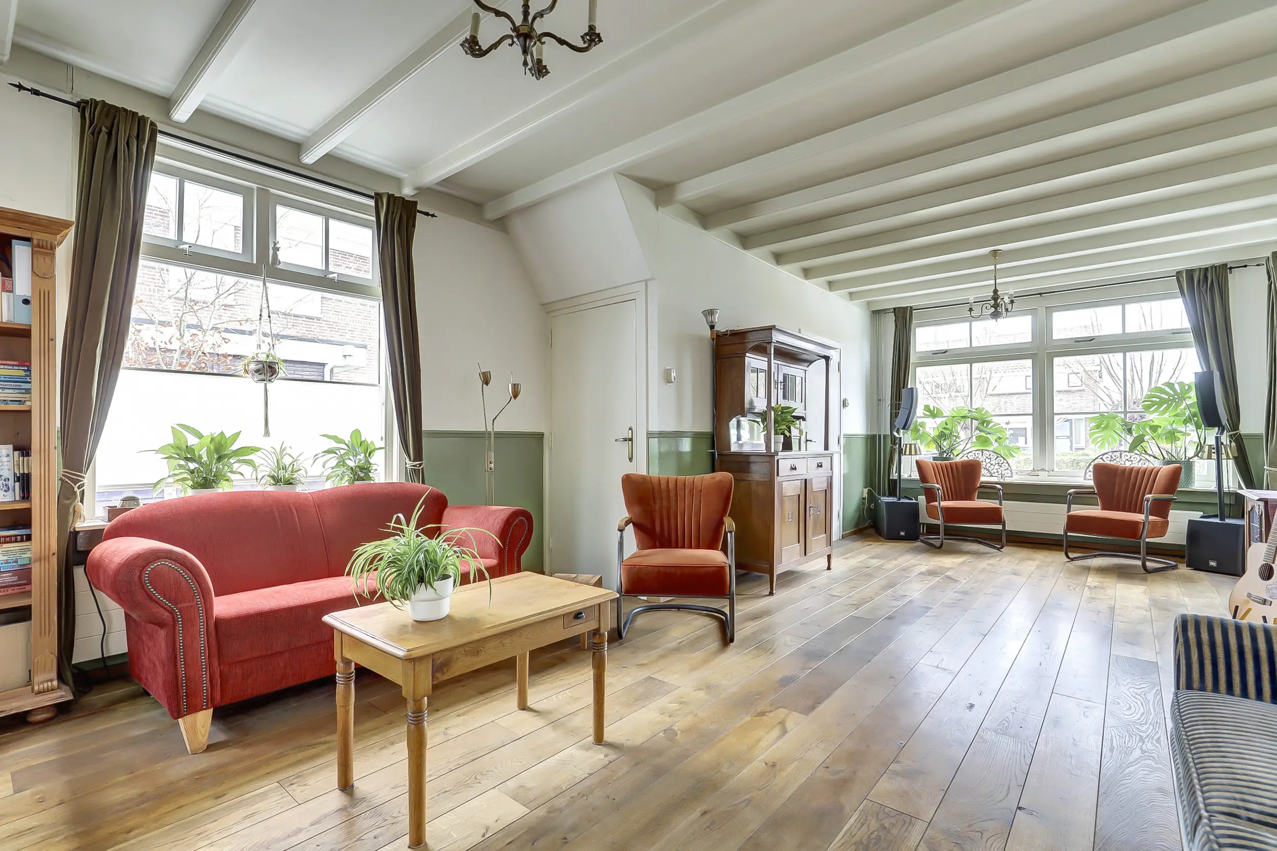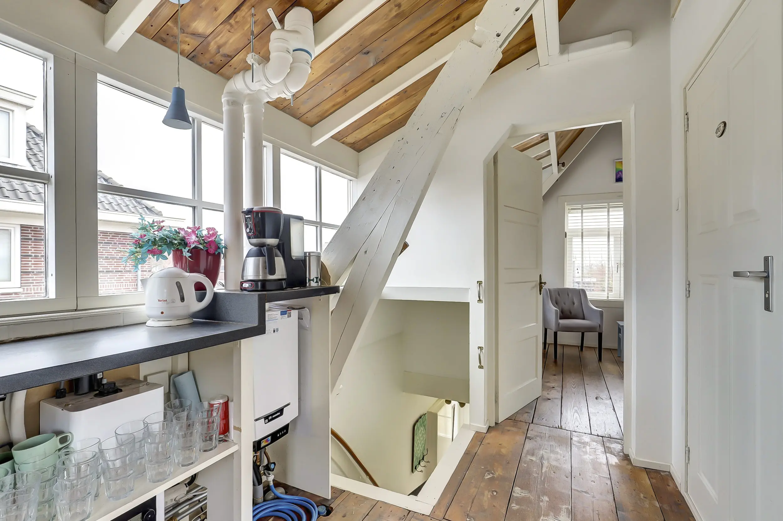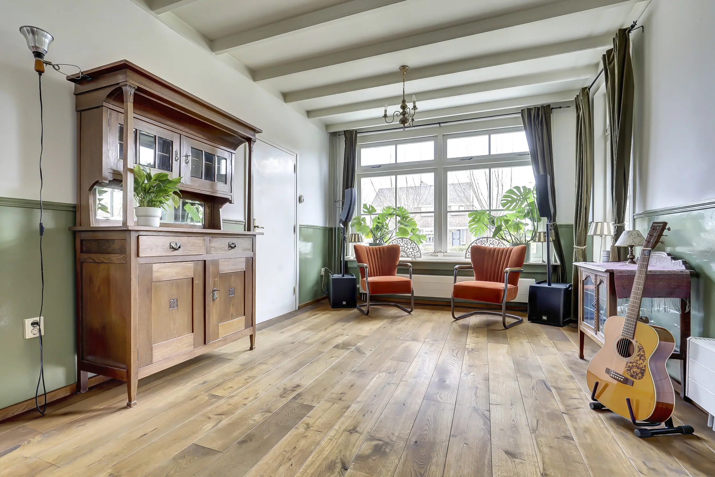De sfeervolle woonkamer ademt sfeer en karakter uit. De fraaie afwerking met houten vloer en de opgestelde houtkachel zorgen voor een warme en uitnodigende leefruimte, waarin u zich direct thuis zult voelen. Aan de zijkant van de woonkamer is de zijtuin via openslaande deuren toegankelijk. Aan de zijkant van de kamer is nog een trapkast gesitueerd, welke toegang geeft tot de kruipruimte. Verder is er veel lichtinval door de vele raampartijen. Vanuit de woonkamer is er toegang tot de woonkeuken.