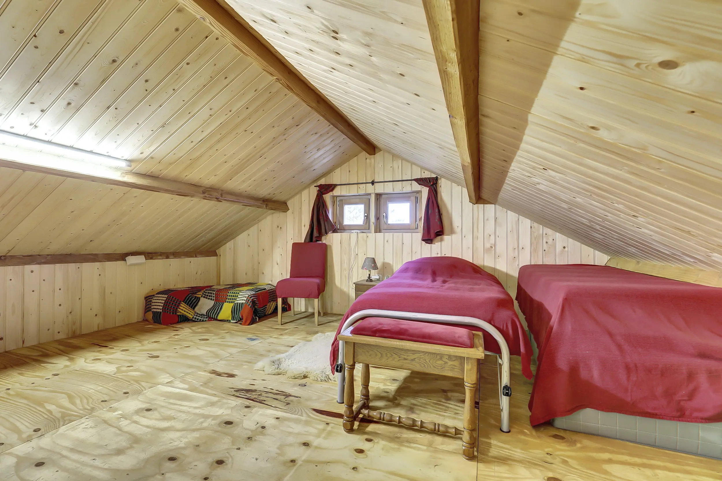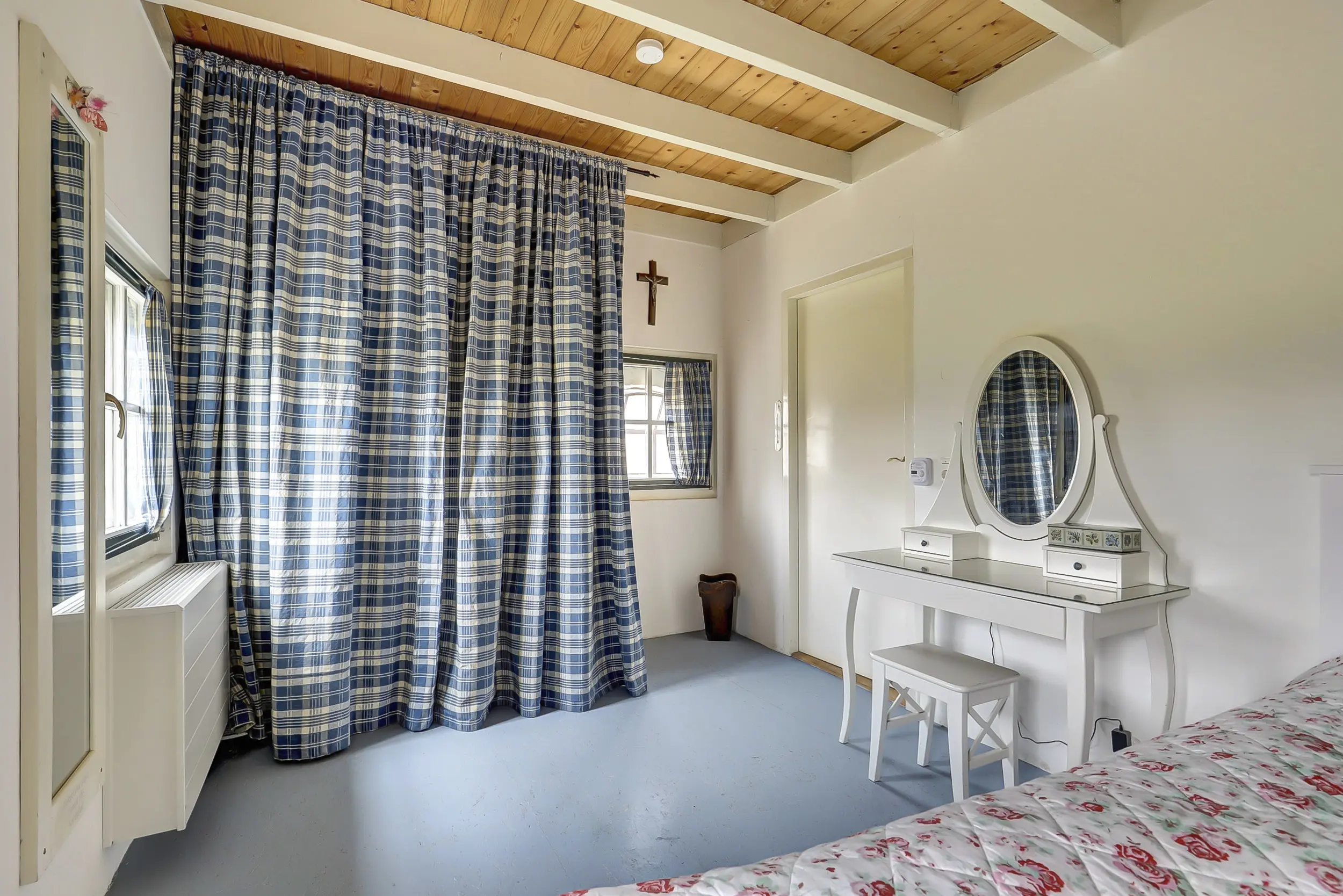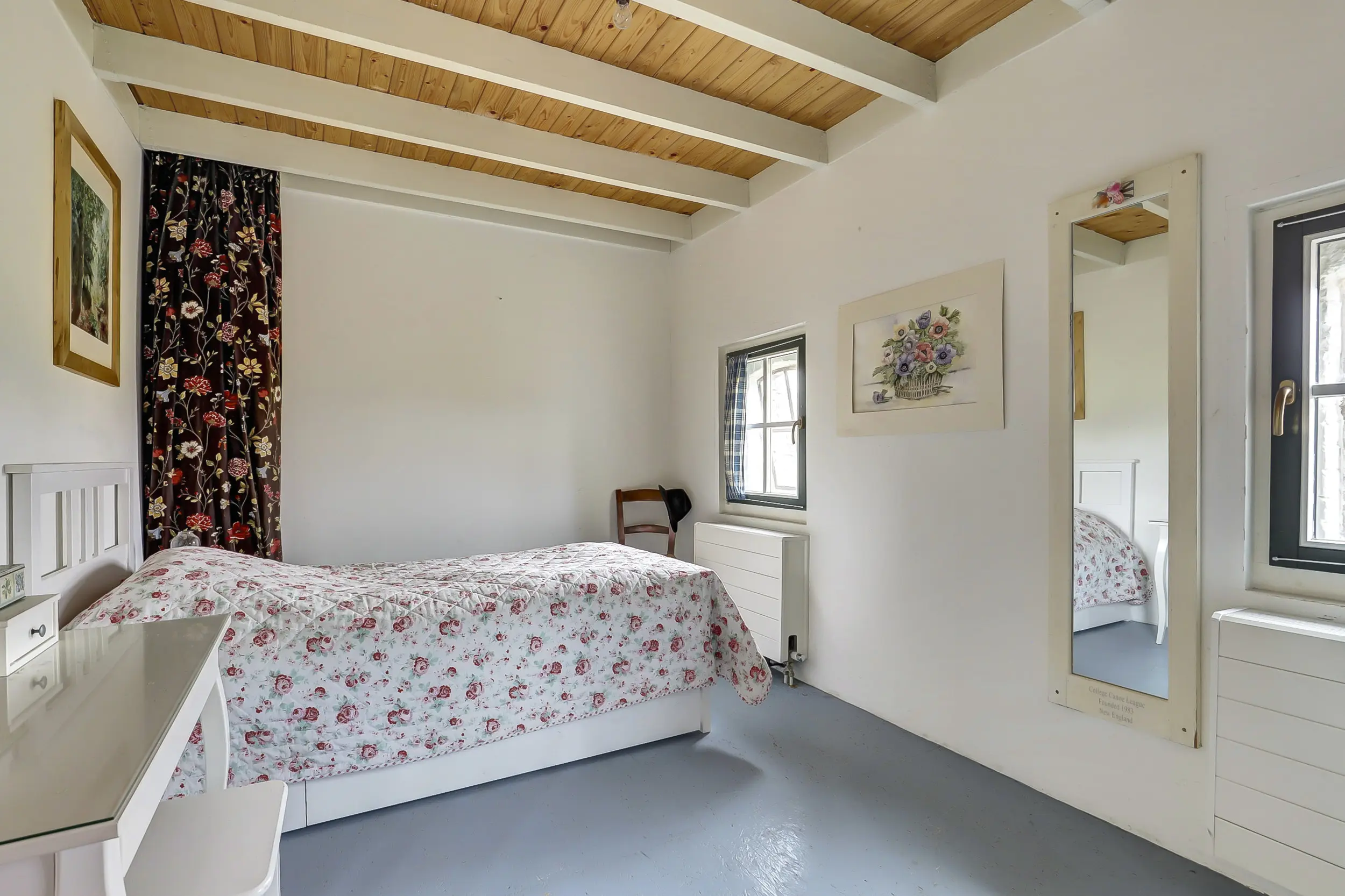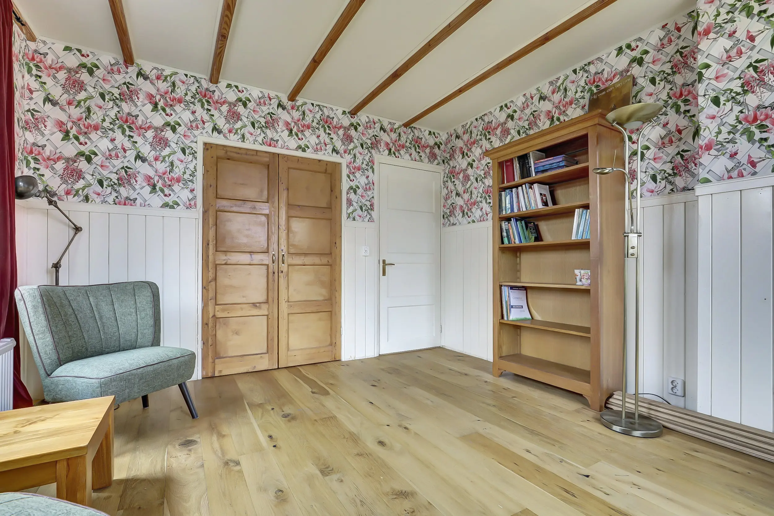 Deze kamer is ruim en afgewerkt met een houten vloer met vloerverwarming. Er is een grote vaste kast aanwezig en via openslaande deuren is er toegang tot de achtertuin.