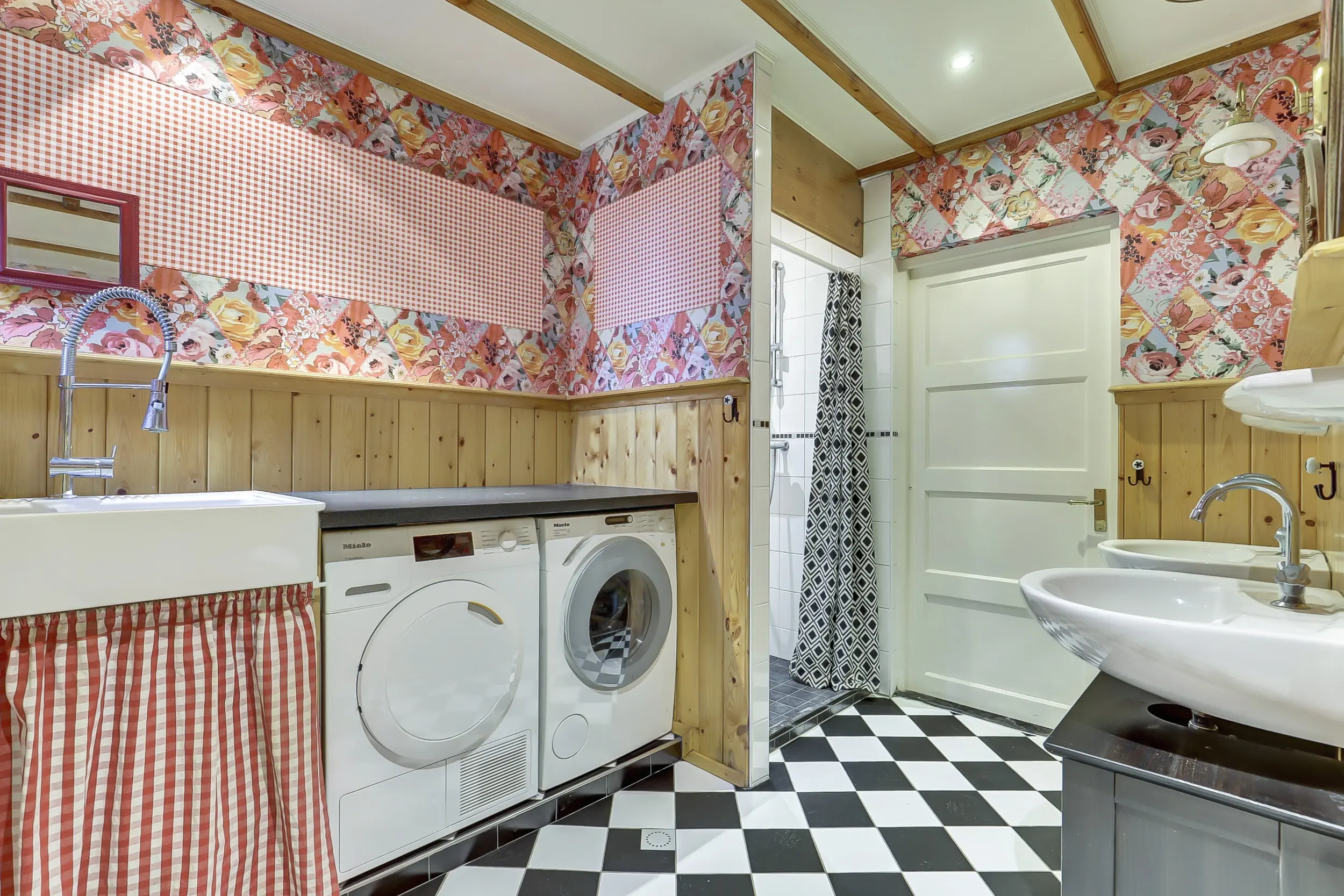 Tevens bevinden zich hier de aansluitingen voor de wasmachine en droger. Boven de apparatuur is een groot kunststof werkblad aangebracht. Ernaast zit een grote spoelbak, ideaal voor een handwas etc.