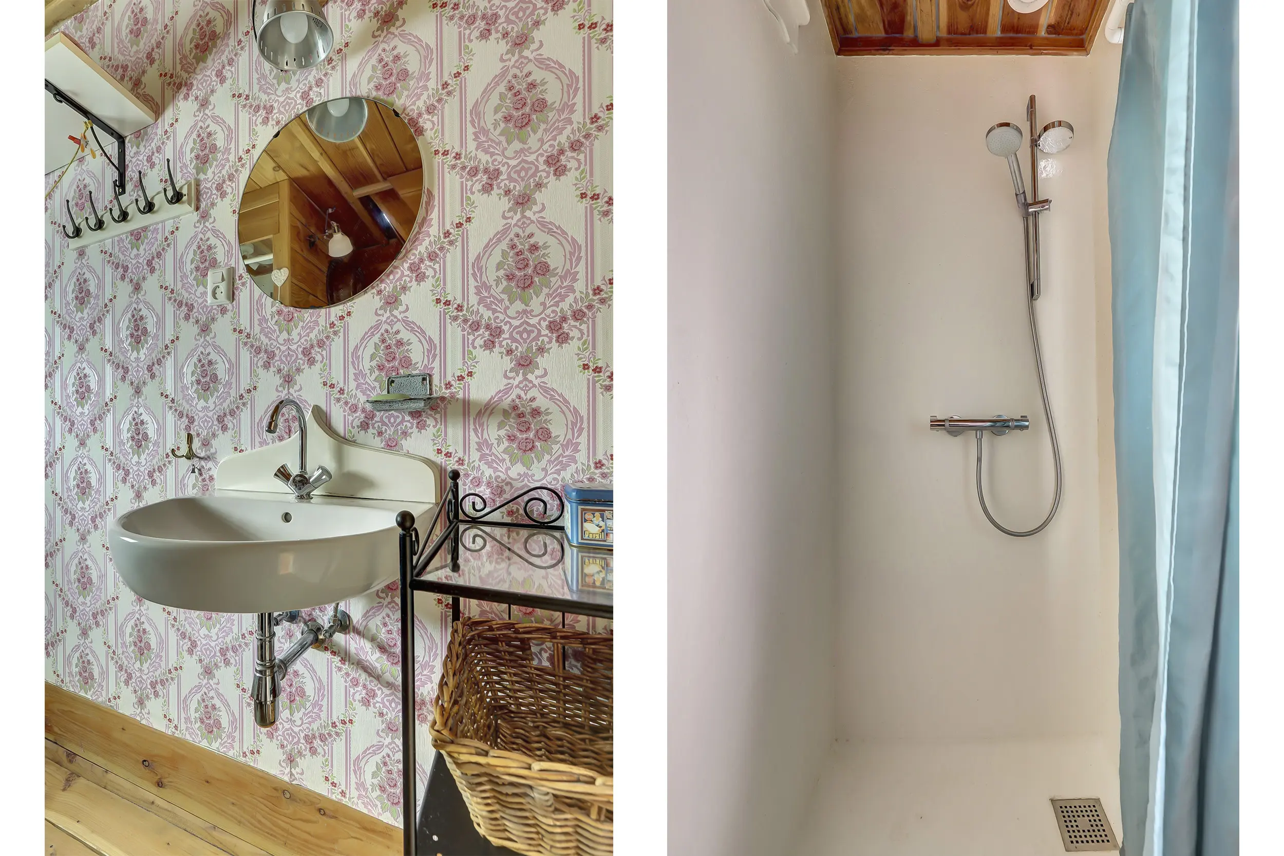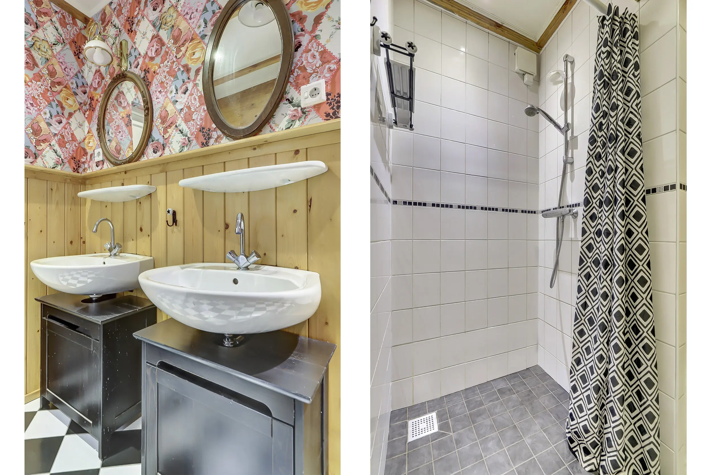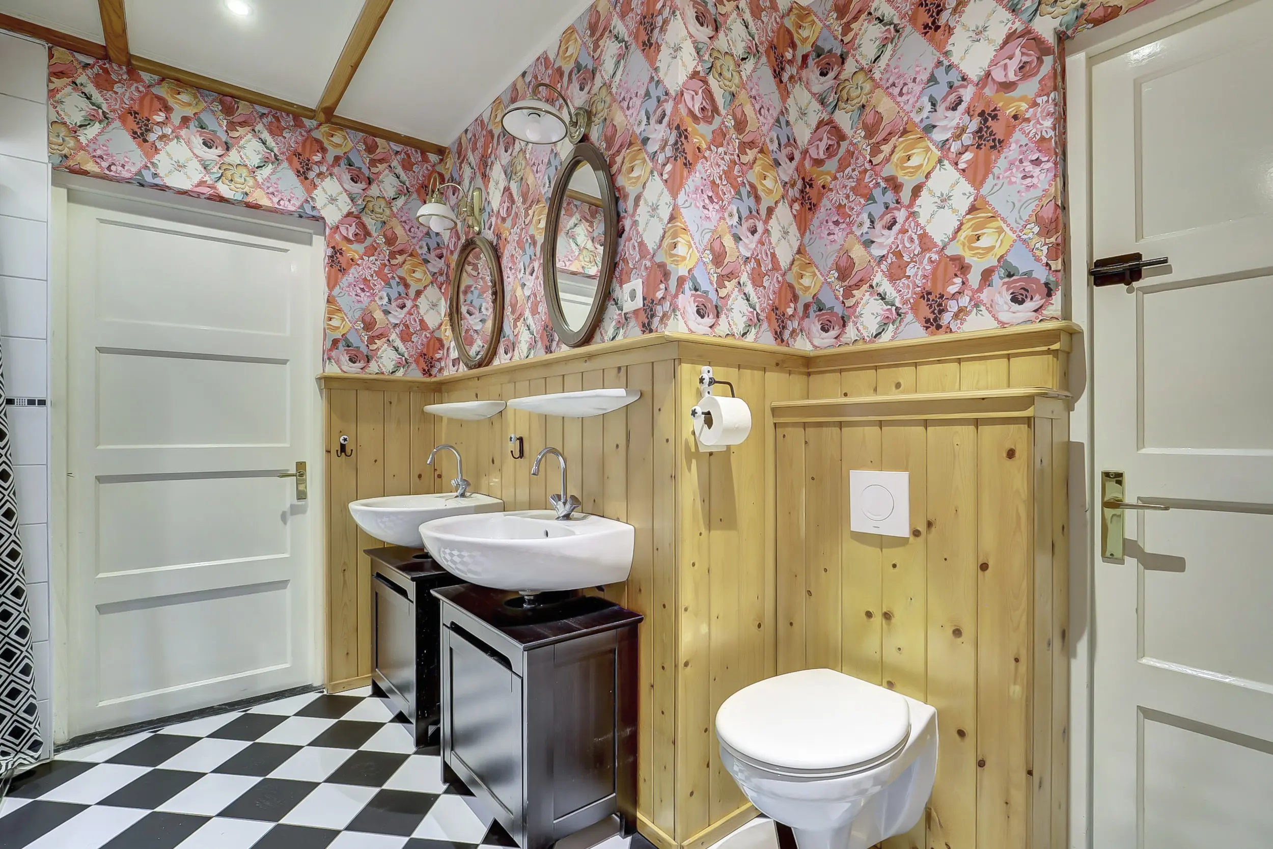 De sfeervolle badkamer is ruim en beschikt over een inloopdouche, 2 vaste wastafels met onderbouw en spiegel.