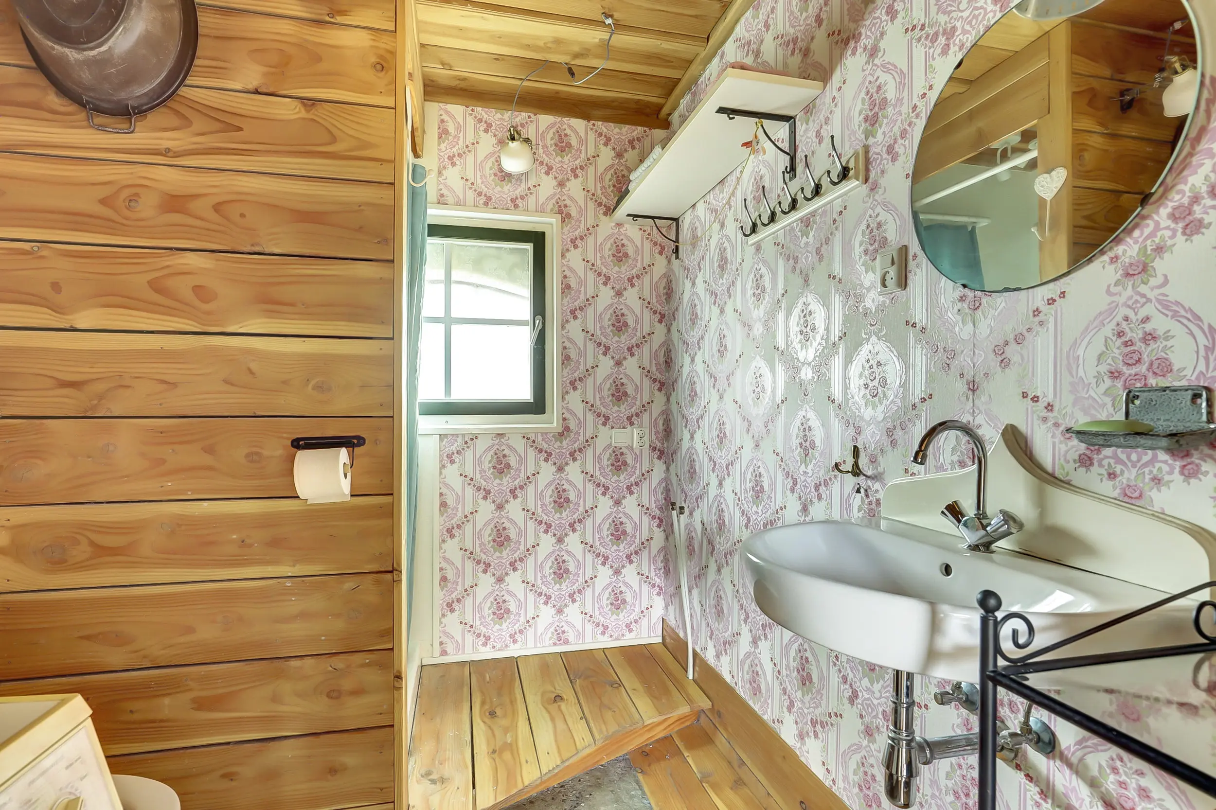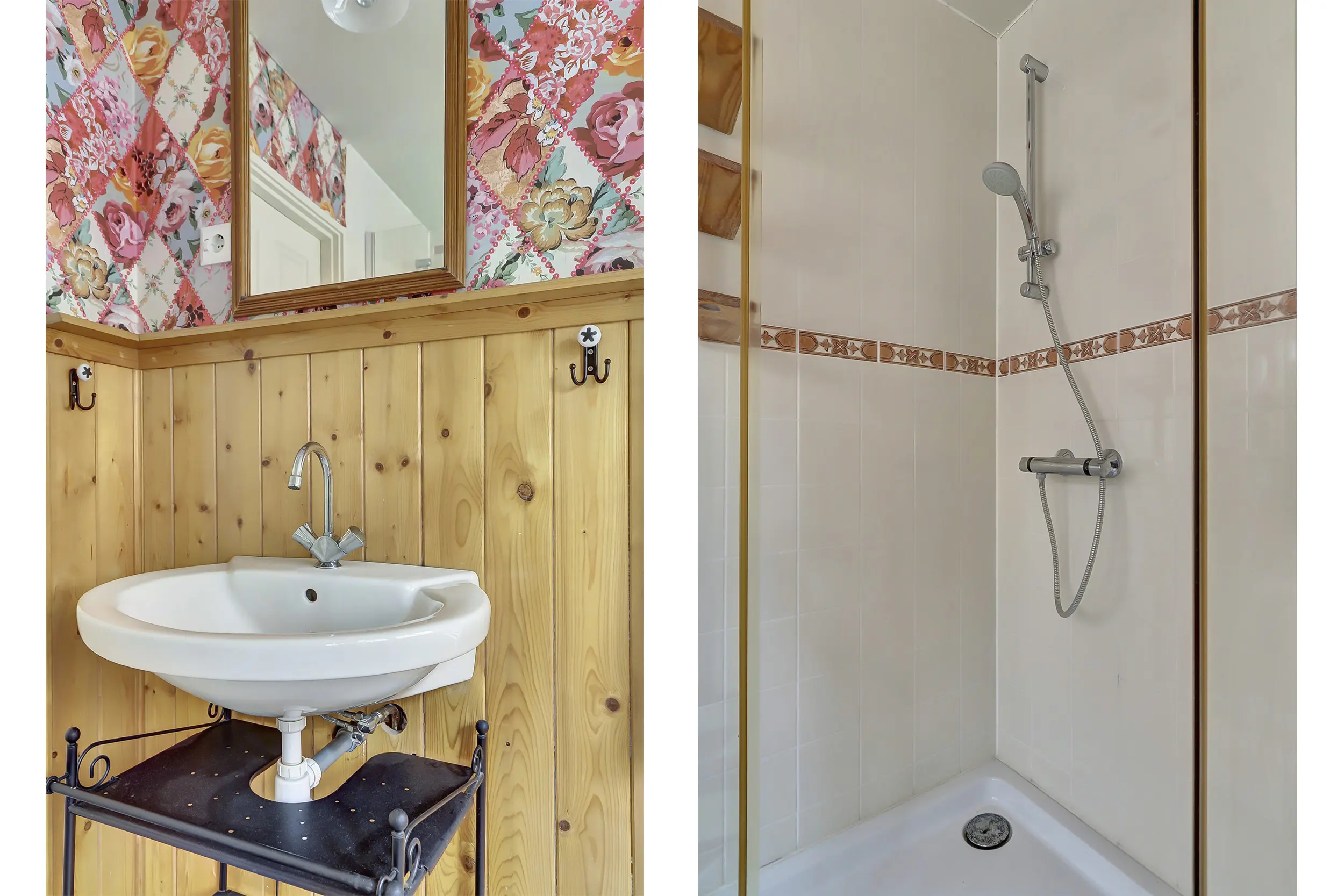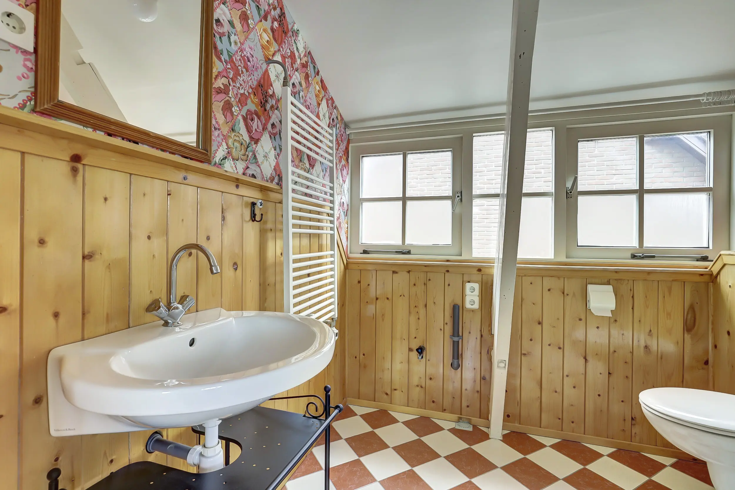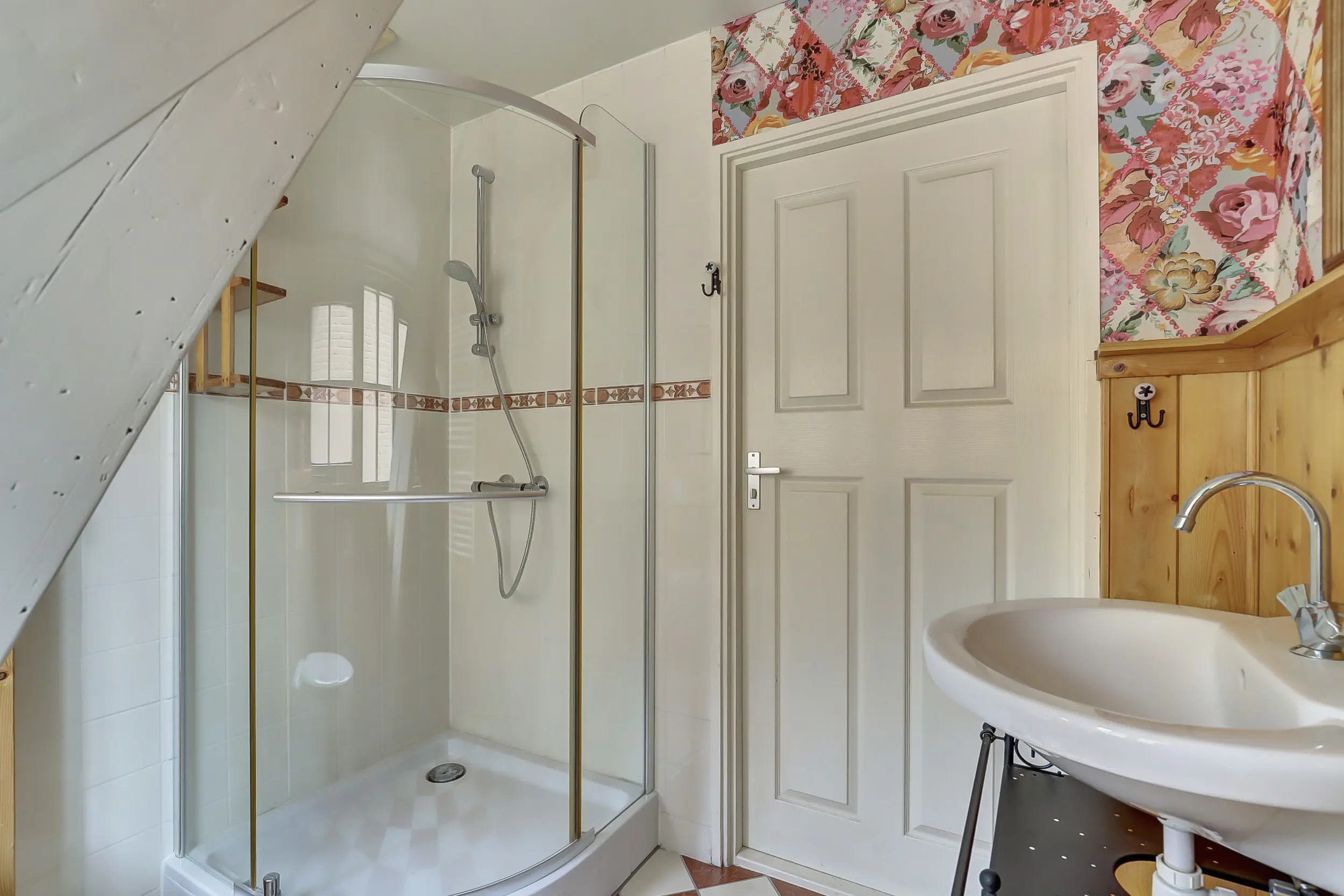 De sfeervolle badkamer is ruim en beschikt over een inloopdouche, 2 vaste wastafels met onderbouw en spiegel.