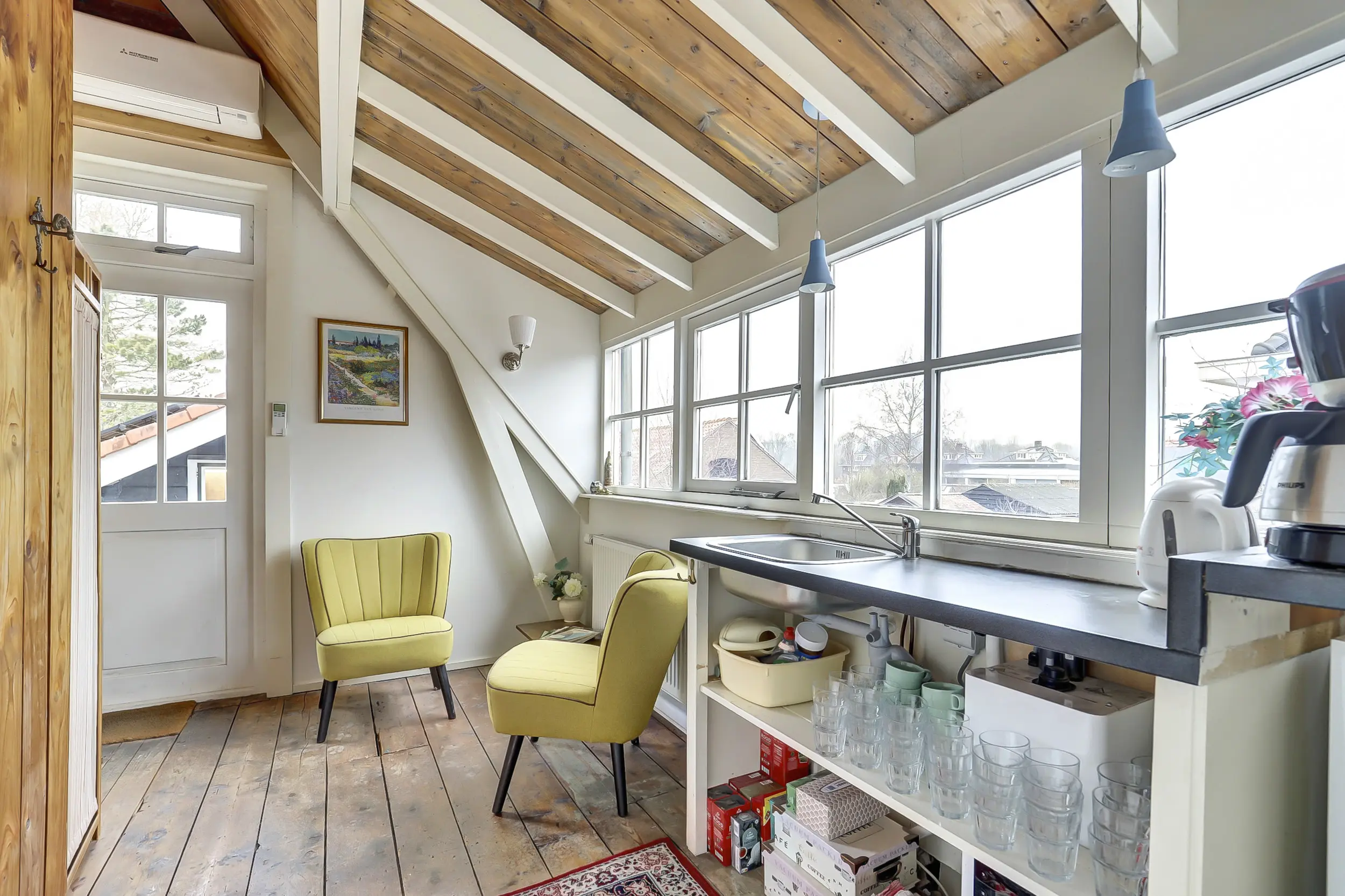 Het bijgebouw is sfeervol ingericht en biedt veel ruimte. Zo is de woonkamer heerlijk ruim en licht dankzij de vele raampartijen, de woonkeuken ruim en van alle gemakken voorzien en is er een slaapkamer met badkamer aanwezig.