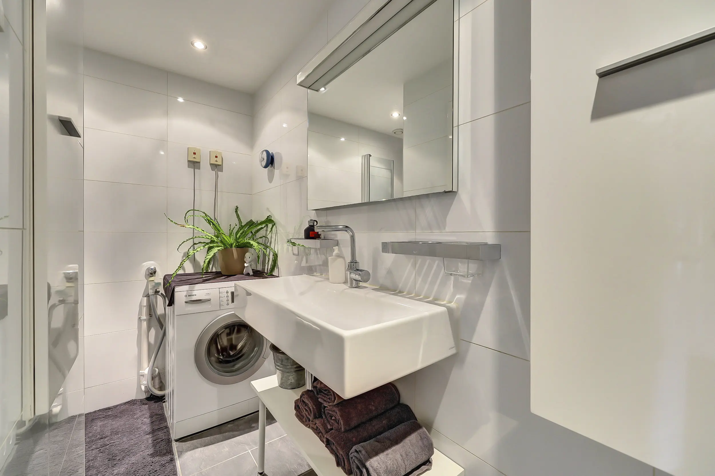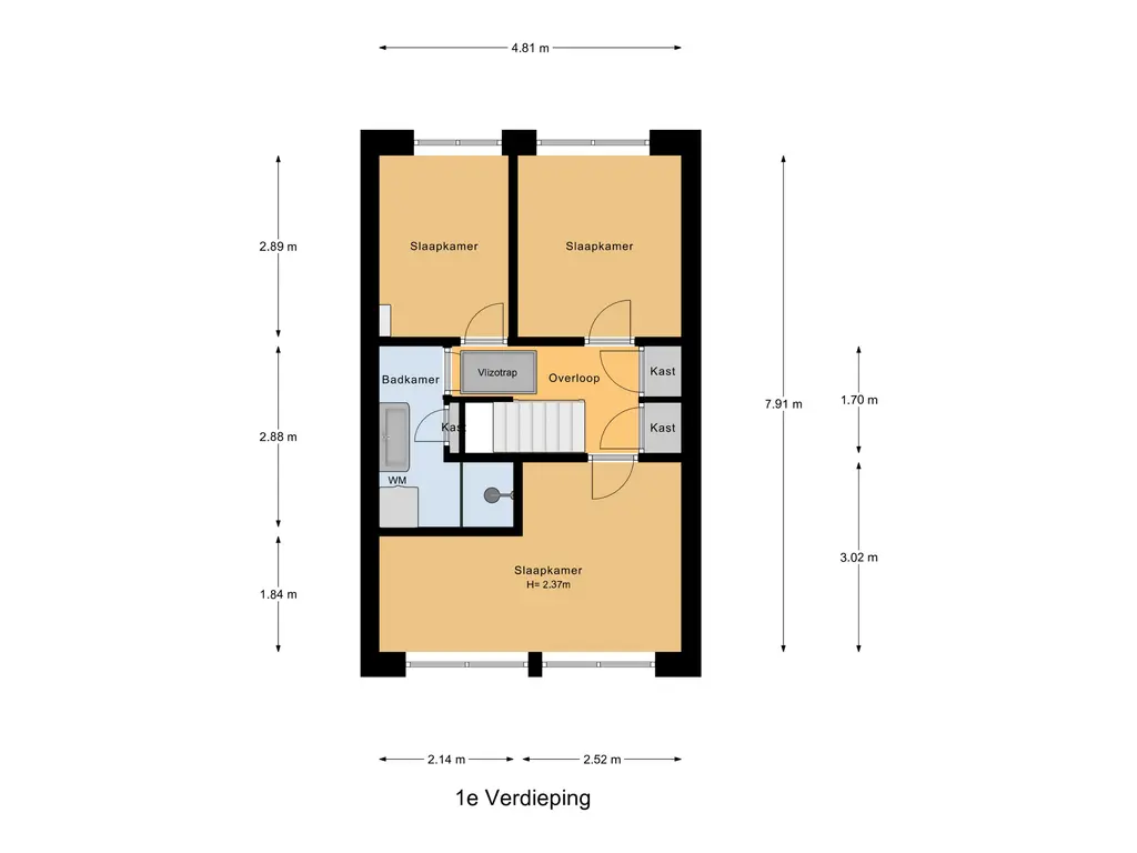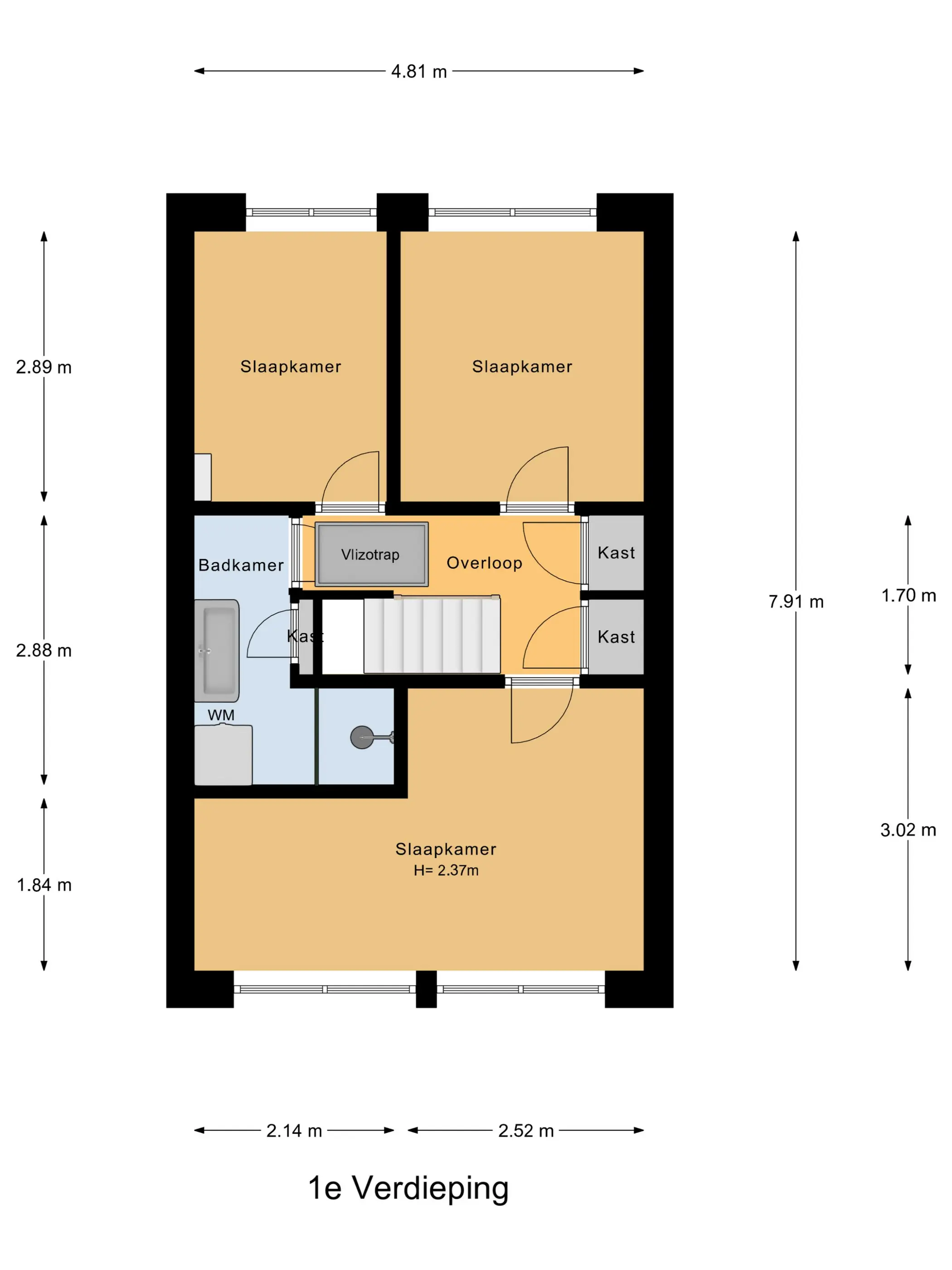 Op de eerste verdieping kom je via de trap op de overloop, waar twee handige inbouwkasten voor extra opbergruimte zorgen – perfect voor handdoeken, beddengoed of seizoenskleren. De badkamer is compact maar slim ingedeeld: er is een wastafel met meubel, een aansluiting voor de wasmachine en droger en “om de hoek” een nette douchecabine. Praktisch, efficiënt en netjes afgewerkt. Een ruime slaapkamer aan de achterzijde en twee goede slaapkamers aan de voorzijde van deze woning maken dit een prima gezinswoning!