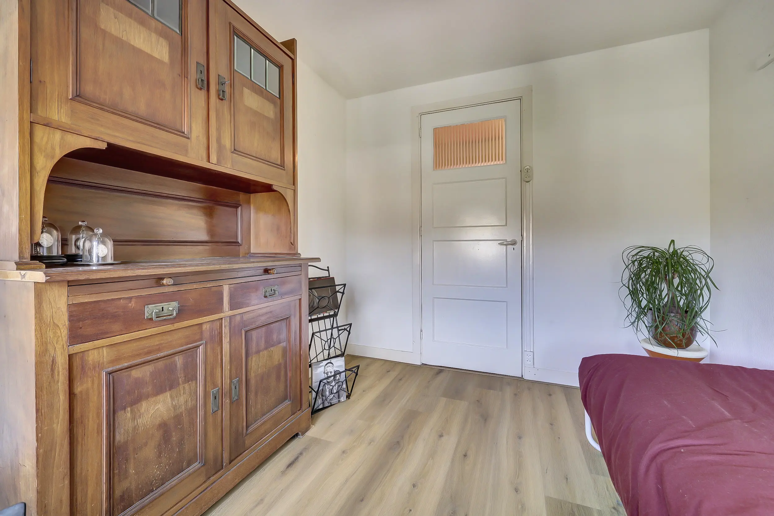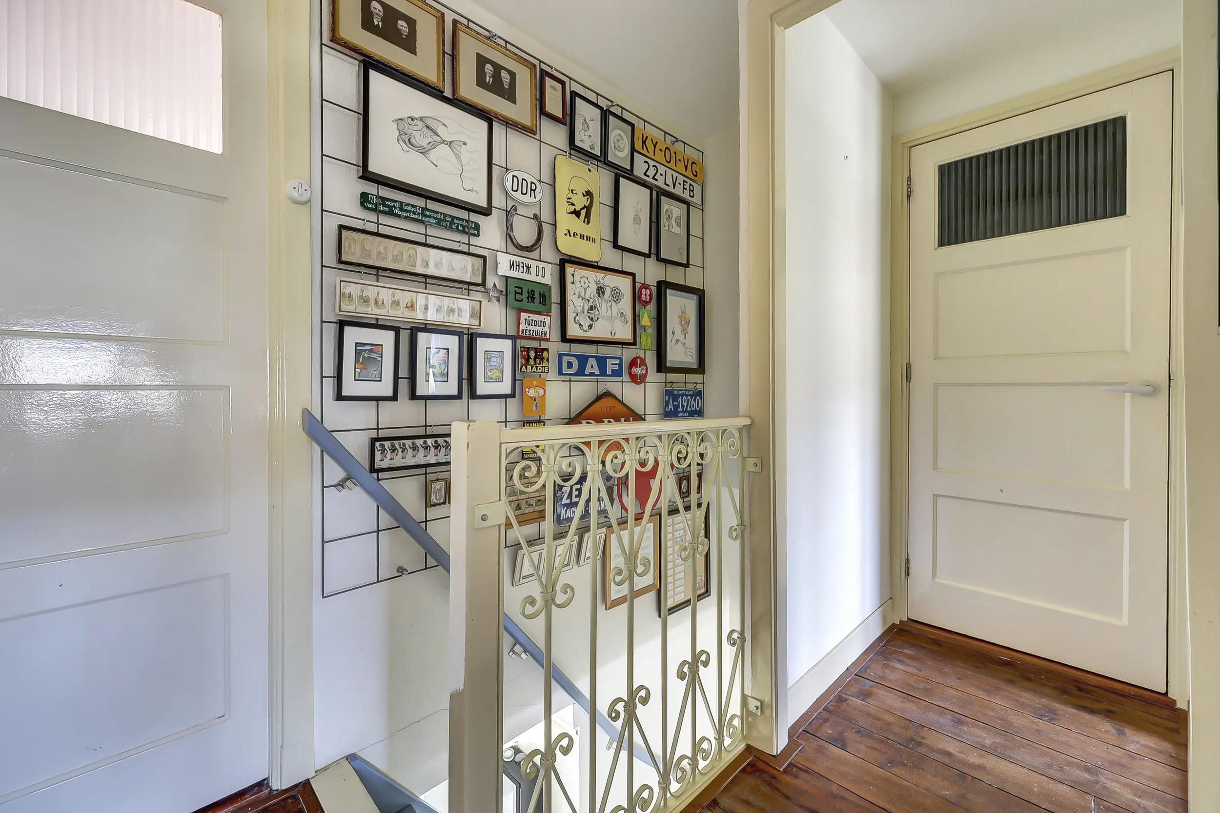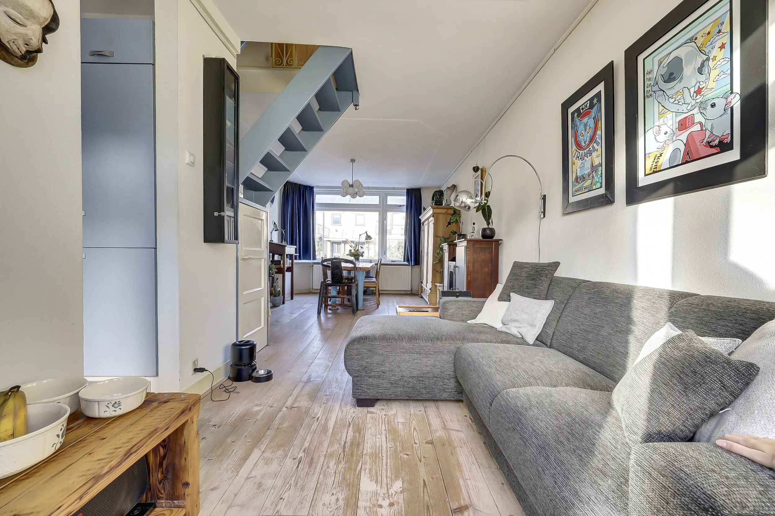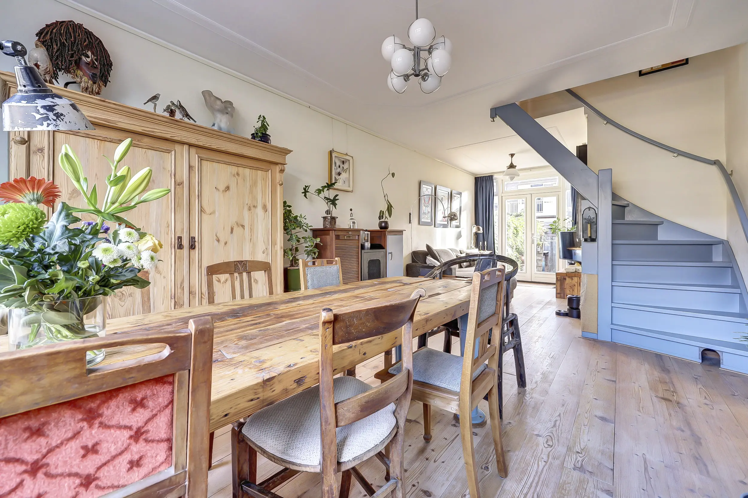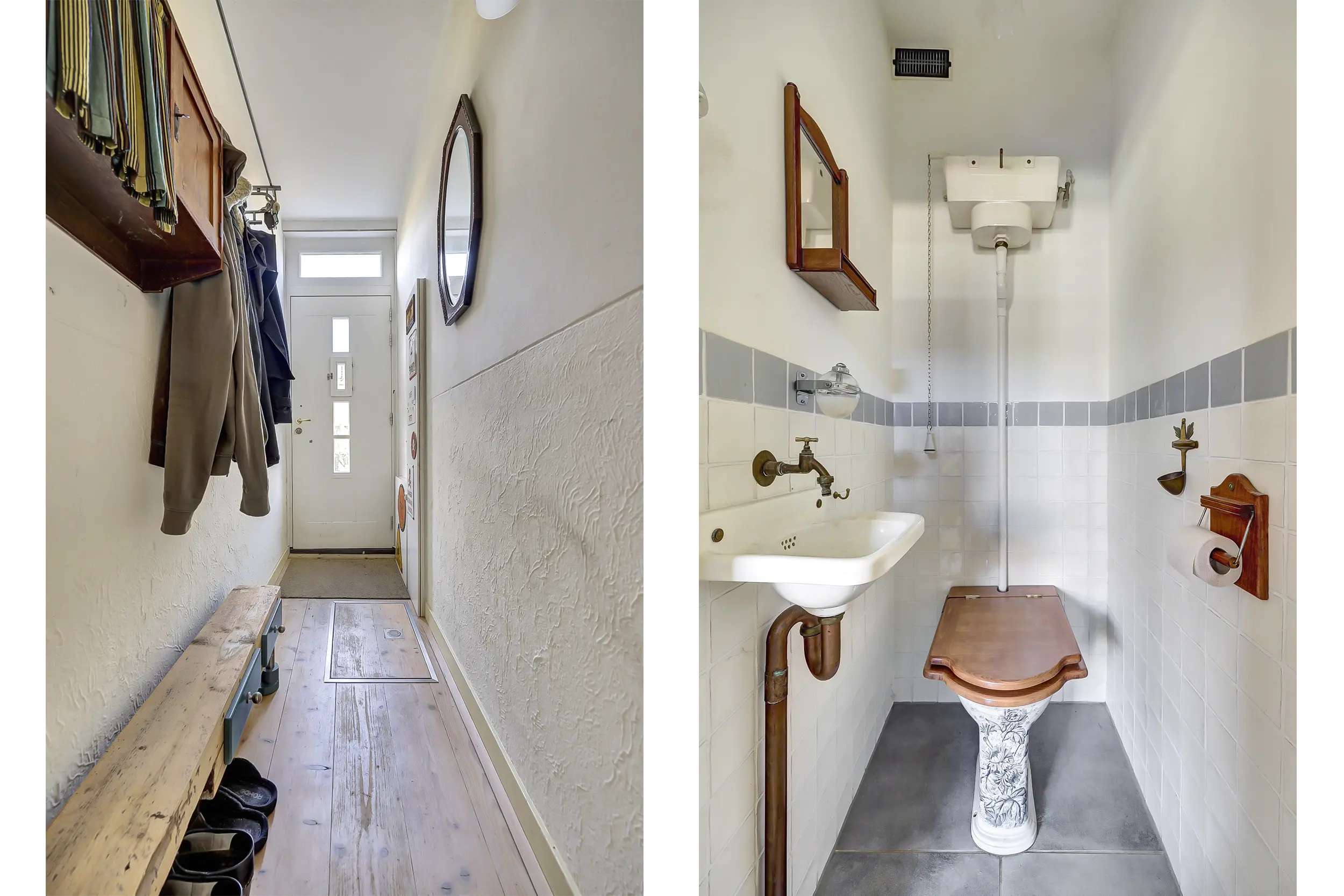 Via de nette entree stap je binnen in deze woning. Aan het einde van de hal bevindt zich een klassiek toilet met hoge stortbak – karaktervol en verrassend sfeervol. De woonkamer straalt licht en comfort uit, mede dankzij de prachtige erker die extra daglicht binnen laat stromen. Overal in huis vind je HR++ dubbel glas; dat zorgt niet alleen voor comfort en rust, maar ook voor goede isolatie. Onder de trap is een slimme bergkast ingebouwd – ideaal voor schoenen, jassen of schoonmaakspullen.