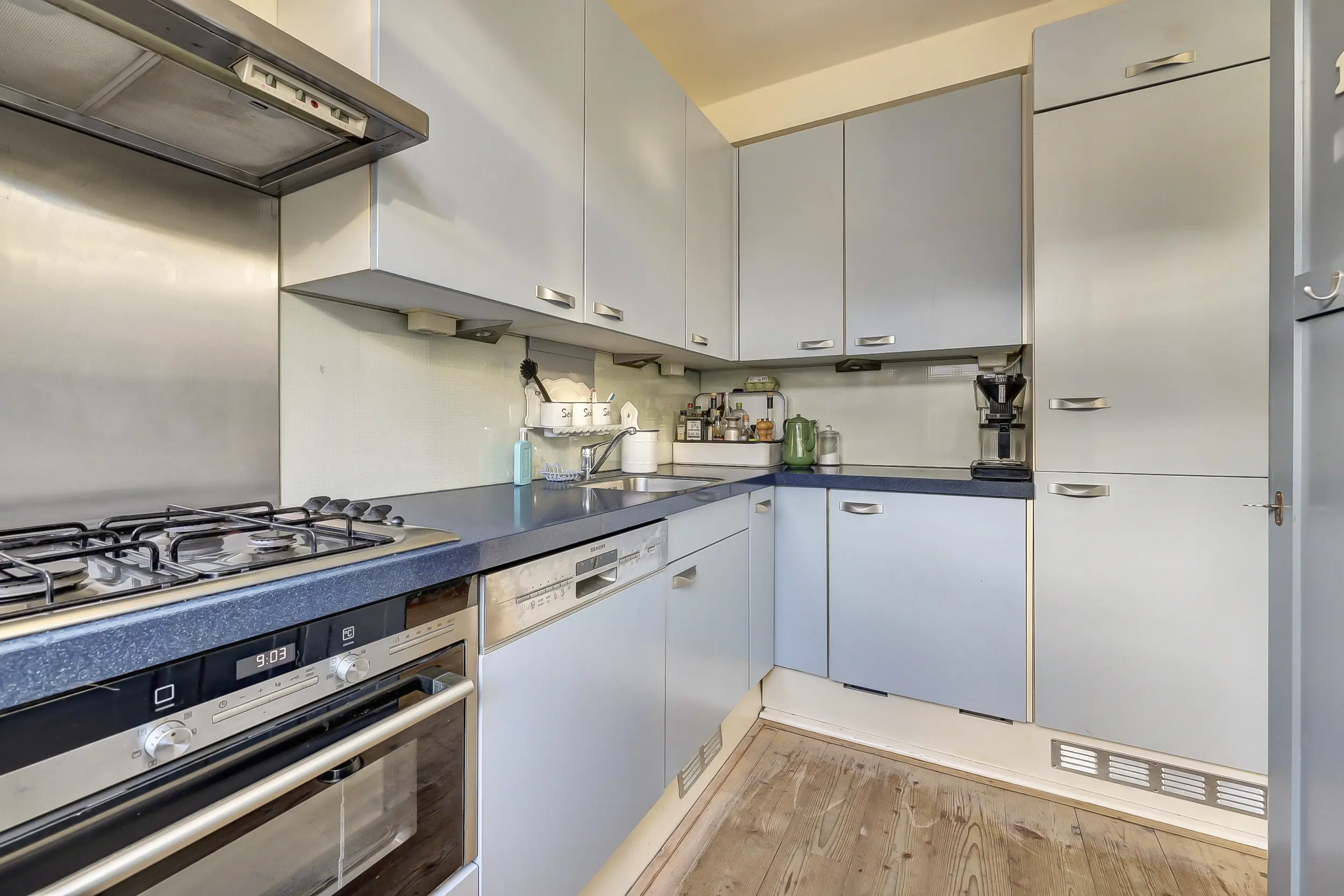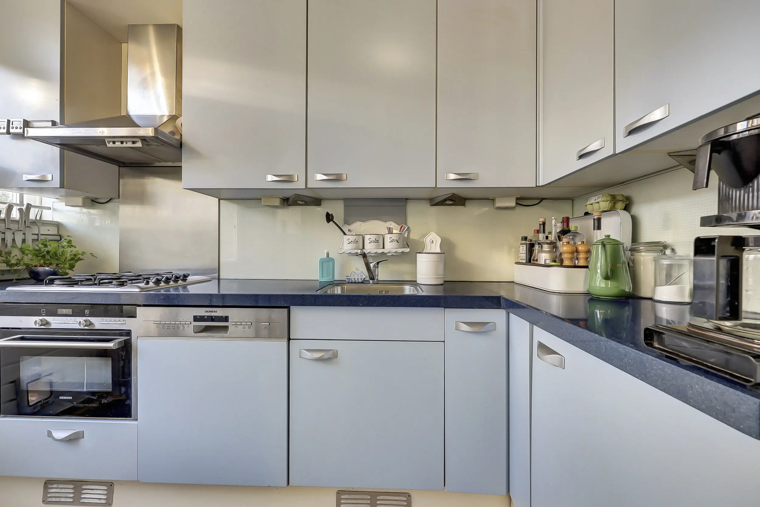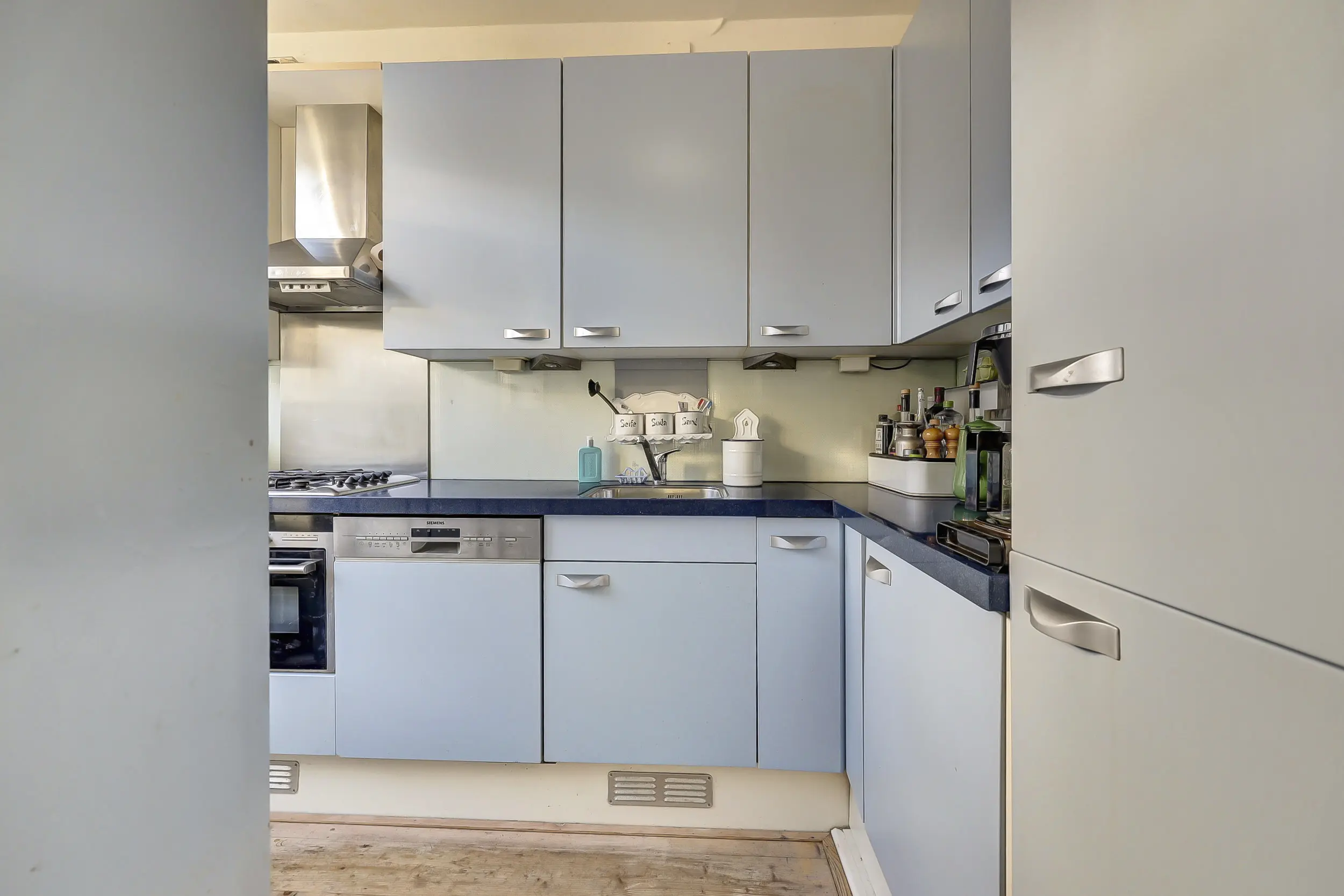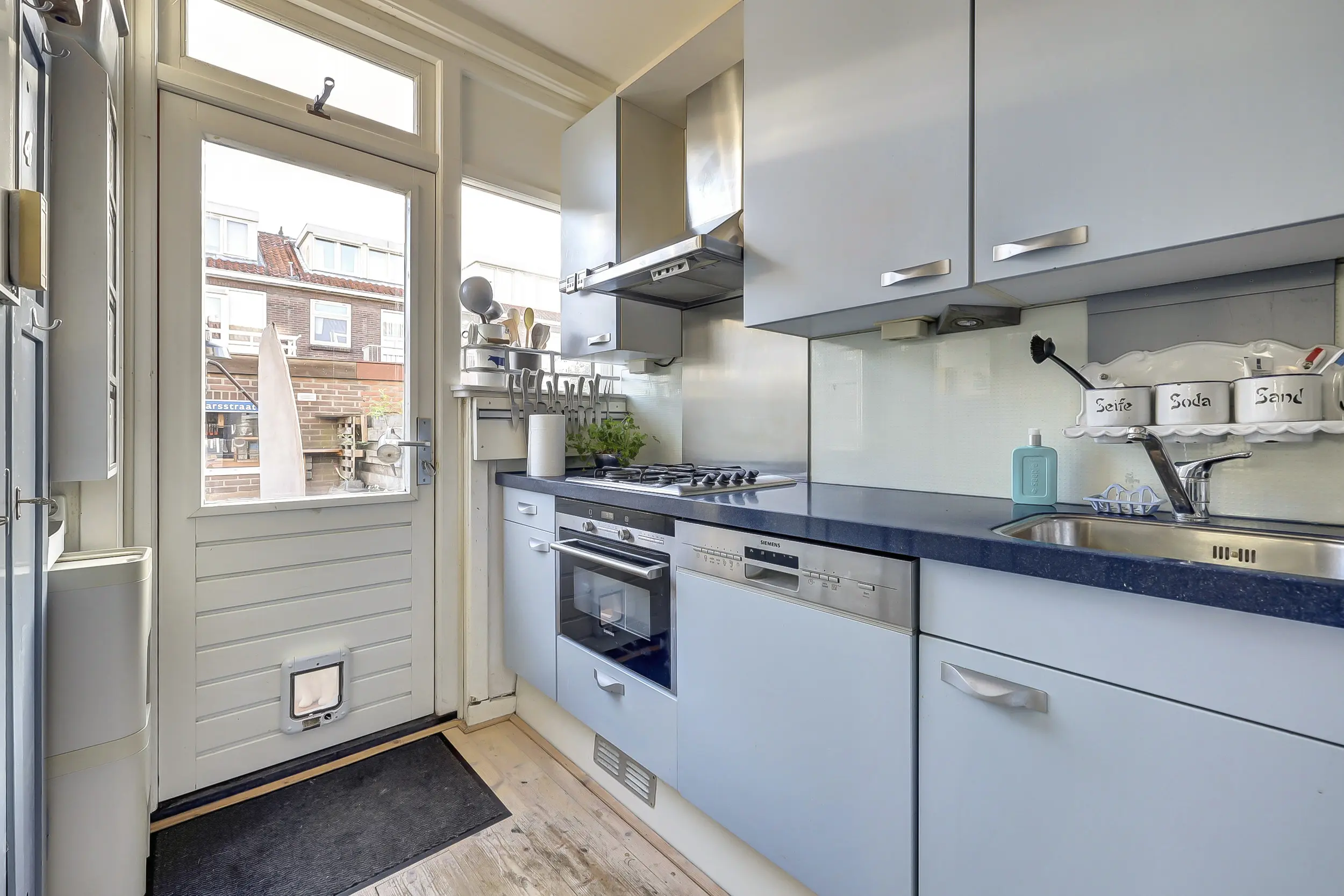 De keuken is half open opgezet en ligt in een hoekopstelling, voorzien van degelijke apparatuur zodat koken hier geen opgave maar een plezier is. Via de keuken wandel je naar buiten, maar ook via de dubbele openslaande deuren in de woonkamer bereik je de achtertuin op het Noord-Oosten. Tijdens zonnige zomerdagen klap je die deuren lekker open om de tuin bij je woonkamer te betrekken en te kunnen genieten van de buitenlucht.